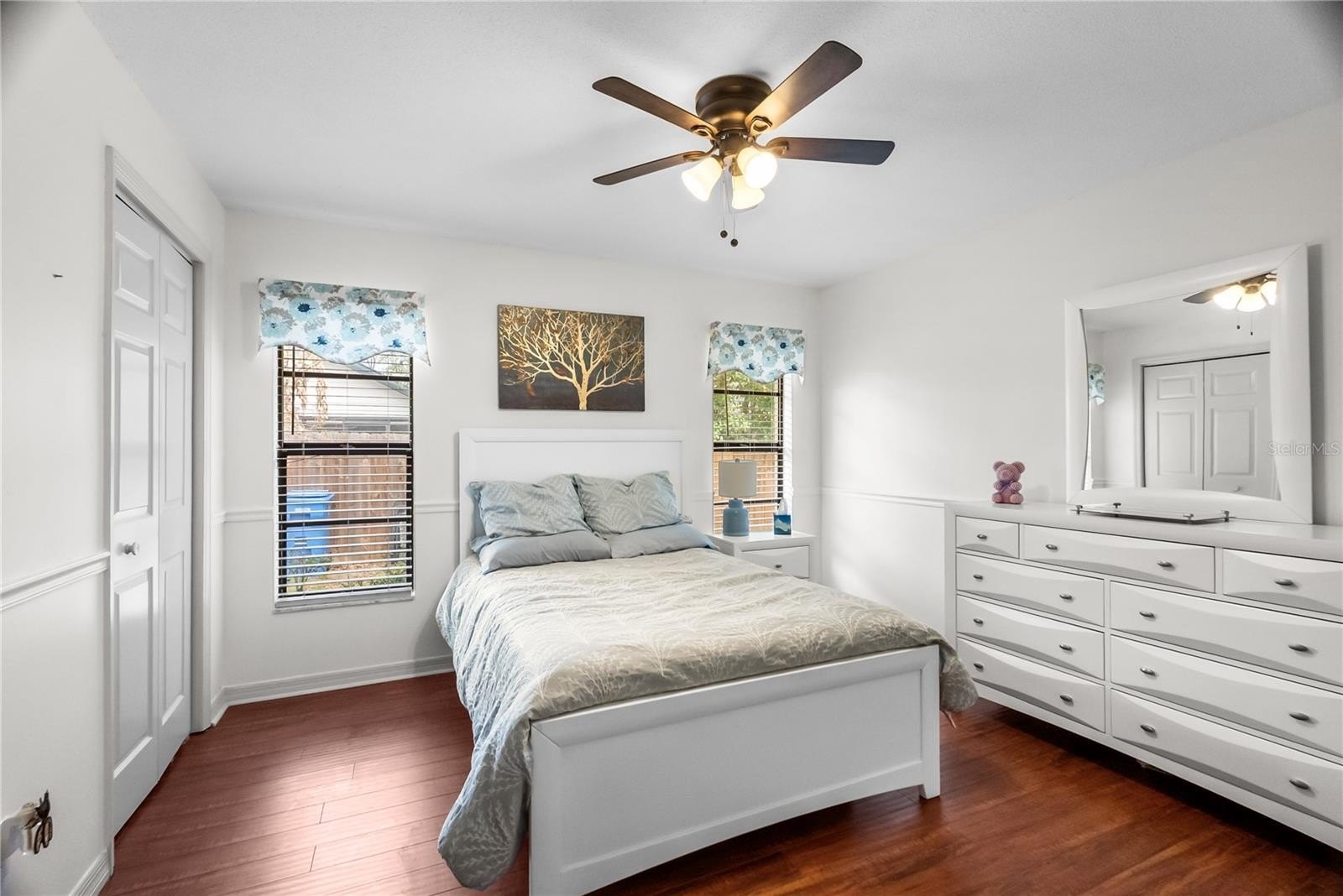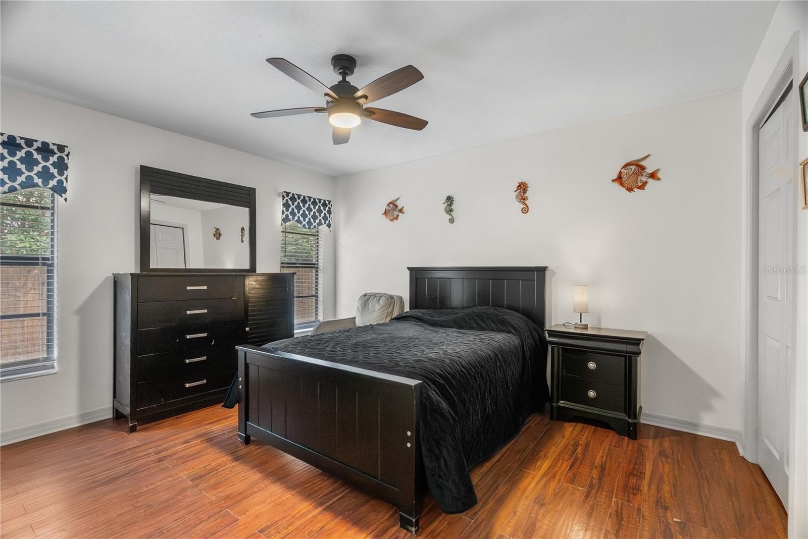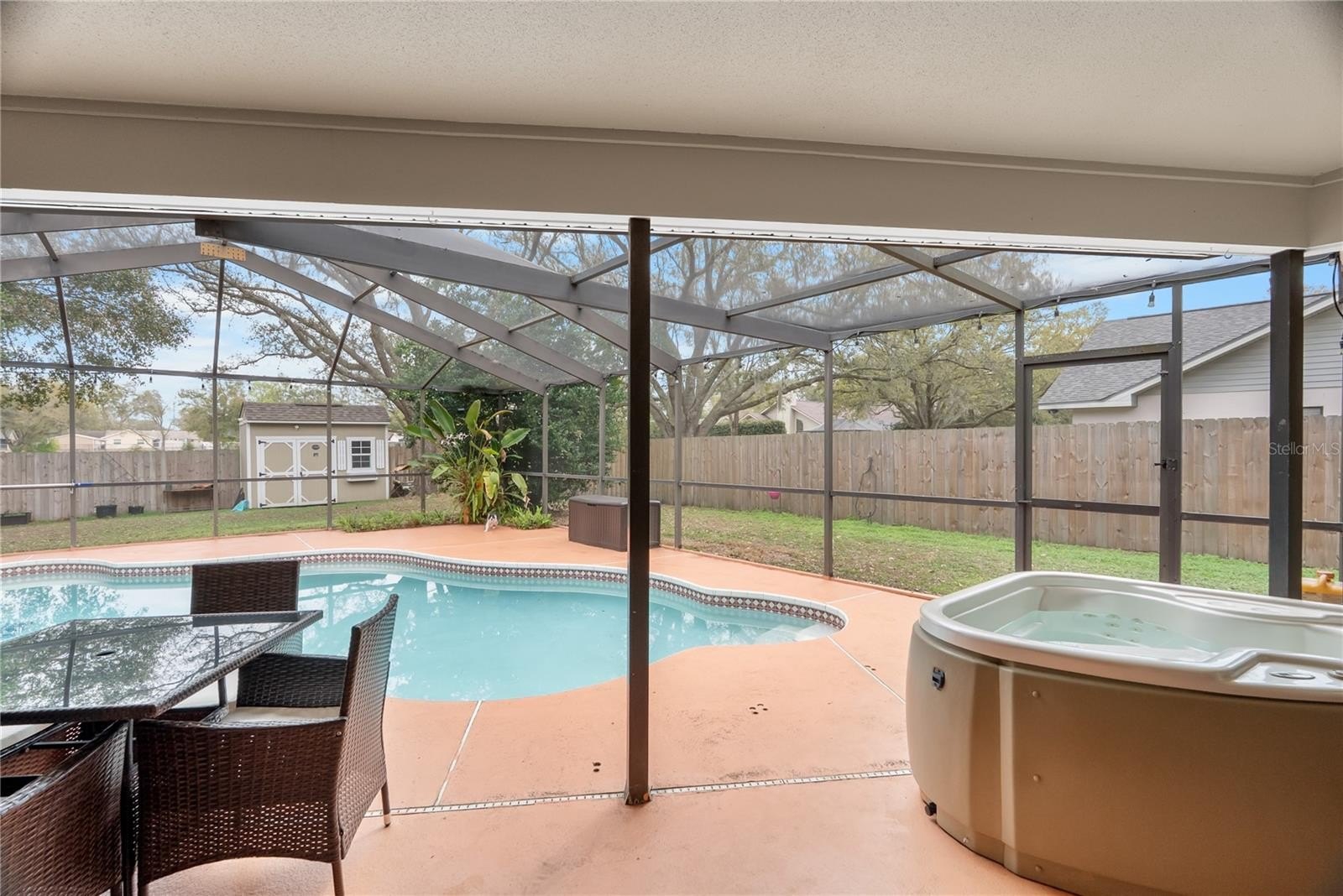 Make this beautiful 4-bedroom, 2.5-bath home yours! This spacious property offers incredible updates and room for everyone, with many major systems and appliances updated within the last 1–3 years. Every bedroom is generously sized and large enough to comfortably fit a king-size bed. Inside, you'll love the no-carpet flooring throughout, making maintenance easy and perfect for everyday living. Step outside to your private oasis featuring a screened lanai, pool, and hot tub — the perfect space to relax or entertain guests year-round. The large backyard offers plenty of room for children to play or pets to roam freely. There is also a detached shed that provides additional flexibility and could be used as a workshop, or storage space. The updated kitchen, remodeled in 2022, features beautiful quartz countertops with bar seating and newer appliances, creating a modern and functional space for cooking and gathering. The home also features a cozy wood-burning fireplace and ceiling fans in every room for added comfort. The primary suite is a private retreat with high ceilings, sliding doors that lead to the lanai, dual closets, and a luxurious en-suite bathroom complete with separate vanities, a jetted soaking tub, and a walk-in shower. On the opposite side of the home, three generously sized bedrooms share a full bathroom, offering a great layout for families or guests. Additional updates include kitchen appliances and washer and dryer in 2022, HVAC in 2022, hot water heater in 2024, a new fence installed in 2022, roof replaced in 2020, and the exterior of the home freshly painted in 2025. All of this comes with low HOA fees of just $125 annually, making this home an incredible opportunity to enjoy space, comfort, and modern updates.
