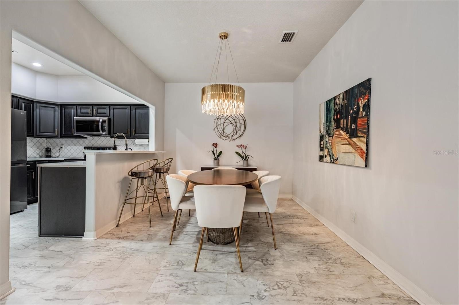 Step inside and you’re welcomed by the first of two living areas, filled with natural light and highlighted by tall ceilings and updated luxury vinyl flooring. A convenient half bath is located just off the entry. The updated kitchen is designed for both everyday living and entertaining, featuring stainless steel appliances, quartz countertops, ample cabinetry, and a seamless flow into the dining space.