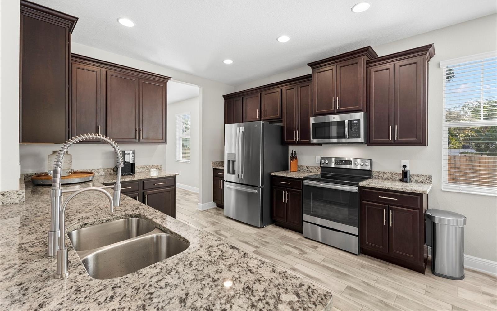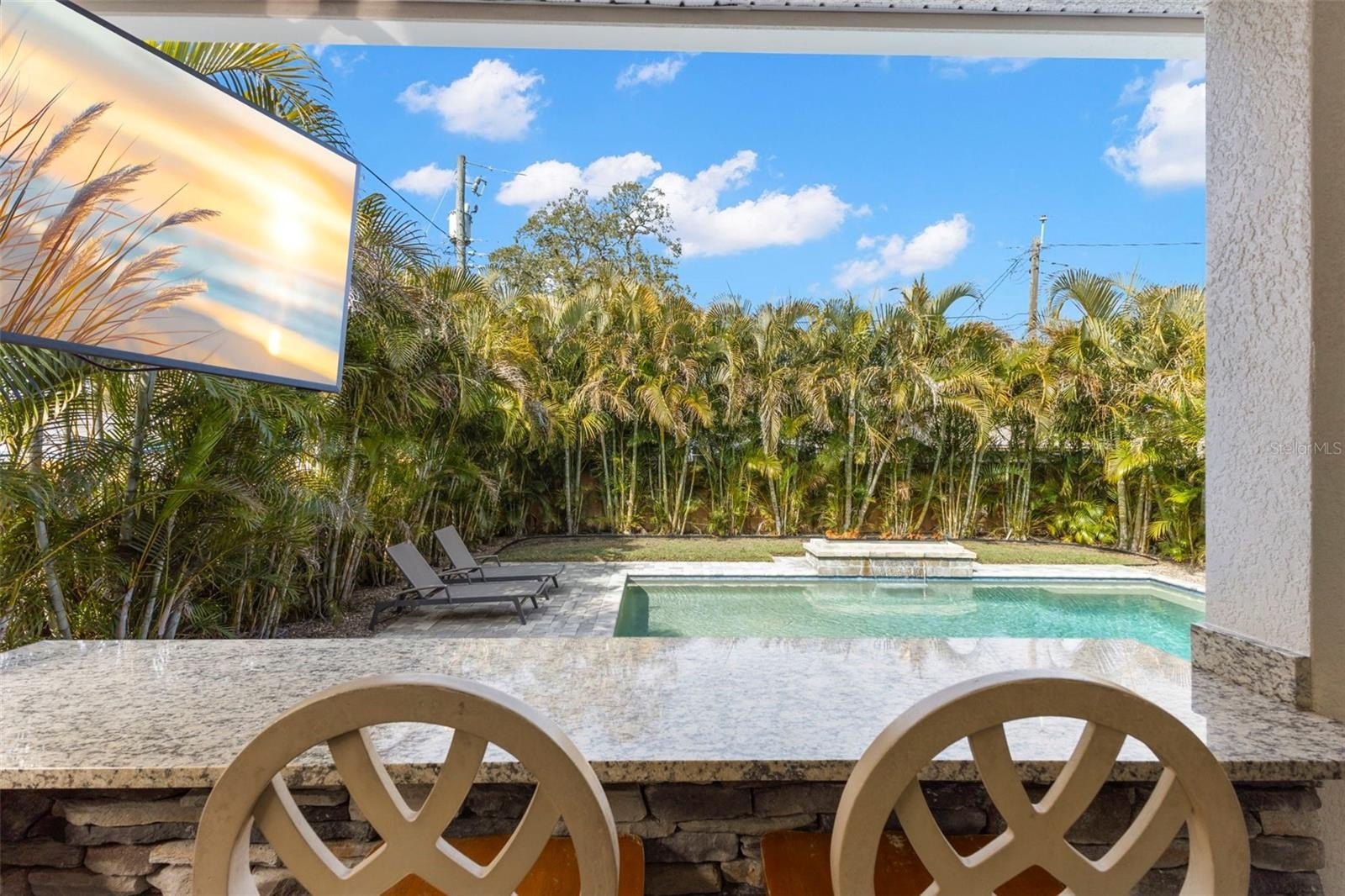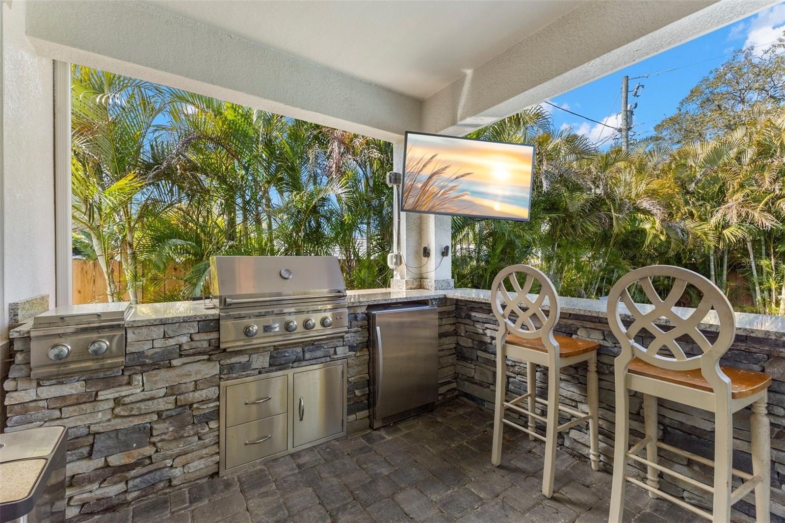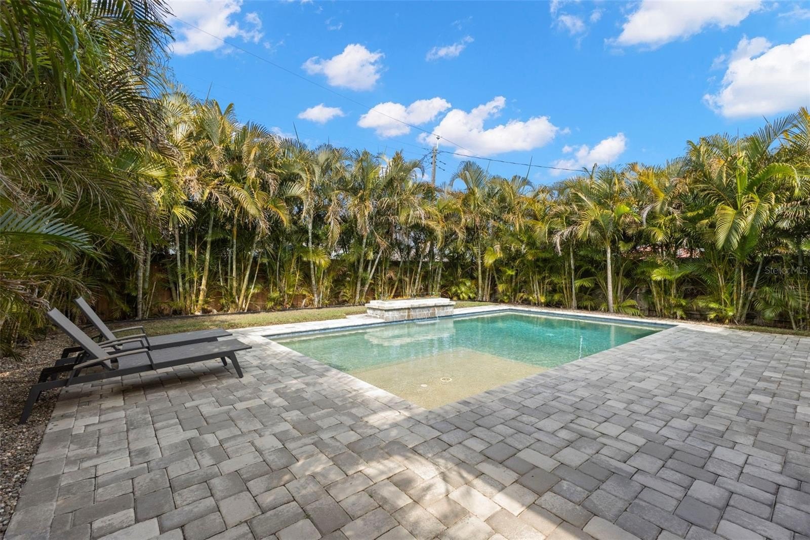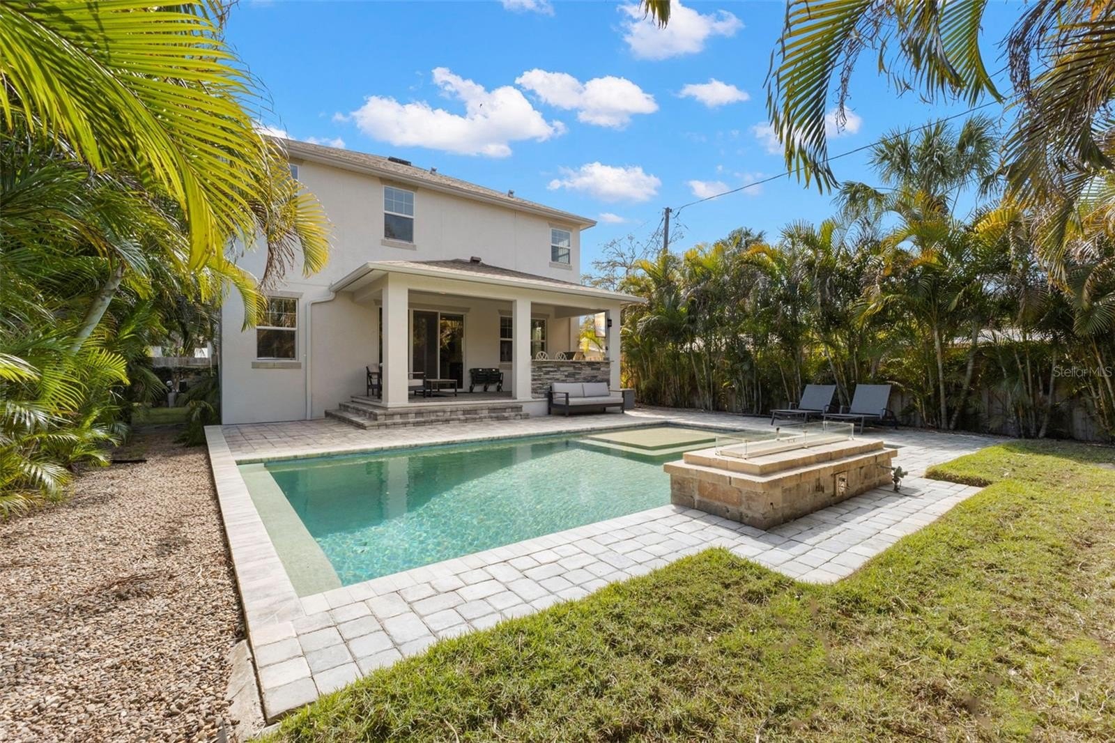 One or more photo(s) has been virtually staged. This stunning newer construction home is a true masterpiece located just a stone's throw from Walter Fuller Park with its expansive pool, recreation center, sports complex, tennis/pickleball courts, fields, and more. Curb appeal shines with a brick paver driveway, elegant stone-finished exterior, mature tropical landscaping/majestic oak tree, and a welcoming covered front porch. Step inside to an open, light-filled layout boasting high ceilings, recessed lighting, wood blinds throughout, ceiling fans with decorative lighting, and beautiful wood-look tile floors in living areas. The oversized formal dining room offers ample space for an additional seating area with views of the front yard. The gourmet kitchen features granite countertops, breakfast bar, double undermount sink, stainless-steel appliances, closet pantry, and an eat-in space overlooking the Great Room and pool with sliding doors to the covered lanai. A guest suite on the first floor provides convenience with easy access to a hall bathroom. Upstairs, enjoy a split bedroom floor plan plus a versatile BONUS room/flex space ideal for a playroom, den, or office. The resort-style owner's suite is a true retreat complete with double entry doors, tray ceilings, dual vanities, garden tub, stand-up shower, separate water closet, linen closet, and an oversized walk-in closet with custom built-in organizers. An inside utility room on the second floor includes cabinets for extra storage and an ironing station. Entertain effortlessly in the incredible backyard tropical oasis with a covered lanai with an outdoor kitchen equipped with refrigerator, gas grill, and side burners, plus a gas fireplace that spills over to the sparkling pool with sun shelf. Enjoy privacy with the Areca Palm hedges, and your favorite game or movie on the flatscreen TV. Additional highlights include a wood privacy fence, hurricane shutters for peace of mind, security cameras, two-car garage with Tesla charging station including PowerShare capability, attic pull-down access, decorative wall cut-outs for artwork and so much more. This exceptional home blends modern luxury, tropical vibes, thoughtful details, and prime location central to beaches and all that St. Pete has to offer. Start Living Today!