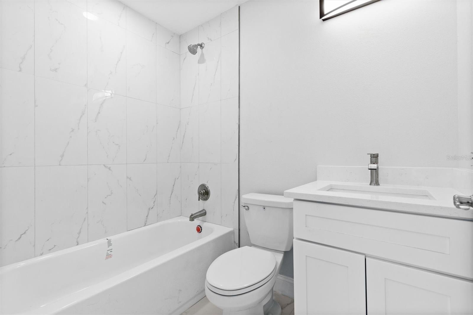quartz countertops with a tiled backsplash, a spacious pantry, and stainless steel appliances including a range, microwave, dishwasher, stovetop with hood, and refrigerator. The bathrooms continue the home’s upscale feel with cabinets, quartz countertops, a luxurious walk-in shower,