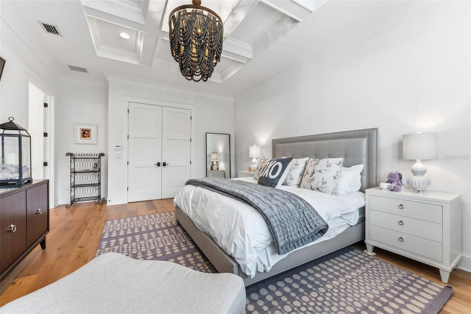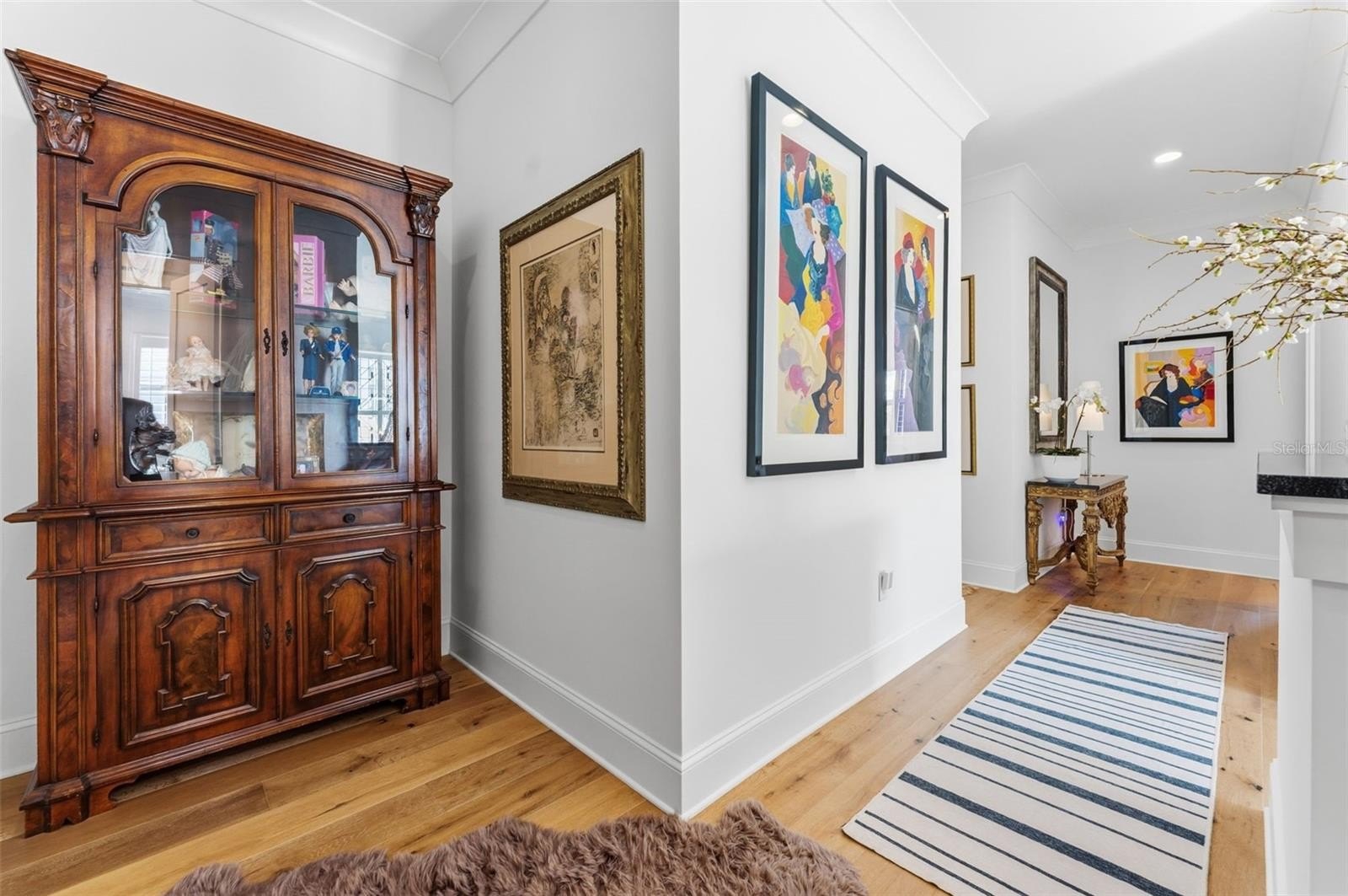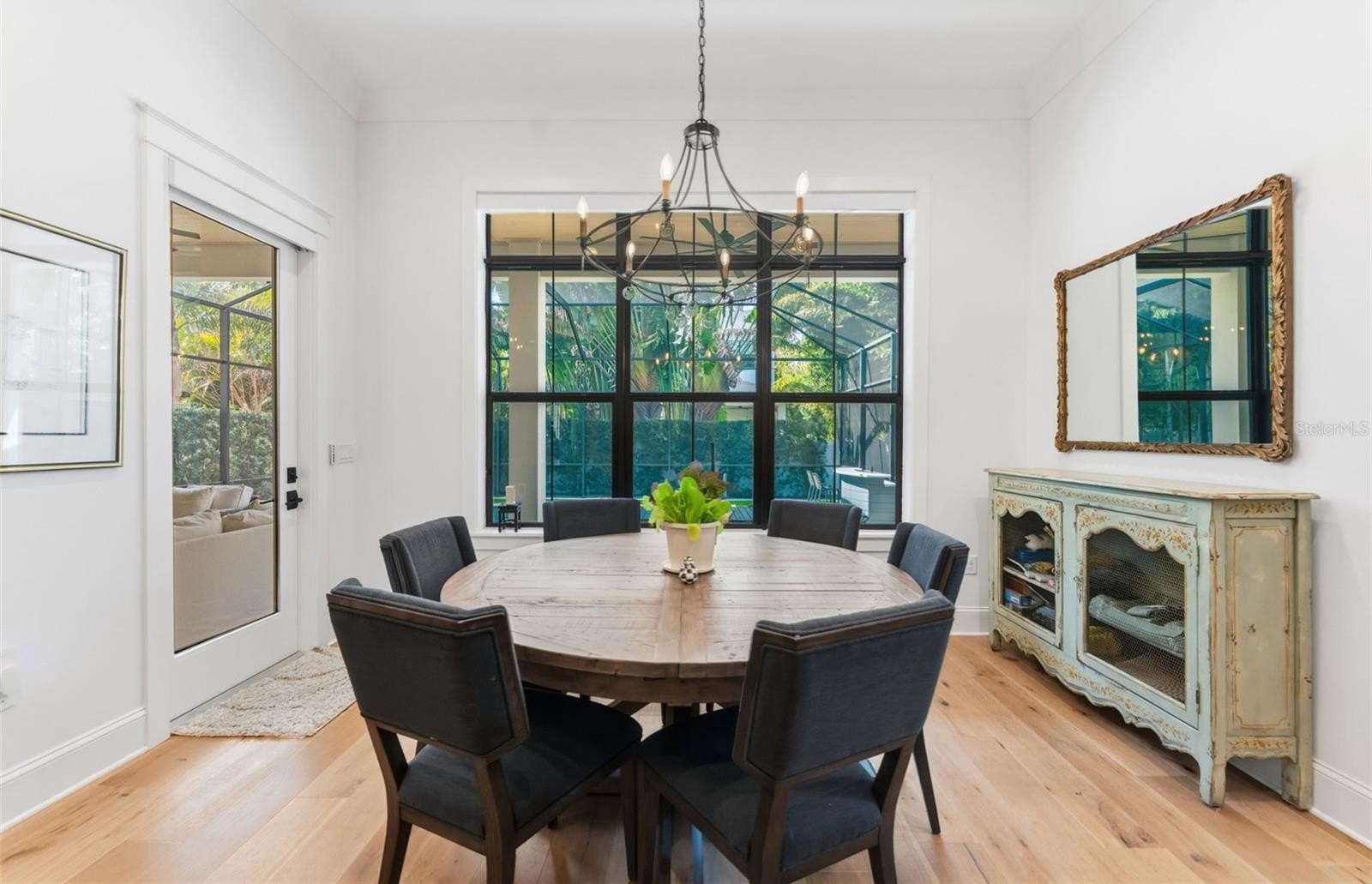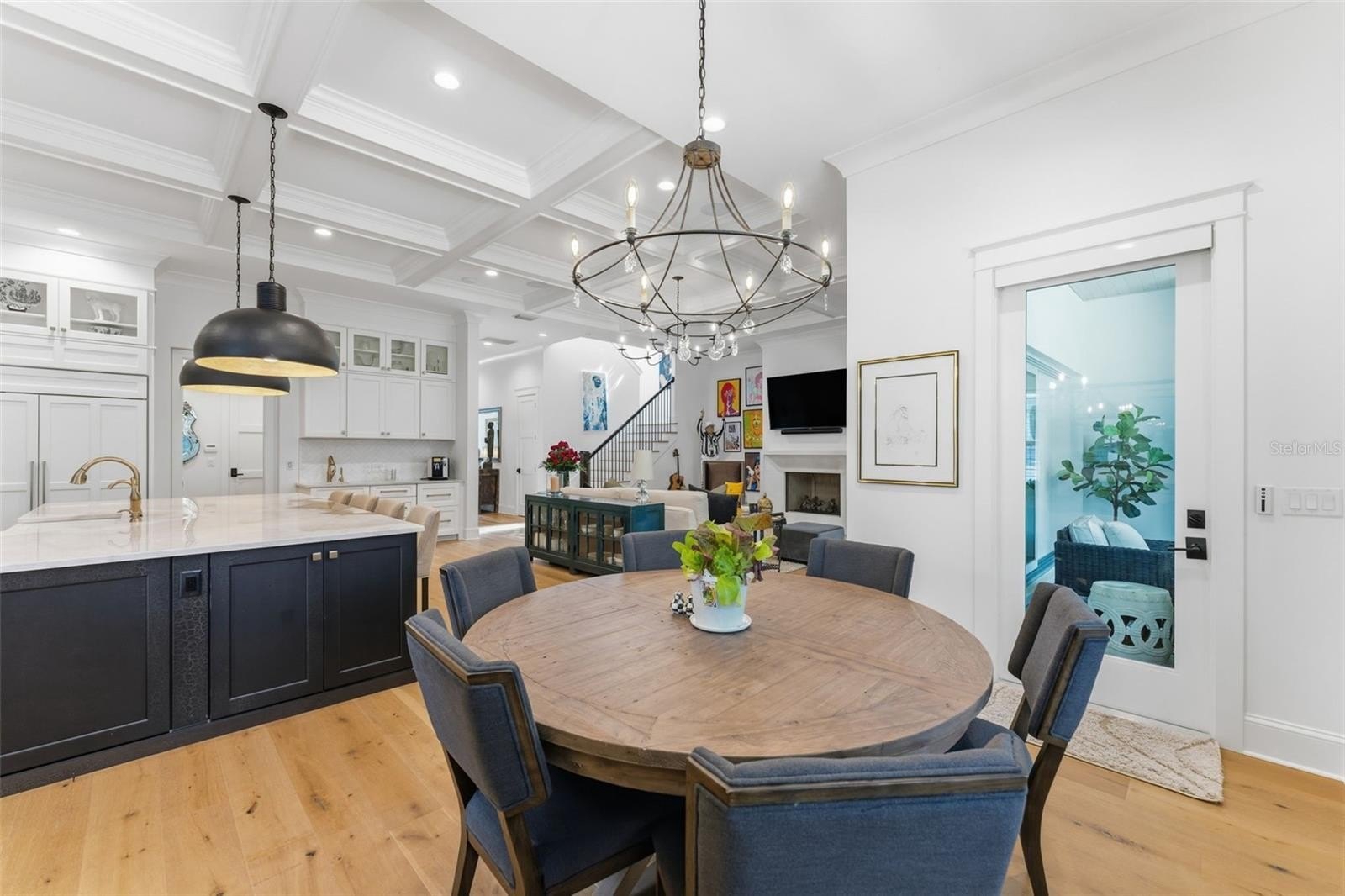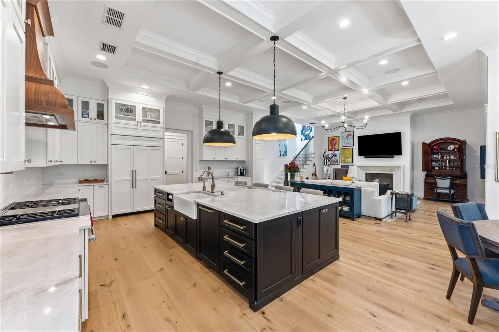 Designed for easy maintenance, entertaining, and everyday living, this home features a wine room for 600+ bottles, coffered ceilings, designer lighting, expanded quartz island, custom walnut vent hood, and upgraded 12-foot sliding glass doors opening to a screened lanai with a fireplace and saltwater pool.