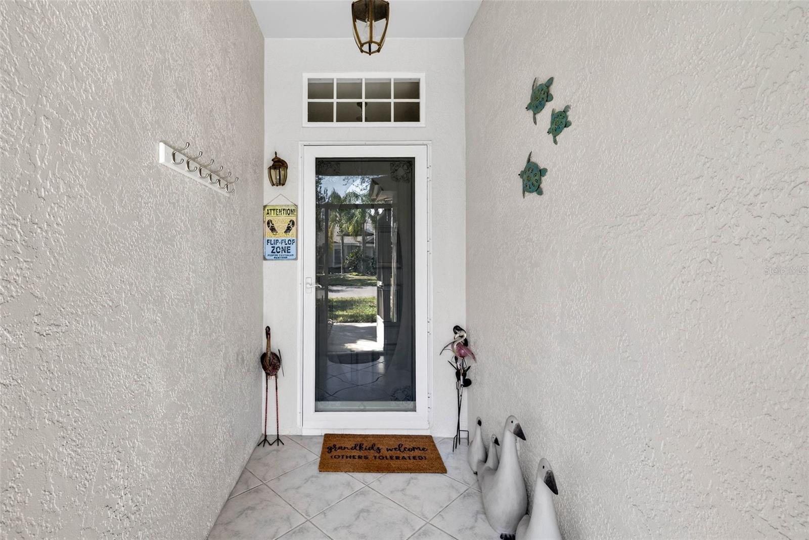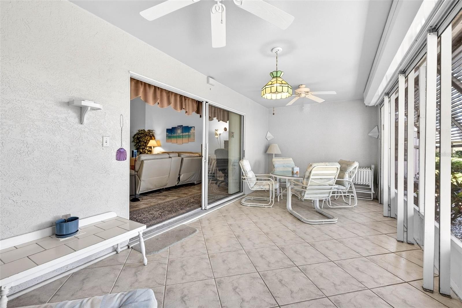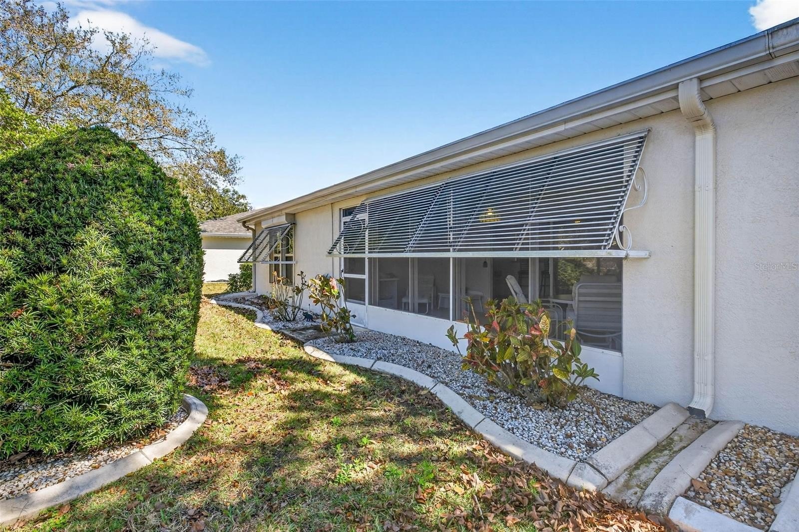 The garage is enhanced with a screened door, laundry sink, and pull-down attic storage for added functionality. Relax on the screened lanai overlooking mature oak trees, with a tranquil pond view to the right — a perfect setting for morning coffee or evening unwinding. Hurricane Shutters provide added style and protection.