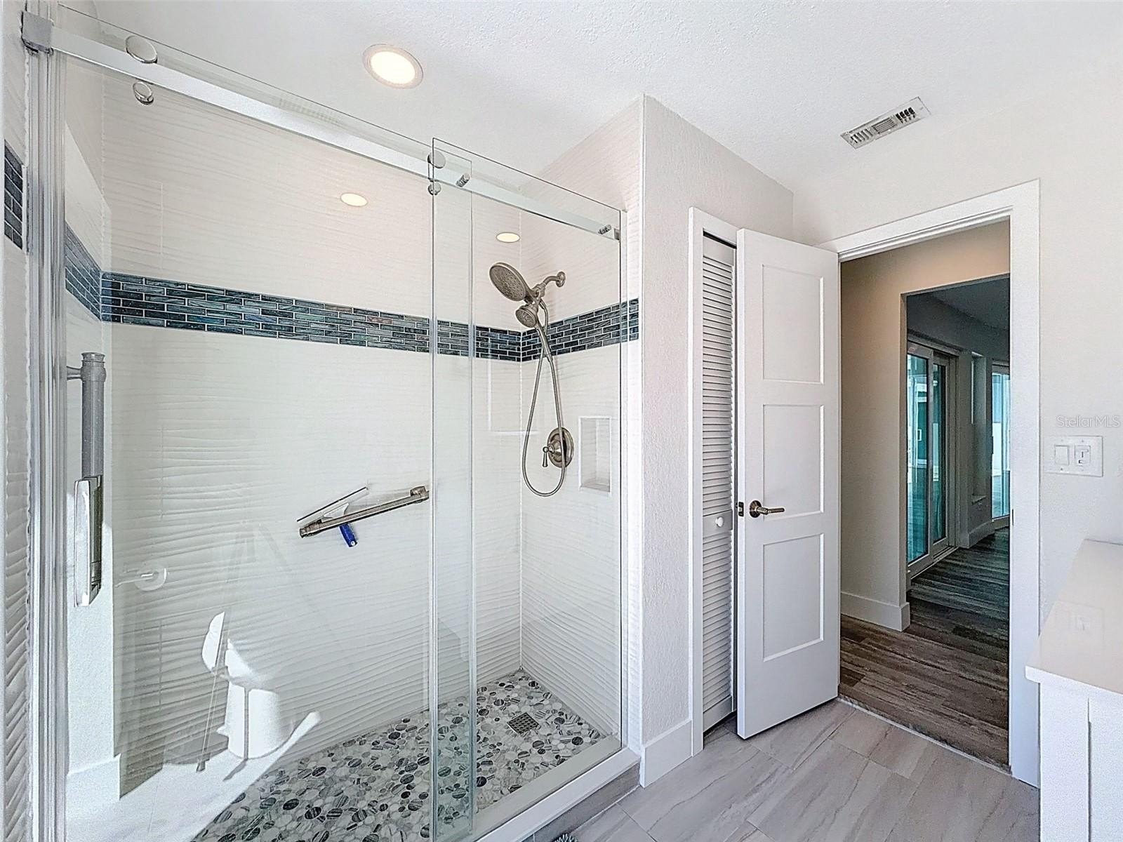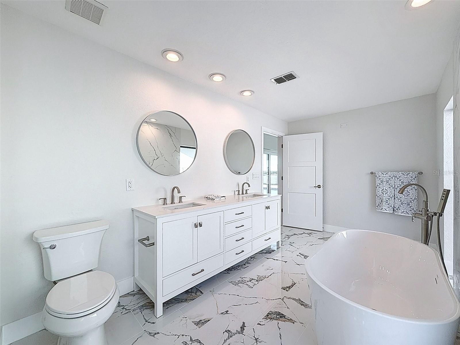 The spacious Primary Suite is a true retreat with sweeping Gulf views, a huge walk-in closet, and a stunning en suite bath featuring a freestanding soaking tub, double sinks, and a beautifully designed oversized shower.