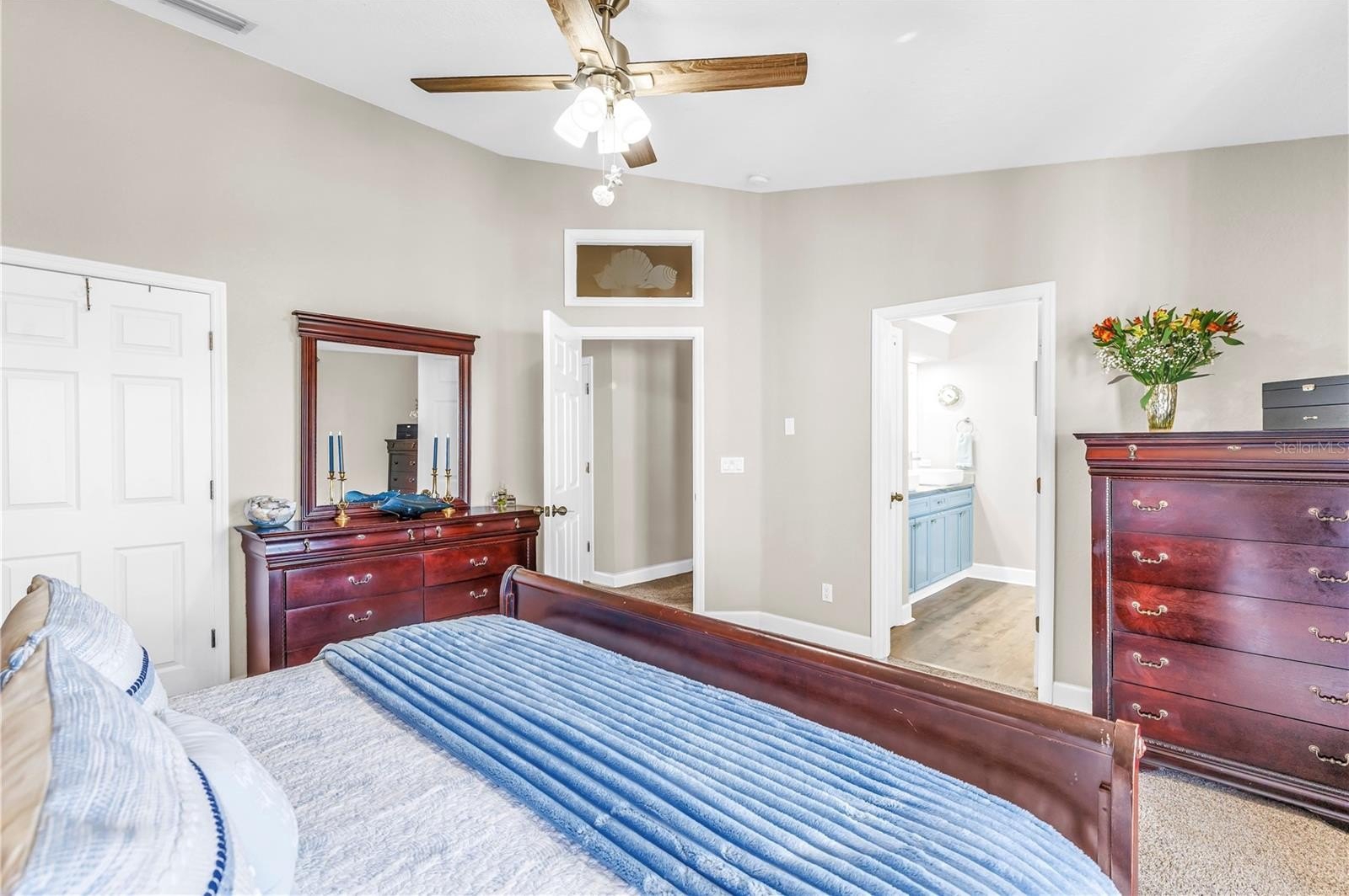 The primary suite offers a relaxing retreat with a fully renovated spa-inspired bathroom featuring quartzite countertops, vessel sinks, custom mirrors, and a stunning glass walk-in shower with rainfall and wall systems. The suite also includes a private balcony overlooking the pool.