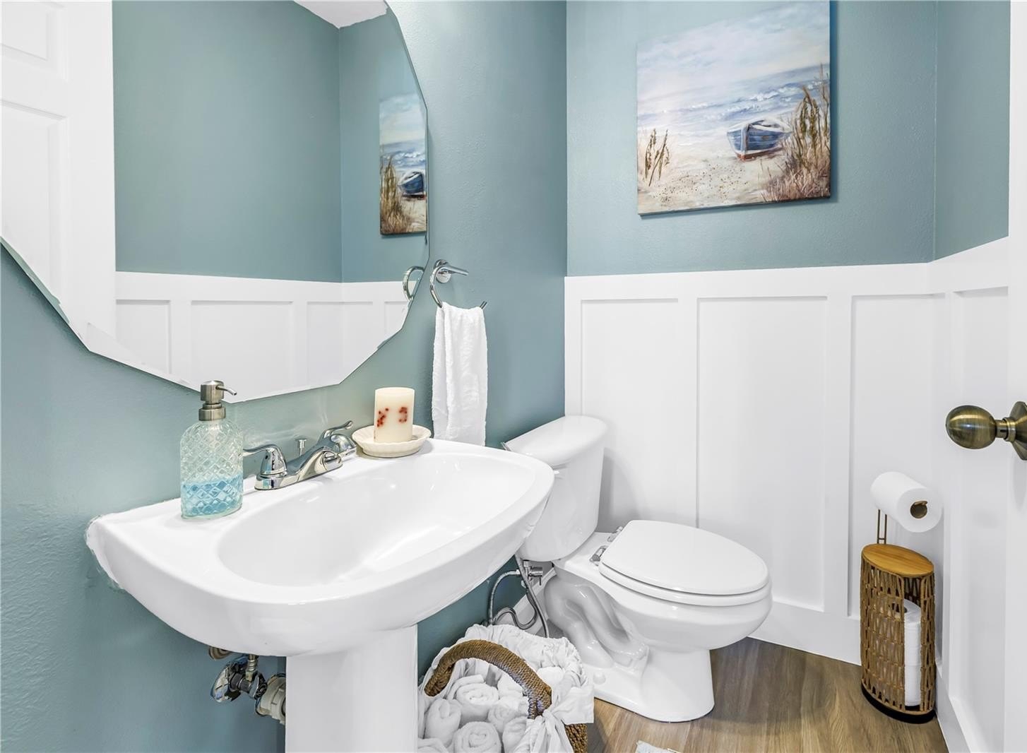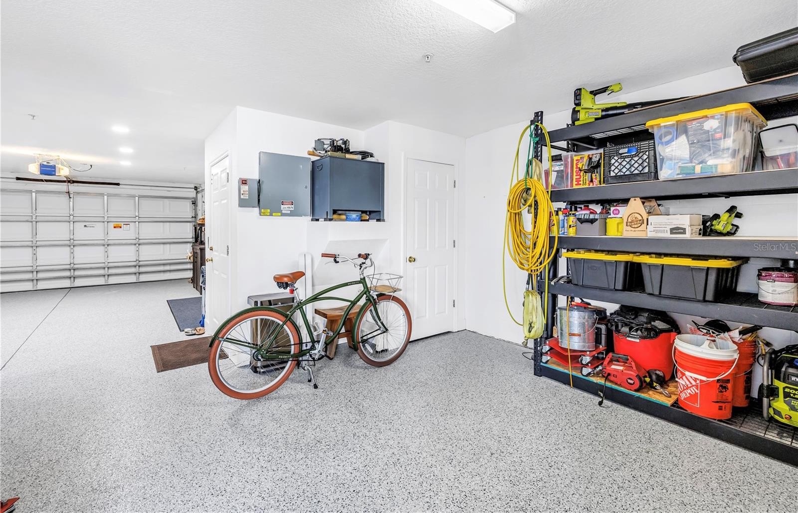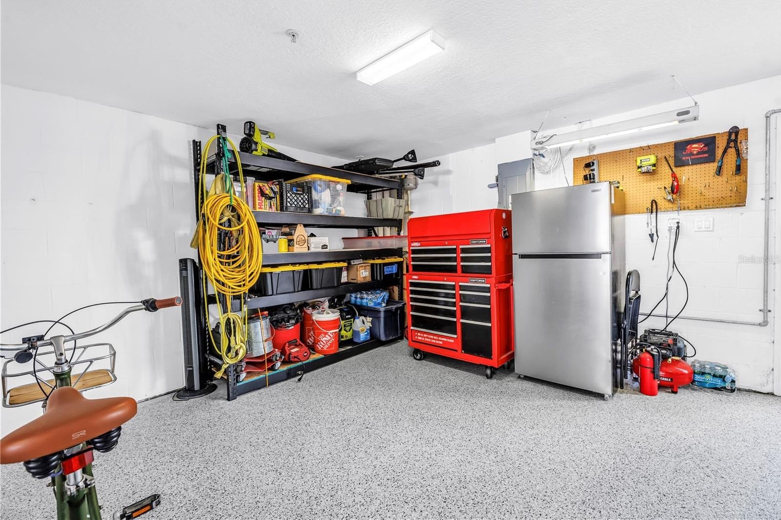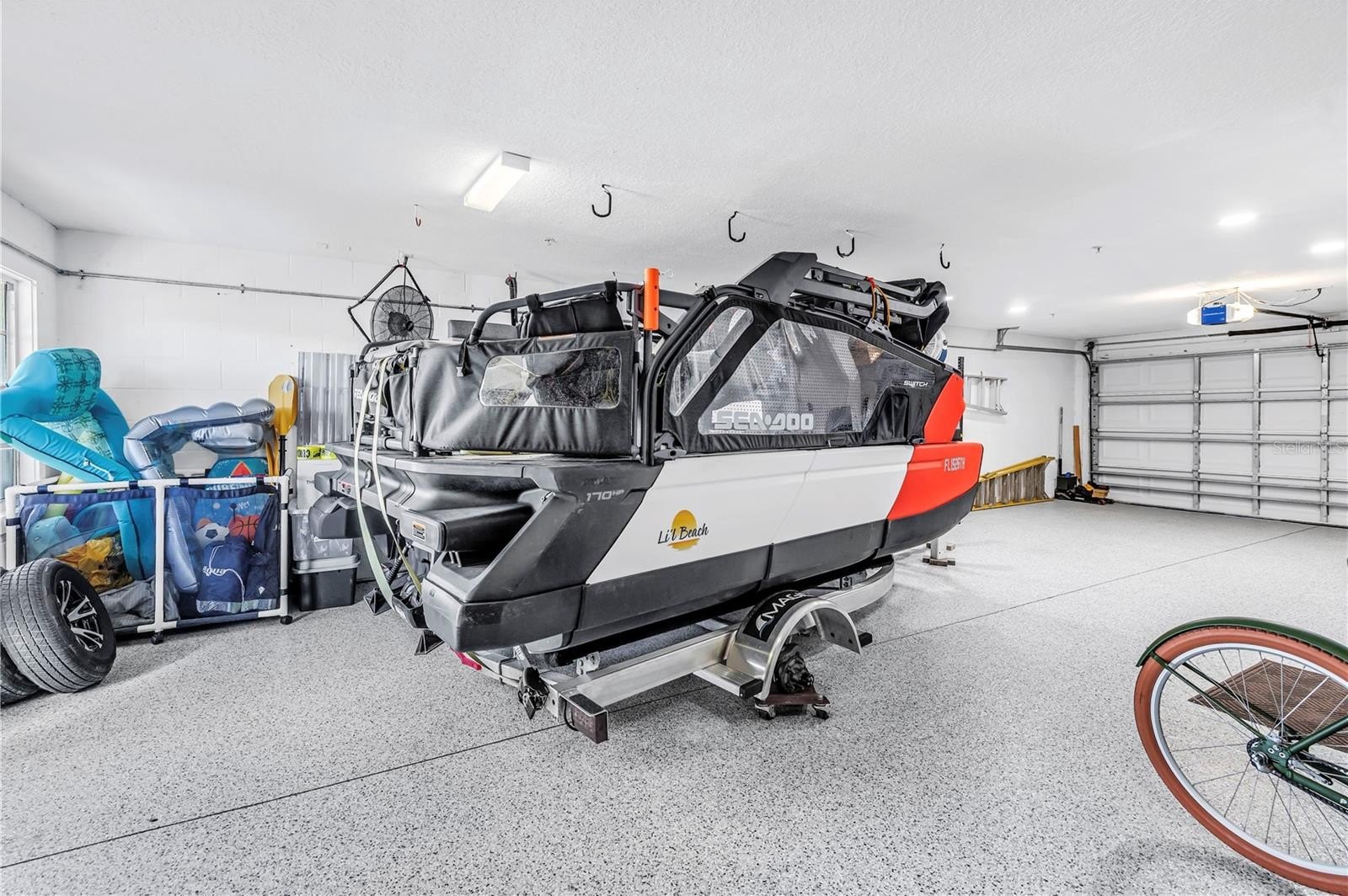 The entry level welcomes you with stylish wave-pattern epoxy flooring and access to a rare 3–4 car garage with epoxy coating, offering exceptional storage for vehicles, paddleboards, bikes, kayaks, and beach gear. The current owners even stored their small pontoon boat in the garage — a boat that has won a few local boat parades as Santa’s sleigh!