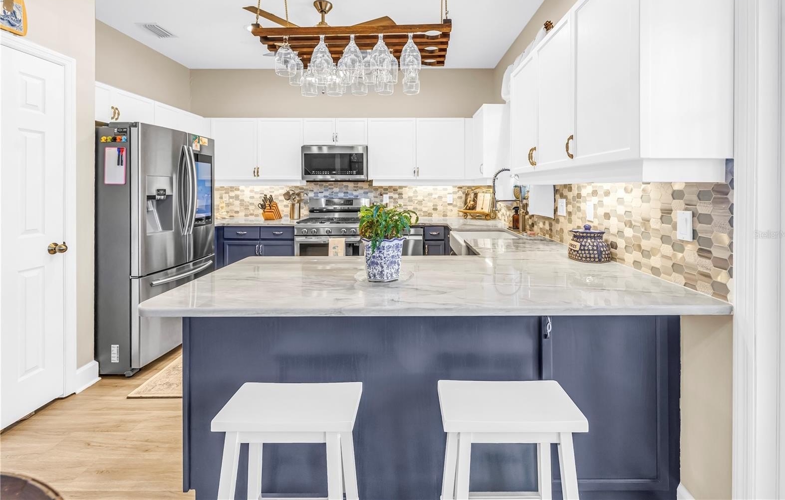The beautifully updated kitchen blends style and functionality with quartzite countertops, a custom porcelain farmhouse sink, Samsung smart appliances, GAS range, under-cabinet lighting, modern cabinetry, and a dinette area with its own balcony access.