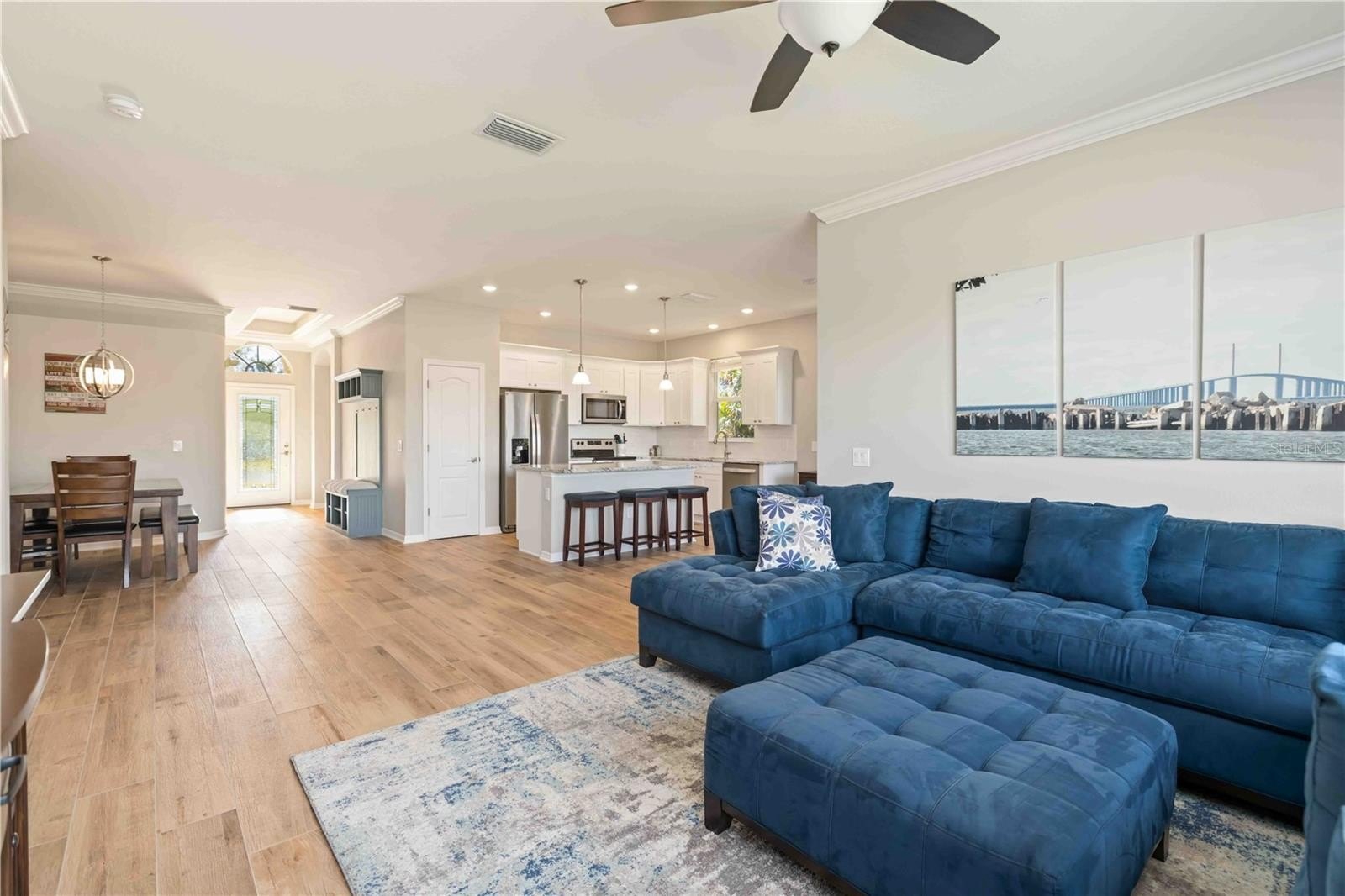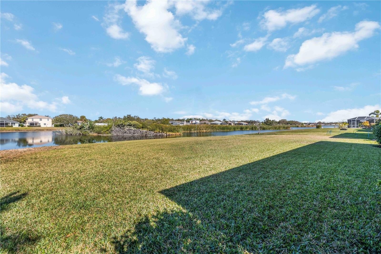 As you enter the home you will notice the beautiful wood look porcelain tile floor that runs seamlessly throughout the open concept layout. A custom built drop zone can be personalized for your family and keep the front of the home looking tidy. The tray ceilings enhance the home's character and show off the natural light that illuminates the home. The kitchen has neutral granite countertops, white cabinets with drawer pullouts for organized storage and an island perfect for eating or entertaining. Step outside on to the screened in lanai and enjoy the peaceful lake views and dozens of bird species who nest on the island in the middle of the 66 acre lake.