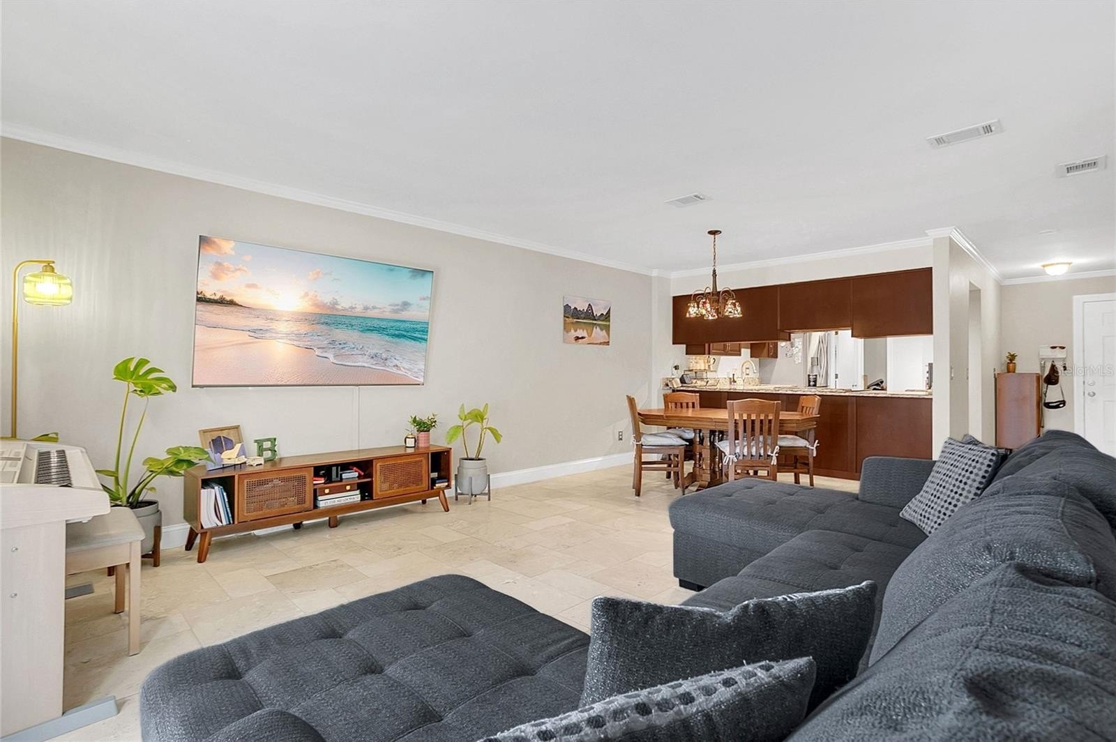 The dining space is generous and elegant, perfectly suited for intimate dinners or celebratory gatherings, while the living room offers a serene retreat with fresh paint, abundant natural light, and a layout designed for both relaxation and entertaining. Throughout the main living spaces, travertine tile adds timeless beauty and understated luxury.