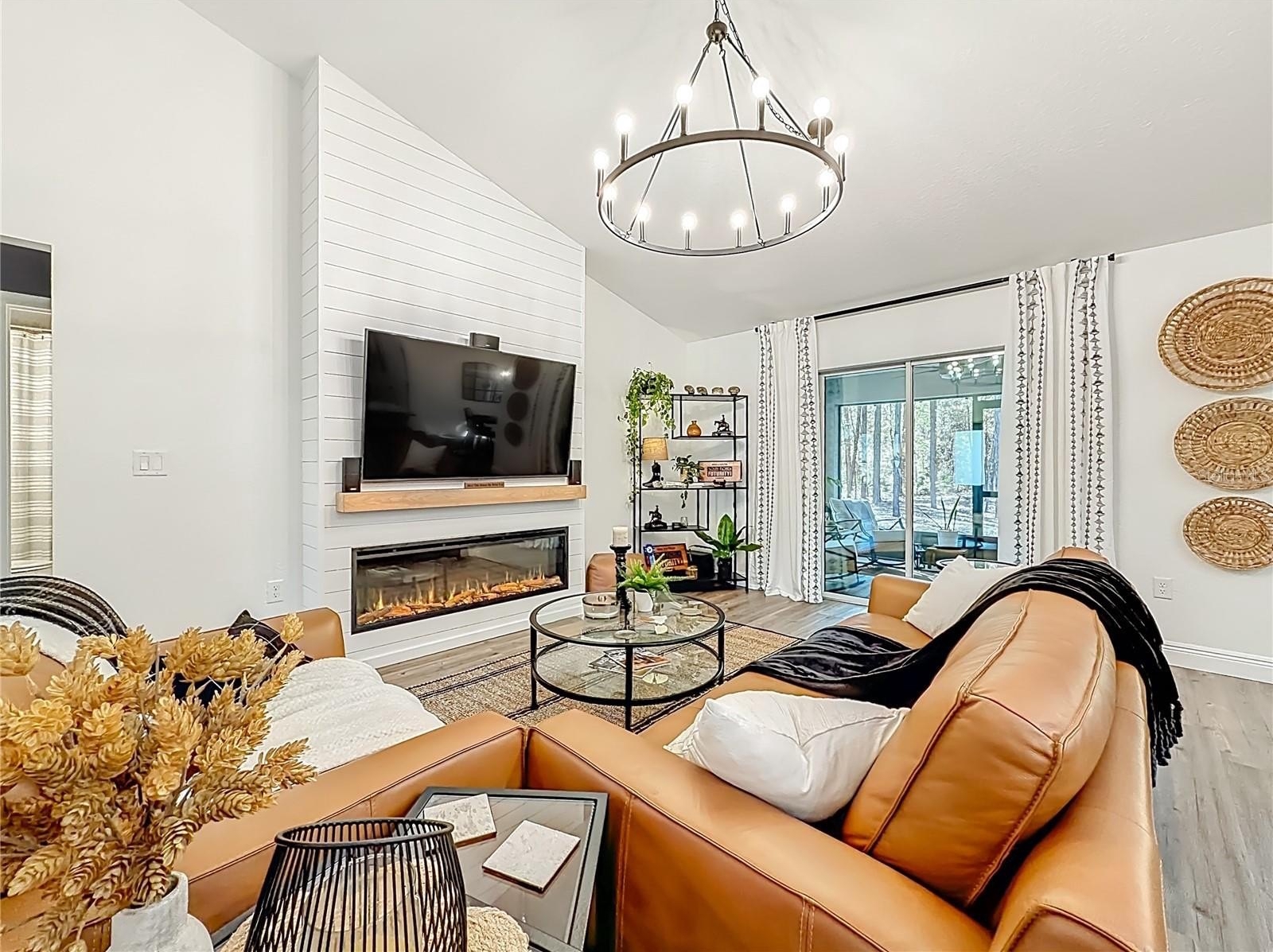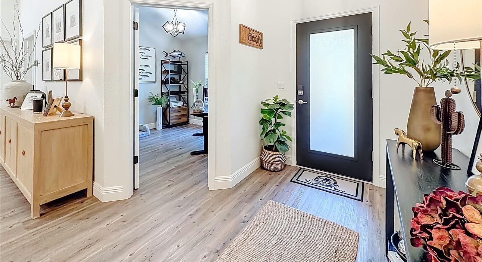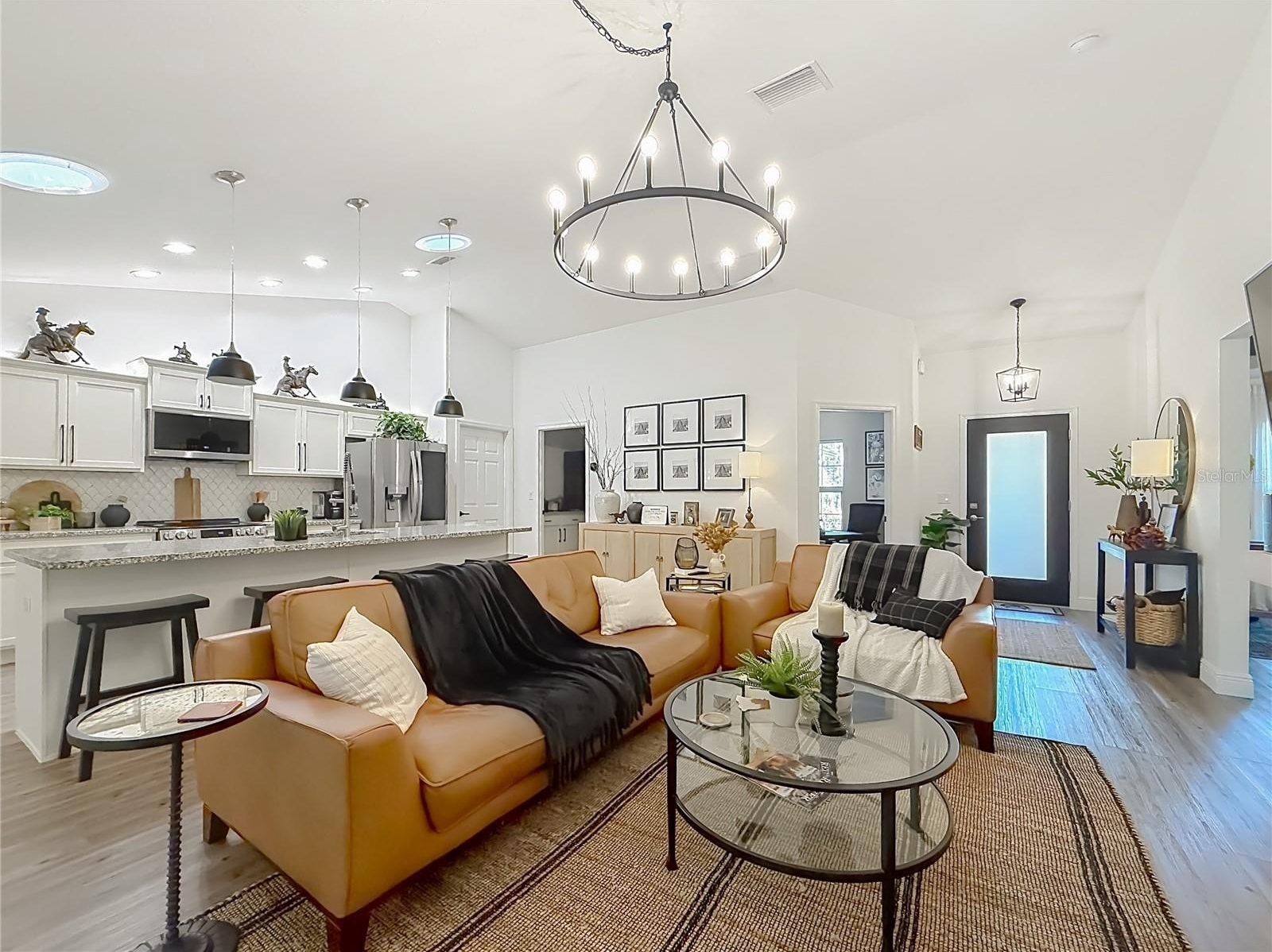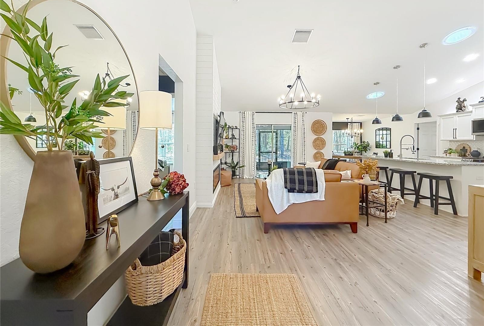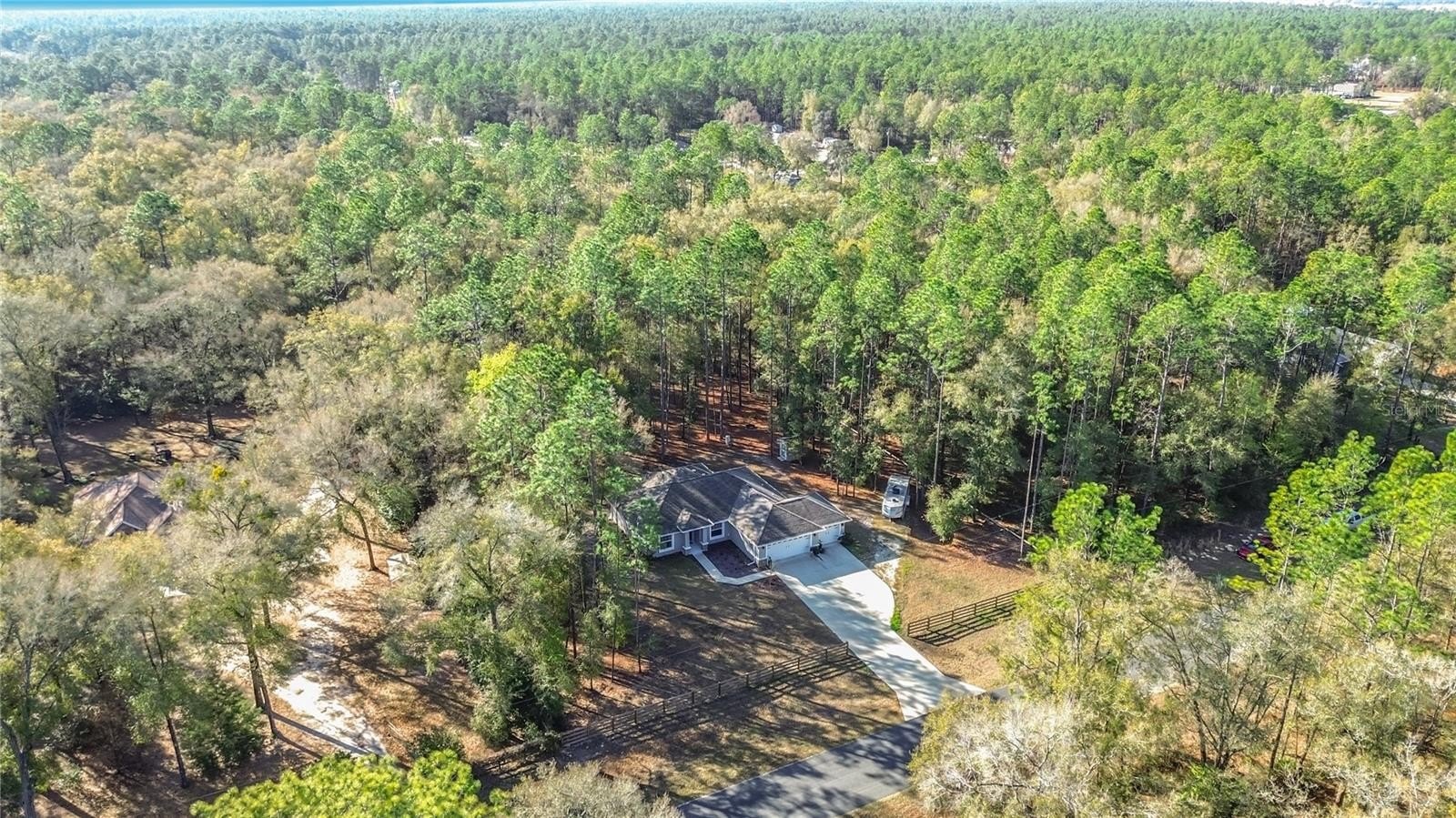 Built in 2022, this pristine home is located in the highly coveted Rolling Hills community (no HOA) - just 8 miles from the World Equestrian Center - on a 1.14-acre lot on a paved road. It has 3-bedrooms plus a dedicated office, 2-bathrooms, and a 3-car garage, equaling over 1,700 sq. ft. of living space in an open-concept layout. The home features solar tubes for an abundance of natural light, a cozy electric fireplace, and a laundry room and spacious pantry equipped with automatic lighting. Durable LVP flooring throughout and upgraded door hardware, mirrors, light fixtures, and custom blinds. A screened lanai and brick patio enable enjoyment of the wooded backyard that is secured with four-board no-climb fencing. A rear gate leads directly from your wooded backyard to a right-of-way walking path, perfect for peaceful strolls. There is a wood shed for extra storage and a dedicated RV pad with both 30 AMP and water hookups.