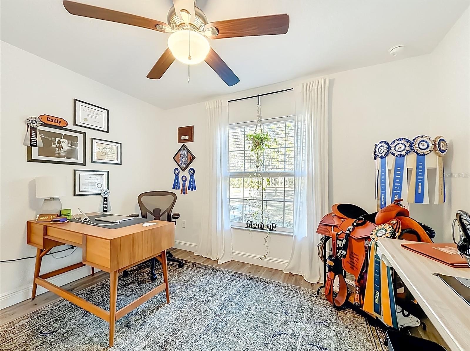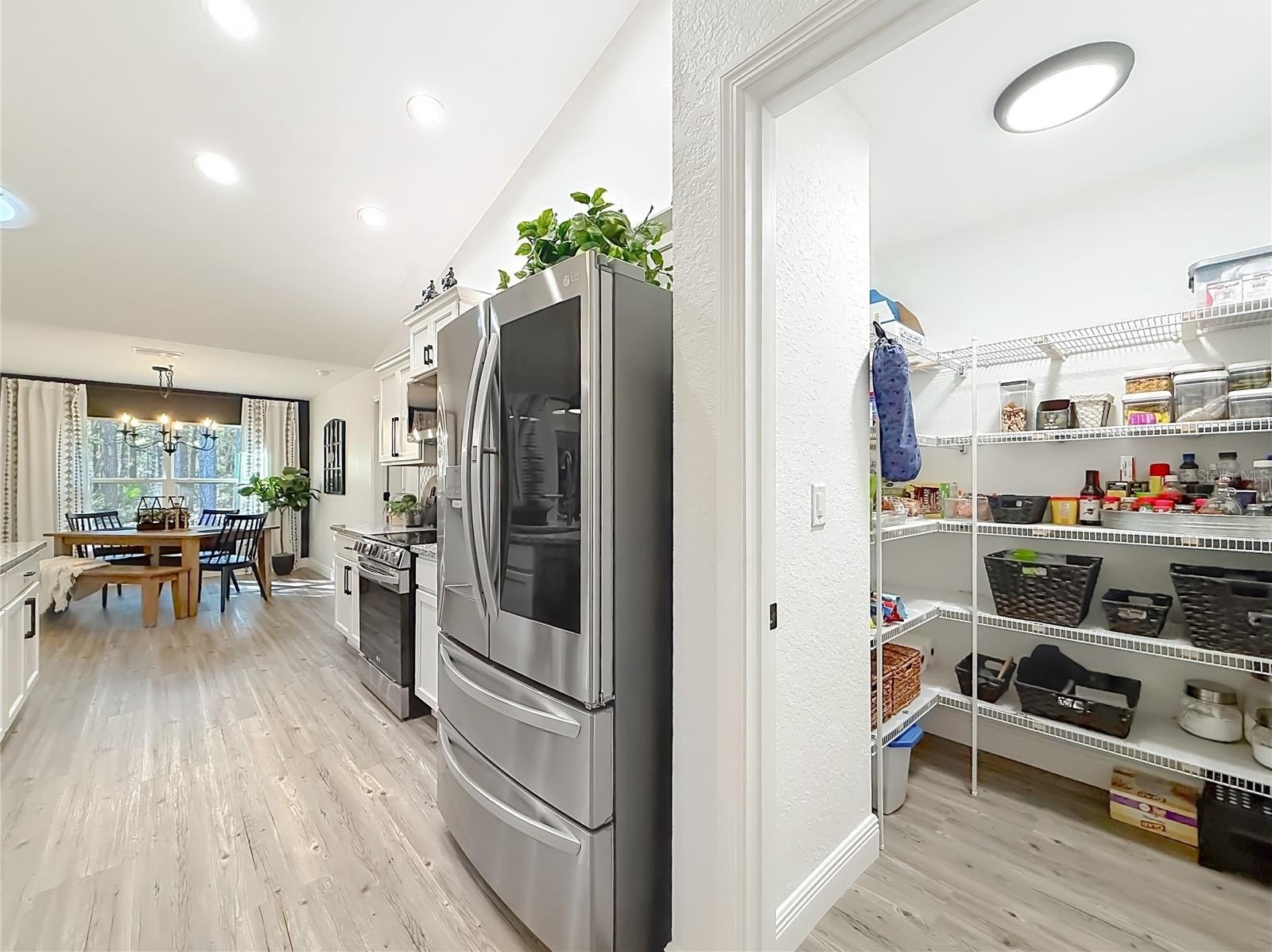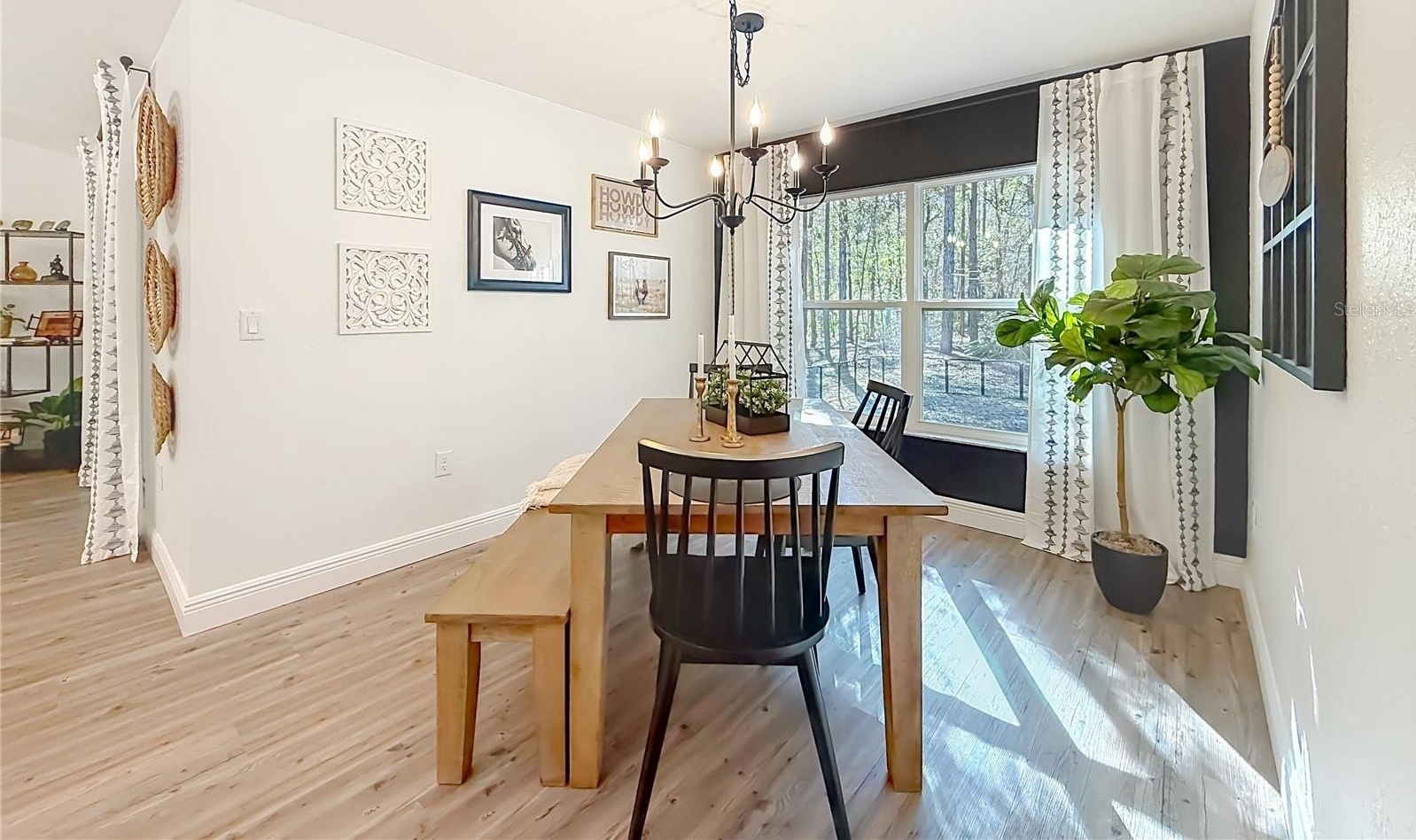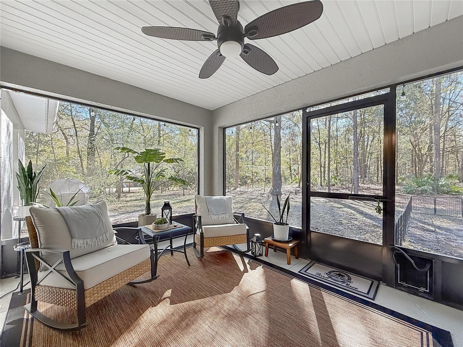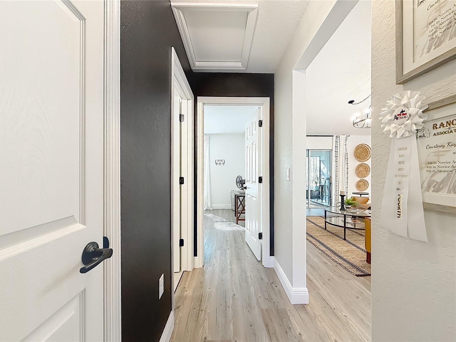 Built in 2022, this pristine home is located in the highly coveted Rolling Hills community (no HOA) - just 8 miles from the World Equestrian Center - on a 1.14-acre lot on a paved road. It has 3-bedrooms plus a dedicated office, 2-bathrooms, and a 3-car garage, equaling over 1,700 sq. ft. of living space in an open-concept layout. The home features solar tubes for an abundance of natural light, a cozy electric fireplace, and a laundry room and spacious pantry equipped with automatic lighting. Durable LVP flooring throughout and upgraded door hardware, mirrors, light fixtures, and custom blinds. A screened lanai and brick patio enable enjoyment of the wooded backyard that is secured with four-board no-climb fencing. A rear gate leads directly from your wooded backyard to a right-of-way walking path, perfect for peaceful strolls. There is a wood shed for extra storage and a dedicated RV pad with both 30 AMP and water hookups.