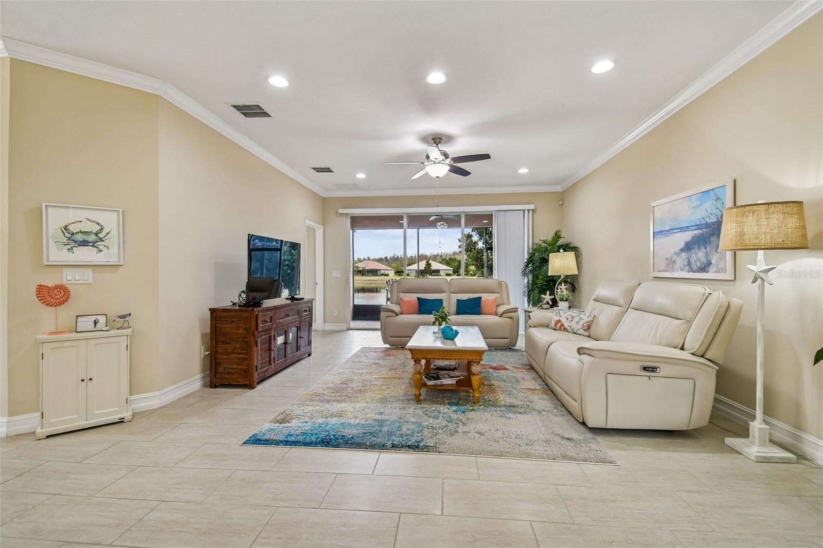 Welcome to this stunning Augusta model home, perfectly positioned to capture one of the community’s most serene and sought-after water views. Nestled along the extended side of the pond, this special location offers peaceful mornings filled with breathtaking sunrises and relaxing Florida breezes all year long. Step inside and feel instantly at home. The bright, open floor plan with soaring 9-foot ceilings and a split-bedroom design creates both comfort and privacy. With 1,800 square feet under air, this spacious villa offers 2 bedrooms, a versatile den or optional third bedroom, 2 bathrooms, and a 2-car garage — providing room to live, work, and entertain with ease. Beautiful 24x12 quarry tile floors flow throughout the main living areas and baths, while engineered hardwood adds warmth to the den. The primary and second bedrooms feature plush, well-maintained carpeting for added comfort. Elegant crown molding wraps the main living spaces, adding a refined touch throughout. The heart of the home is the large gourmet kitchen — designed for gathering and everyday enjoyment. Quartz countertops, an extended 18” serving bar for additional seating, and a stylish stone and glass horizontal mosaic backsplash create a space that is both functional and beautiful. Upgraded stainless-style appliances, 42” maplewood cabinetry with crown molding, under-cabinet lighting, 2 glass inserts in the upper cabinets, and a custom-built pantry provide both charm and convenience. The adjacent breakfast area is perfect for relaxed mornings and casual dining.Wake up each day in the spacious primary suite with calming water views. This peaceful retreat features a generous walk-in closet and a beautifully appointed ensuite bath with dual vanities, quartz countertops, and a walk-in shower adorned with floor-to-ceiling tile, glass/stone horizontal listello and a built-in bench for comfort. The quartz countertop in the 2nd bath is extended to feature the elegant ‘banjo’ style. A French door leads to the flexible third bedroom or home office, offering privacy and versatility to suit your needs. The living room opens through triple 8-foot sliding doors to a screened lanai with an extended paver patio — the perfect setting for outdoor dining, entertaining friends, or simply unwinding by the water with your morning coffee or evening glass of wine. Additional highlights include a large utility room with washer, dryer, sink, and extra shelving, a new 2024 HVAC system with a 10-year transferable warranty, epoxy garage flooring, an insulated garage door with upgraded belt-drive opener, and a water softener system. This home is more than beautiful — it’s a place to relax, gather, and truly enjoy the Florida lifestyle in comfort and style. Valencia Lakes is a 55 + active adult golf cart community with 40-acre waterfront outdoor recreation area with resort-style heated pool, lap and resistance pool, 40,000 sq. ft. clubhouse, deluxe Bistro, har-tru tennis courts, gym, half-court basketball, pickleball and bocce courts, dog park, baseball park, community garden, hundreds of clubs and activities, RV/boat storage area. Over 100 acres set aside as nature preserves; enjoy the solitude of peaceful views, birds & wildlife by the water. Great sense of community with great friendly neighbors. Please call for a private showing and experience this wonderful community for yourself. Tampa, St. Pete and Sarasota 30-45 minutes away. Close to the airport, medical facilities, shopping and golf.