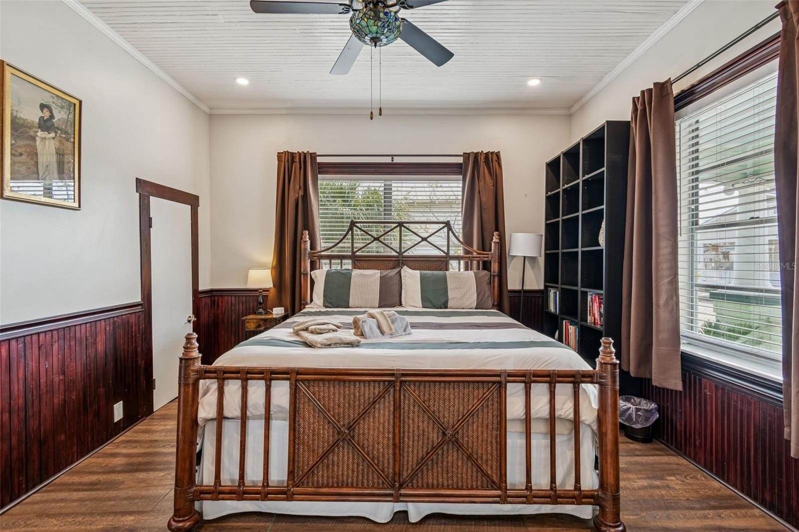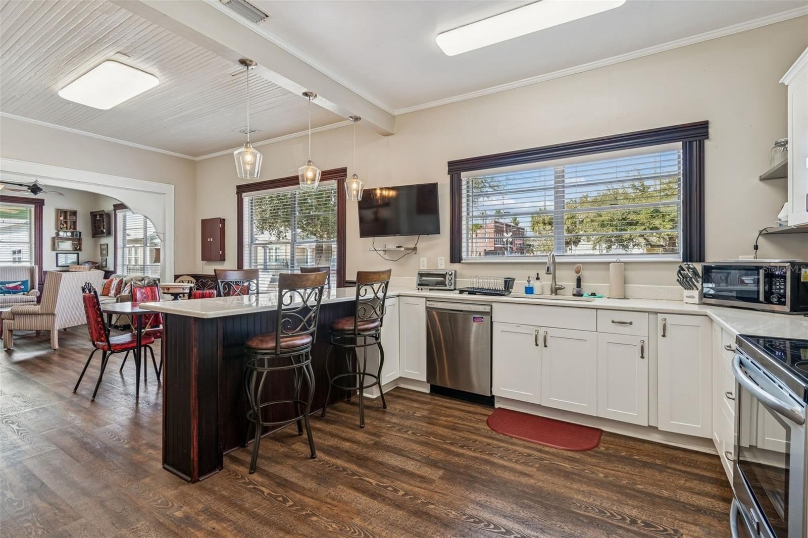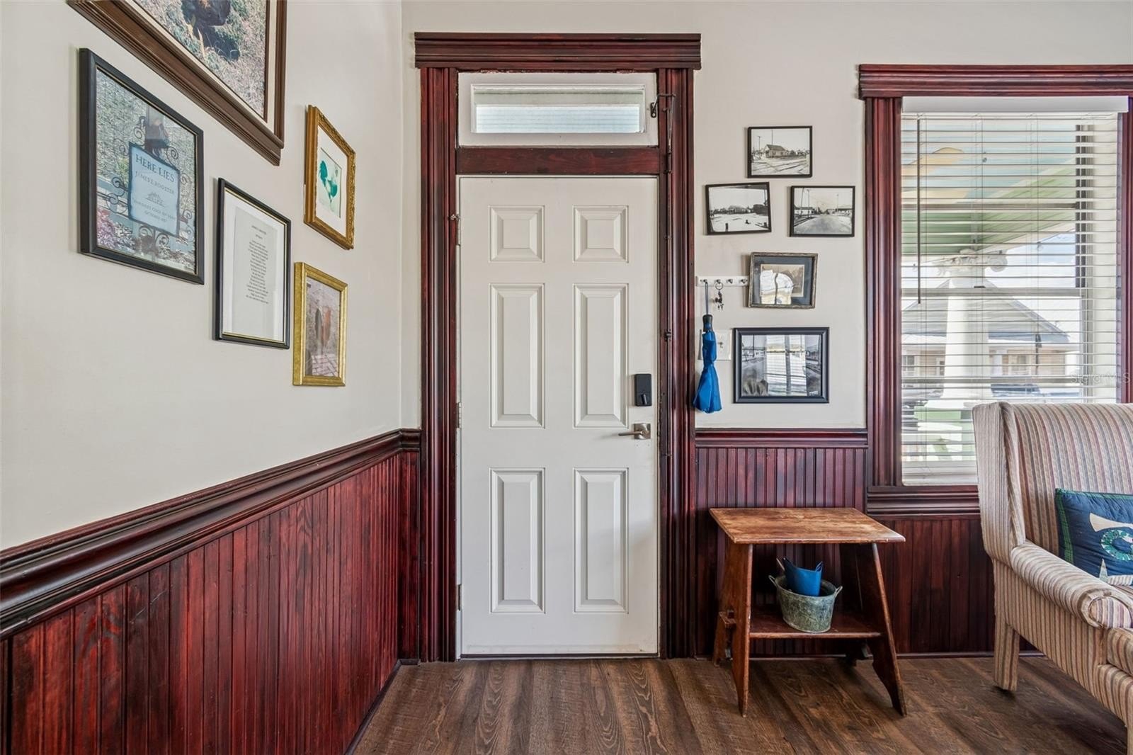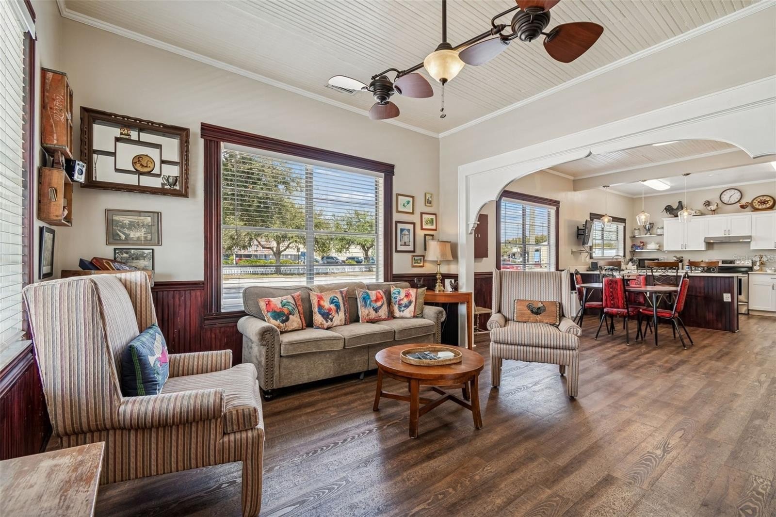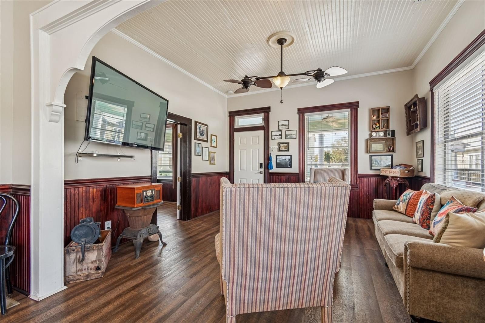 Step inside to a bright and welcoming LIVING ROOM with plenty of windows for amazing natural sunlight featuring stunning original woodwork and detailed craftsmanship that truly sets this home apart. The ceiling showcases elegant WOODWORK, which continues into the OVERSIZED DINING ROOM, creating warmth and architectural character throughout the main living spaces. ALL-NEW LUXURY VINYL PLANK FLOORING, FRESH PAINT, and WOOD BLINDS give the home a crisp, updated feel while preserving its historic charm. 1925 Meets 2026.