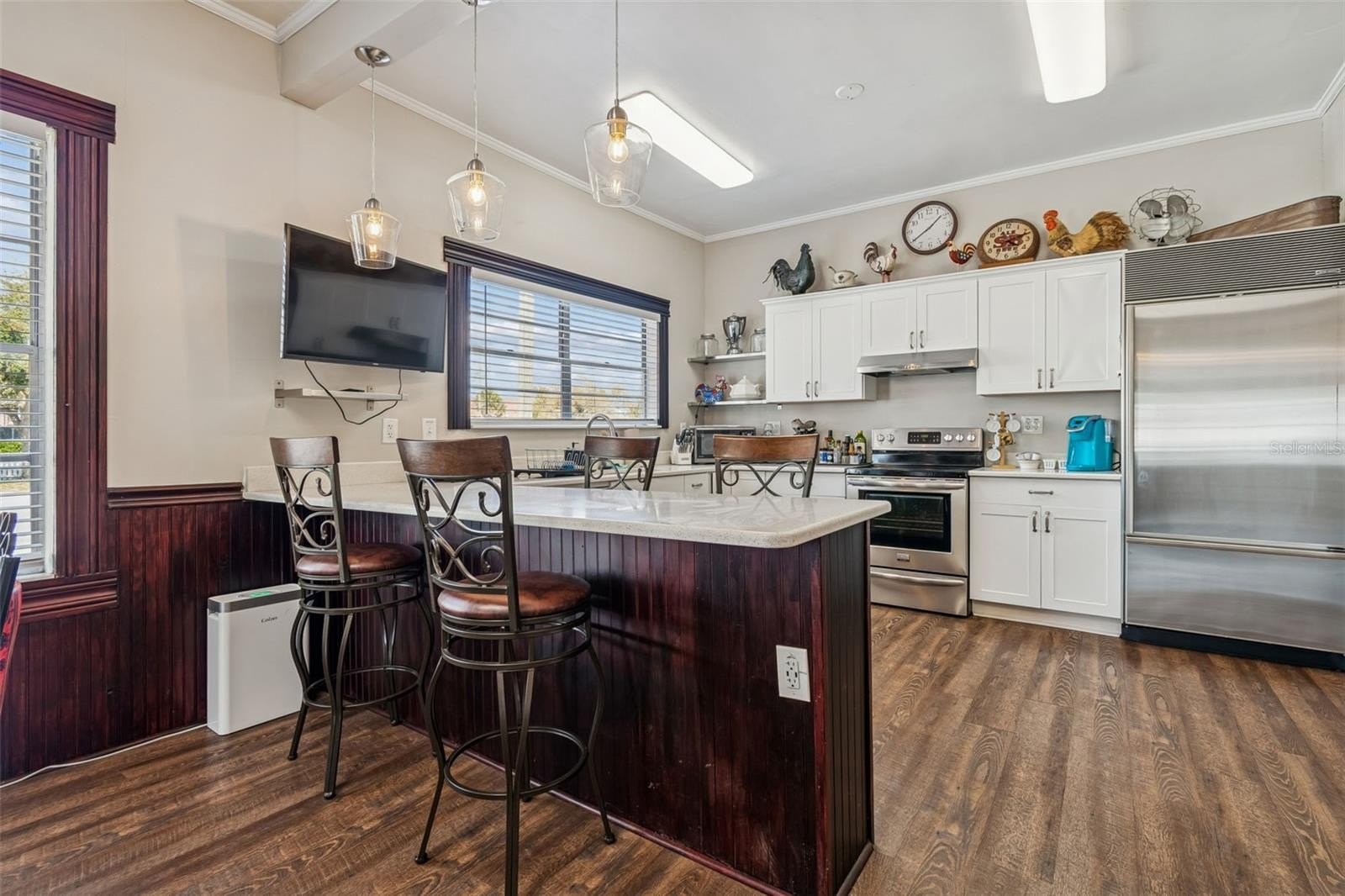 The STUNNING KITCHEN is a showstopper, complete with QUARTZ COUNTERTOPS, NEWER CABINETRY, and NEWER APPLIANCES including a SUBZERO refrigerator/freezer, FRIGIDAIRE GALLERY stove, TOSHIBA microwave, and FRIGIDAIRE dishwasher. A FULL KITCHEN SET OF SUPPLIES/DISHES ARE INCLUDED, making this property truly move-in or business ready.