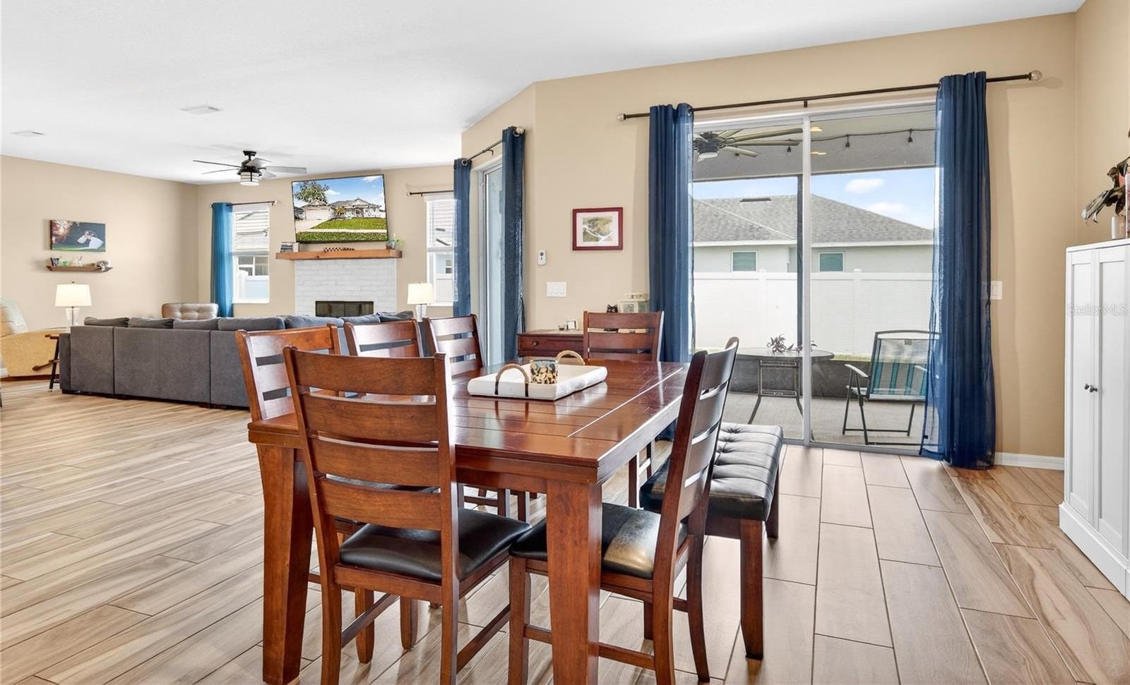 The spacious open floor plan showcases high ceilings and wood-plank ceramic tile throughout. The stunning kitchen includes granite countertops, a large island with breakfast bar, tall high-end cabinetry, and a walk-in pantry—perfect for gatherings and everyday living.
