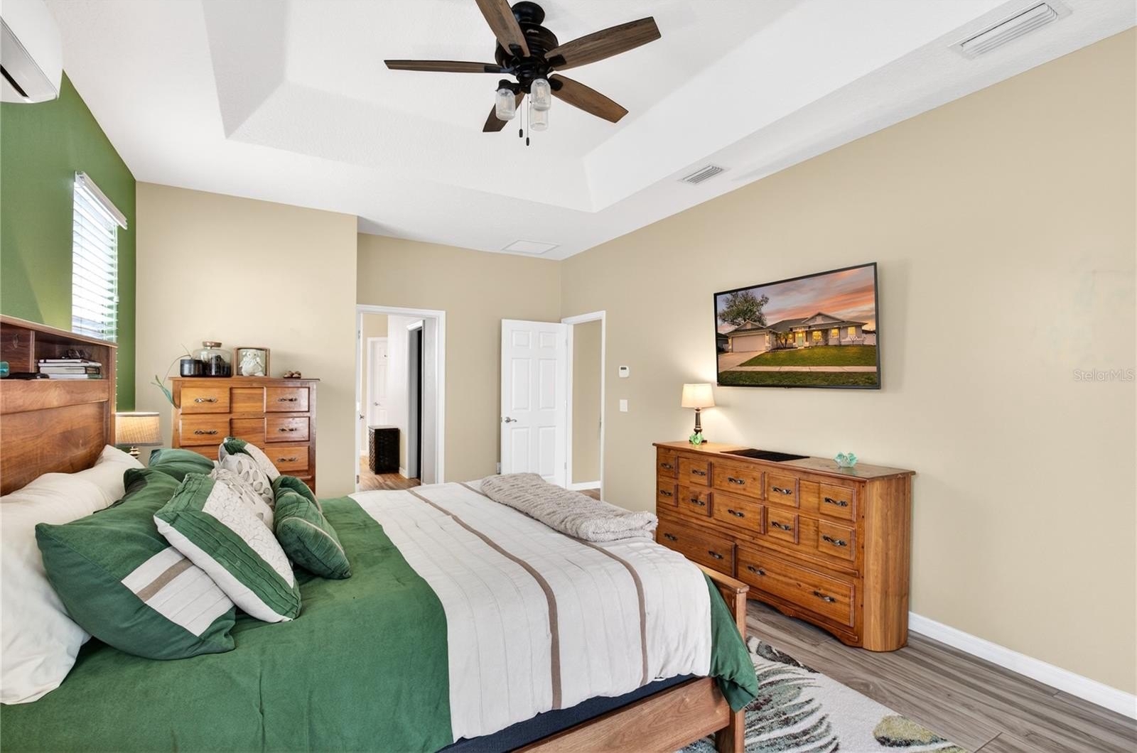 The expansive primary suite boasts a tray ceiling and a luxurious bath with double vanities, a resort-style shower, private water closet, and dual walk-in closets. A split-unit air conditioner in the primary suite adds extra comfort for restful sleep.