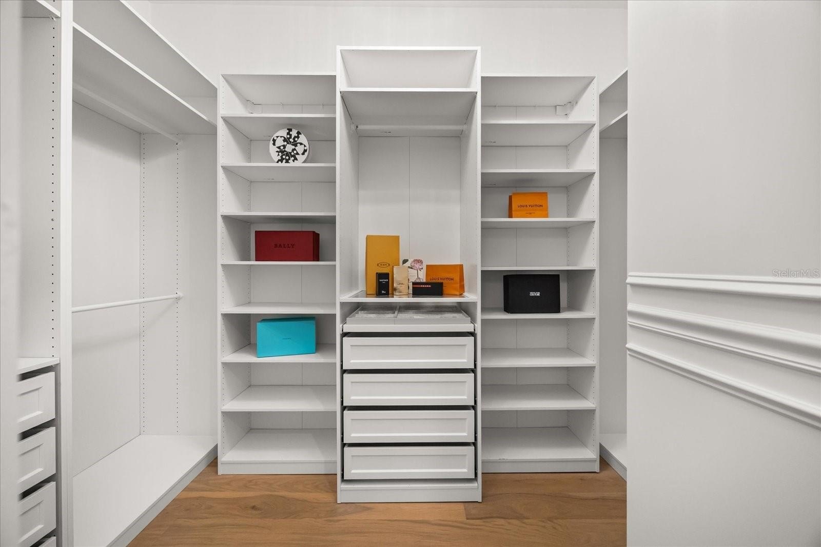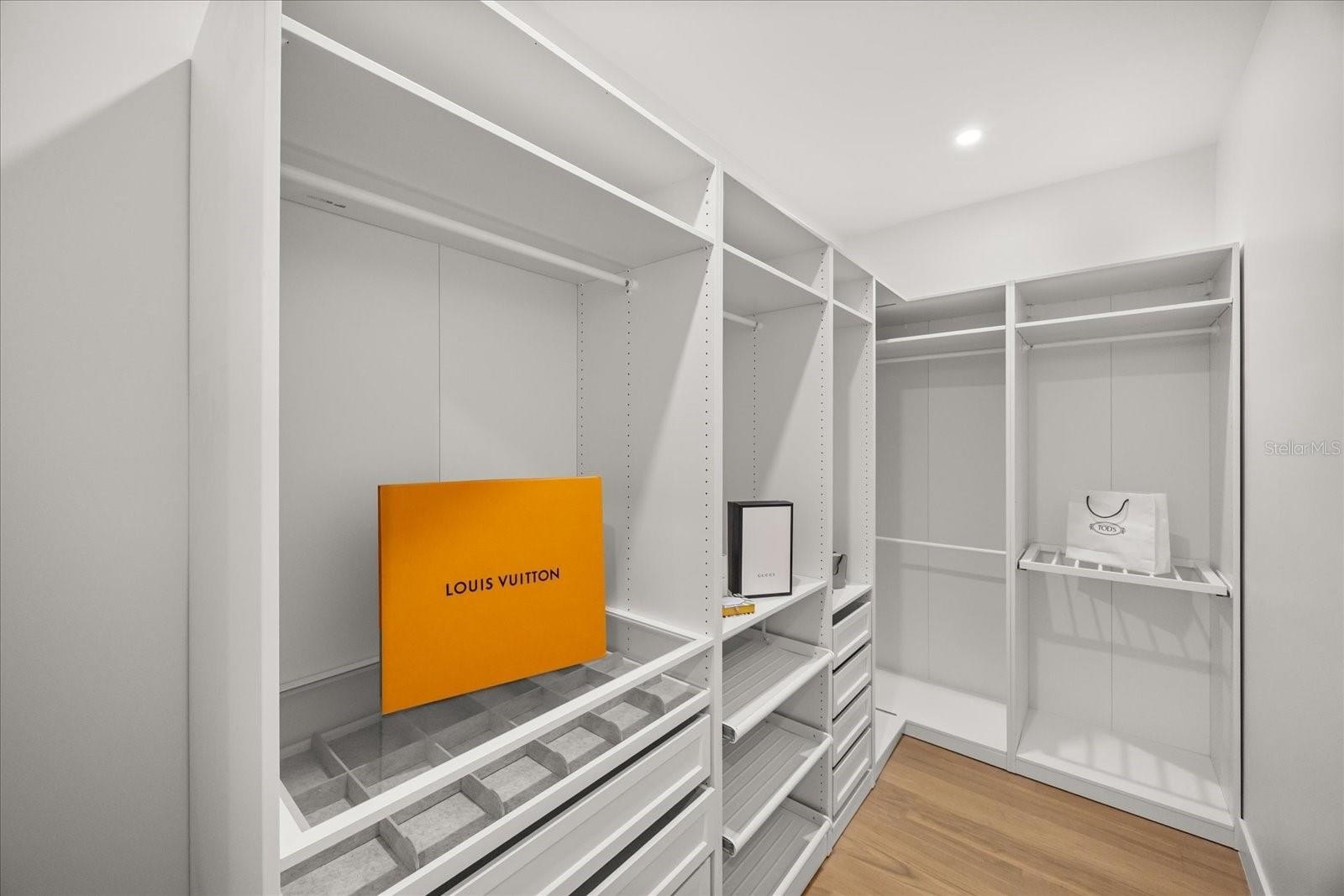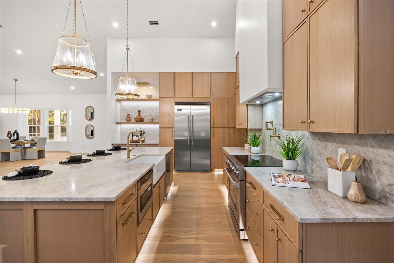 The chef’s kitchen commands attention. A grand Taj Mahal quartzite island defines the center. White oak cabinetry spans floor to ceiling. The Thor range and sculpted hood rise against a full-height stone backdrop. pot filler., Viking refrigerator. Glass pendants hover overhead -- Every finish carries presence. The scullery unfolds unexpected, elevated, and unforgettable — Deep olive custom cabinetry, textured tile, LED-lit shelving, beverage refrigeration, and layered storage make it as functional as it is striking.