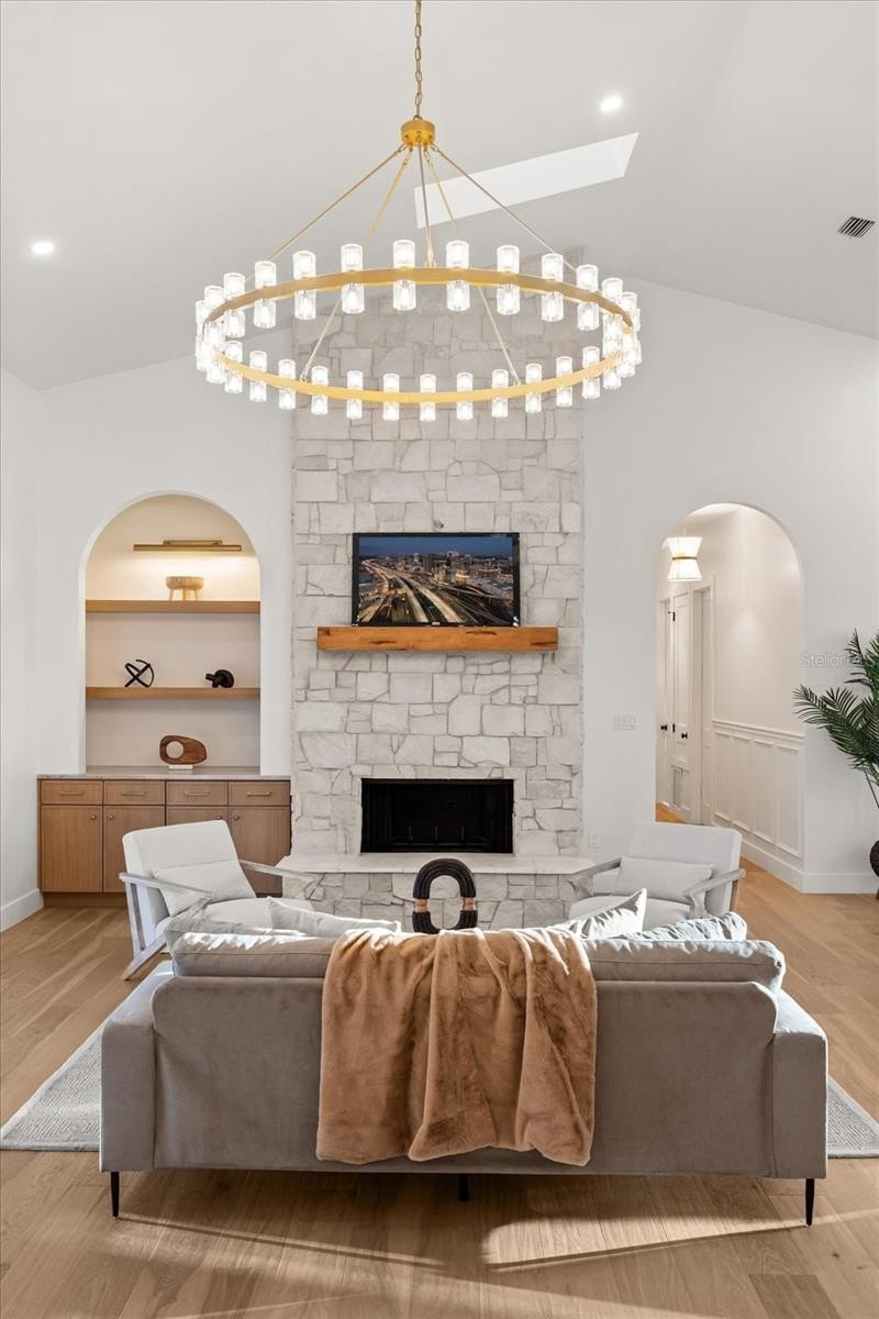 What unfolds within is architectural theater. Vaulted ceilings rise to a dramatic 14-foot peak as skylights and expansive double-pane windows flood the interiors with natural light. A sculptural chandelier crowns the volume, while a full-height stone fireplace ascends as the focal point. French glass doors frame panoramic views of the private rear oasis — pool, pergola, and mature canopy beyond — creating a seamless connection between interior grandeur and outdoor serenity. Bay windows overlook the fountain and motor court, creating a balanced dialogue between arrival and retreat.