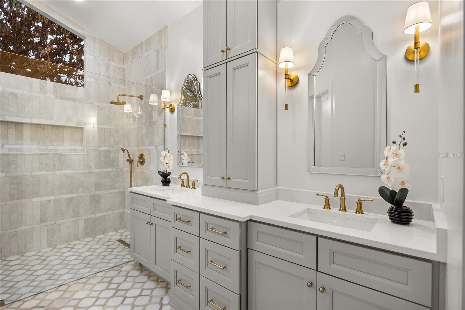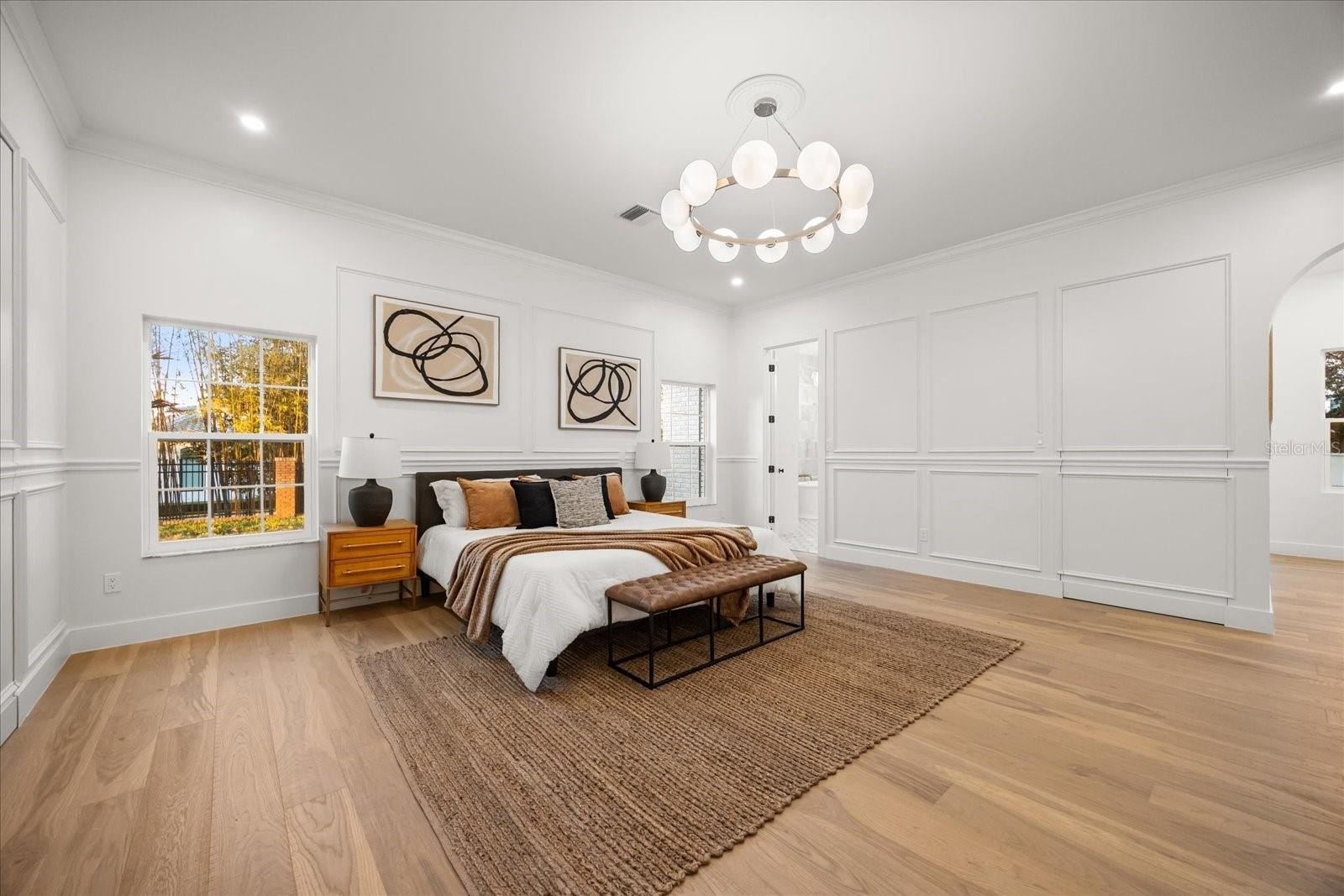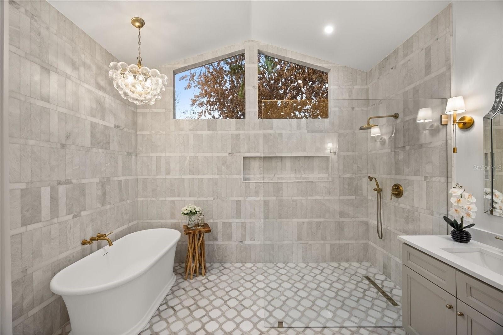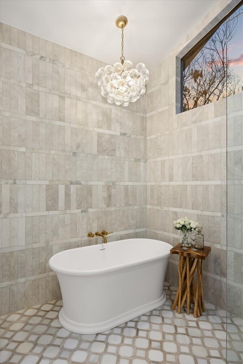 A split plan introduces the primary suite — vaulted, private, composed. A sculptural chandelier anchors the ceiling while tailored wall moldings define the room. Dual concealed walk-in closets preserve symmetry. The primary bath is a statement of design: matte stone soaking tub beneath clerestory light, full-height stone extending into a curbless marble shower, dual tailored vanities with brushed brass accents, and patterned marble floor grounding the space in immersive opulence. An adjoining vaulted extension captures pool views and opens to the lanai.