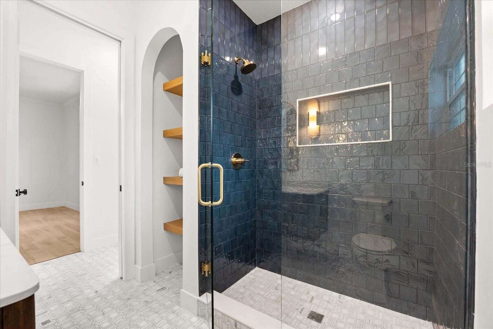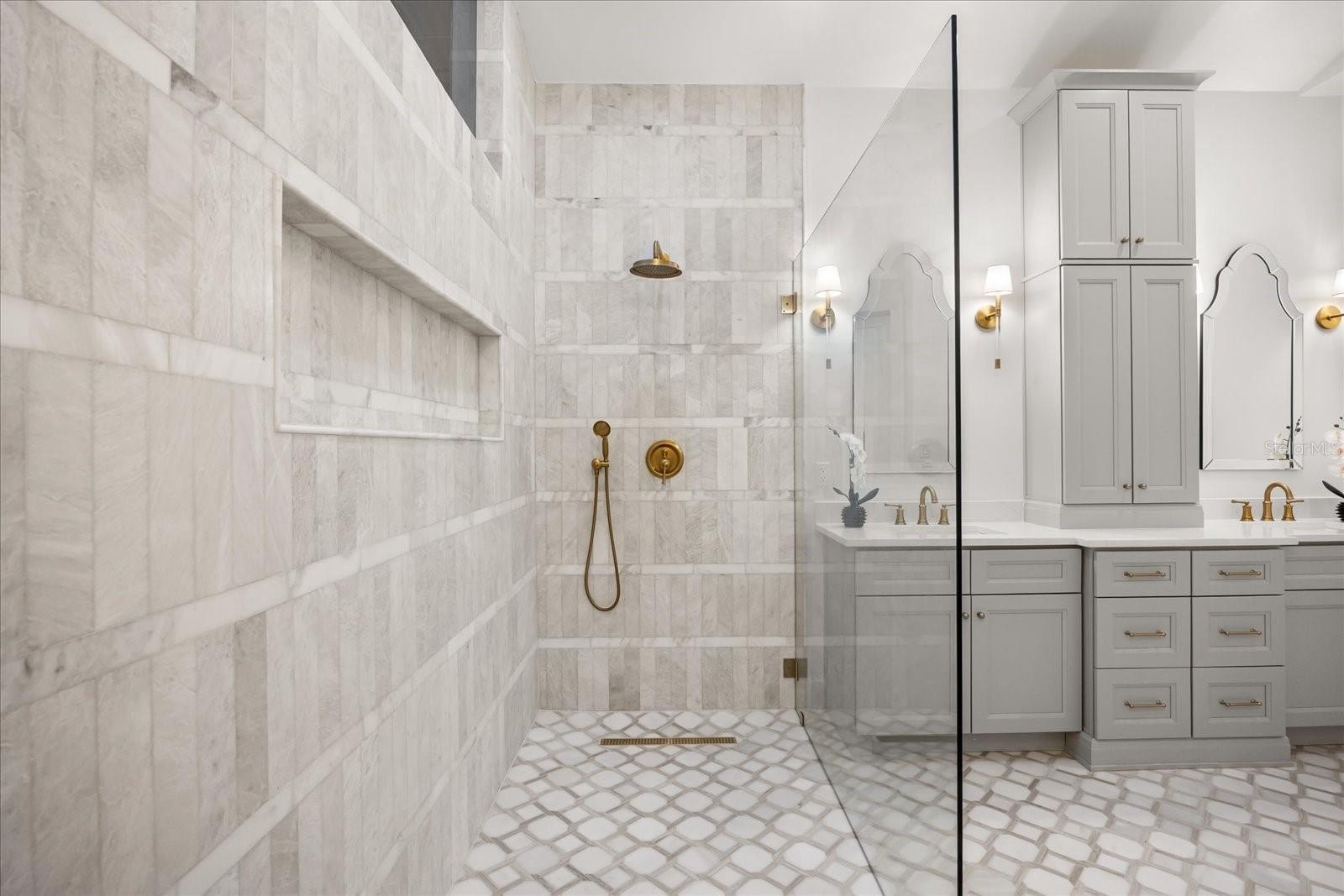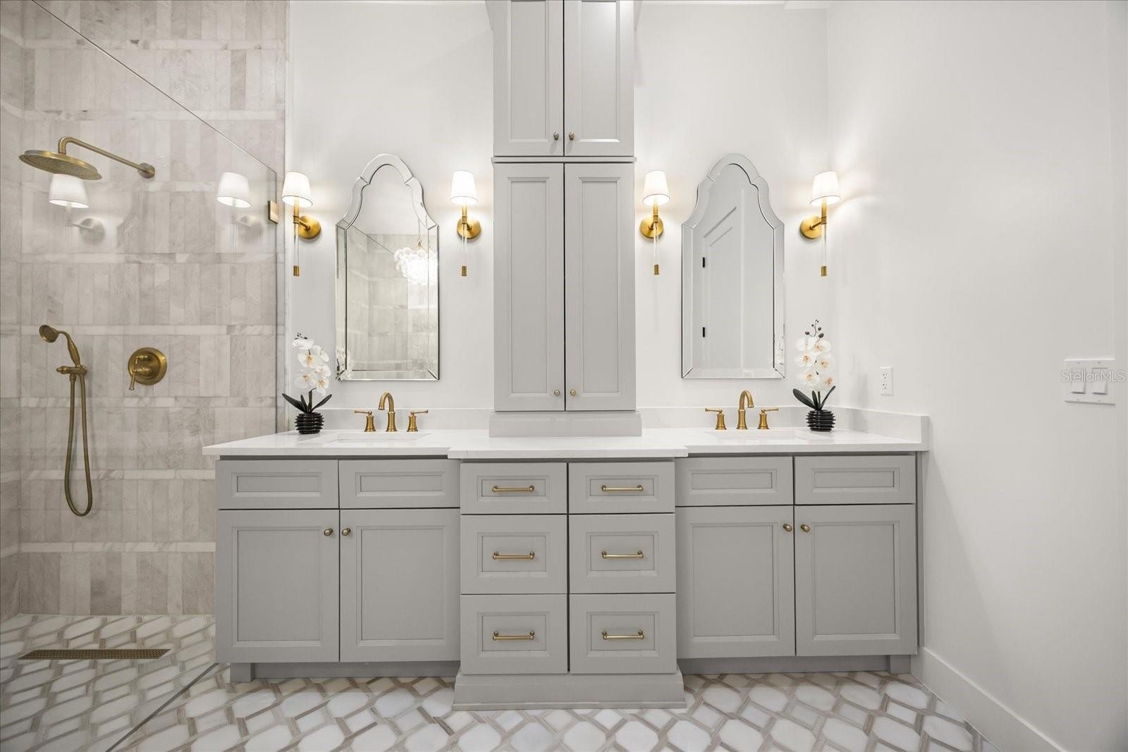 A split plan introduces the primary suite — vaulted, private, composed. A sculptural chandelier anchors the ceiling while tailored wall moldings define the room. Dual concealed walk-in closets preserve symmetry. The primary bath is a statement of design: matte stone soaking tub beneath clerestory light, full-height stone extending into a curbless marble shower, dual tailored vanities with brushed brass accents, and patterned marble floor grounding the space in immersive opulence. An adjoining vaulted extension captures pool views and opens to the lanai.
