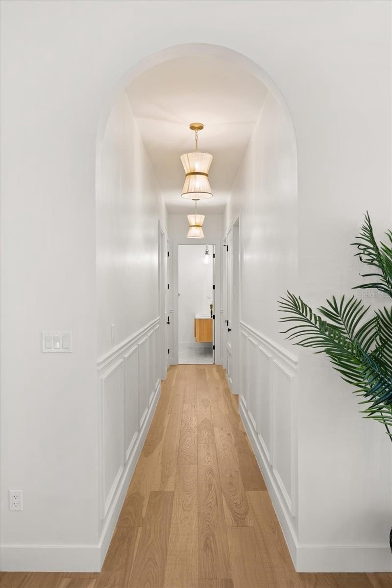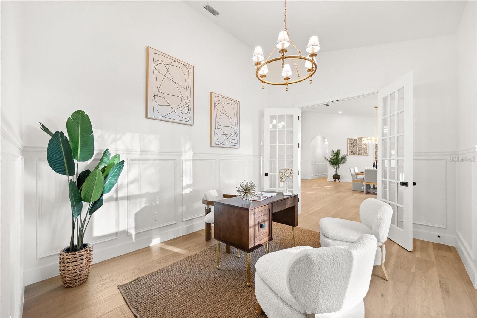 A formal office behind glass French doors offers focused productivity and polished presentation. An arched corridor leads to the secondary wing where three additional bedrooms offer privacy and versatility. One suite provides direct exterior access, functioning as a cabana retreat with its own en suite bath — ideal for guests or seamless indoor-outdoor living.