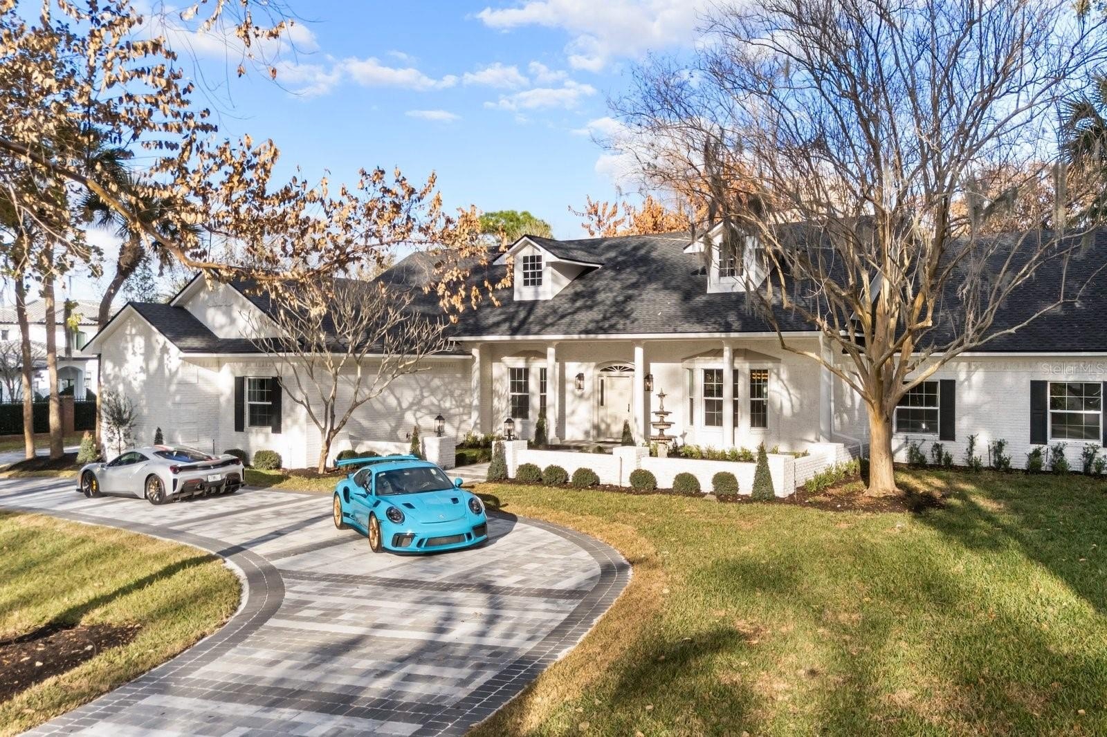 Set on a rare private acre within one of Windermere’s most privately held enclaves— this white-painted brick estate makes an immediate architectural statement. A circular motor court, tiered fountain, and mature canopy trees establish presence before you ever step inside.