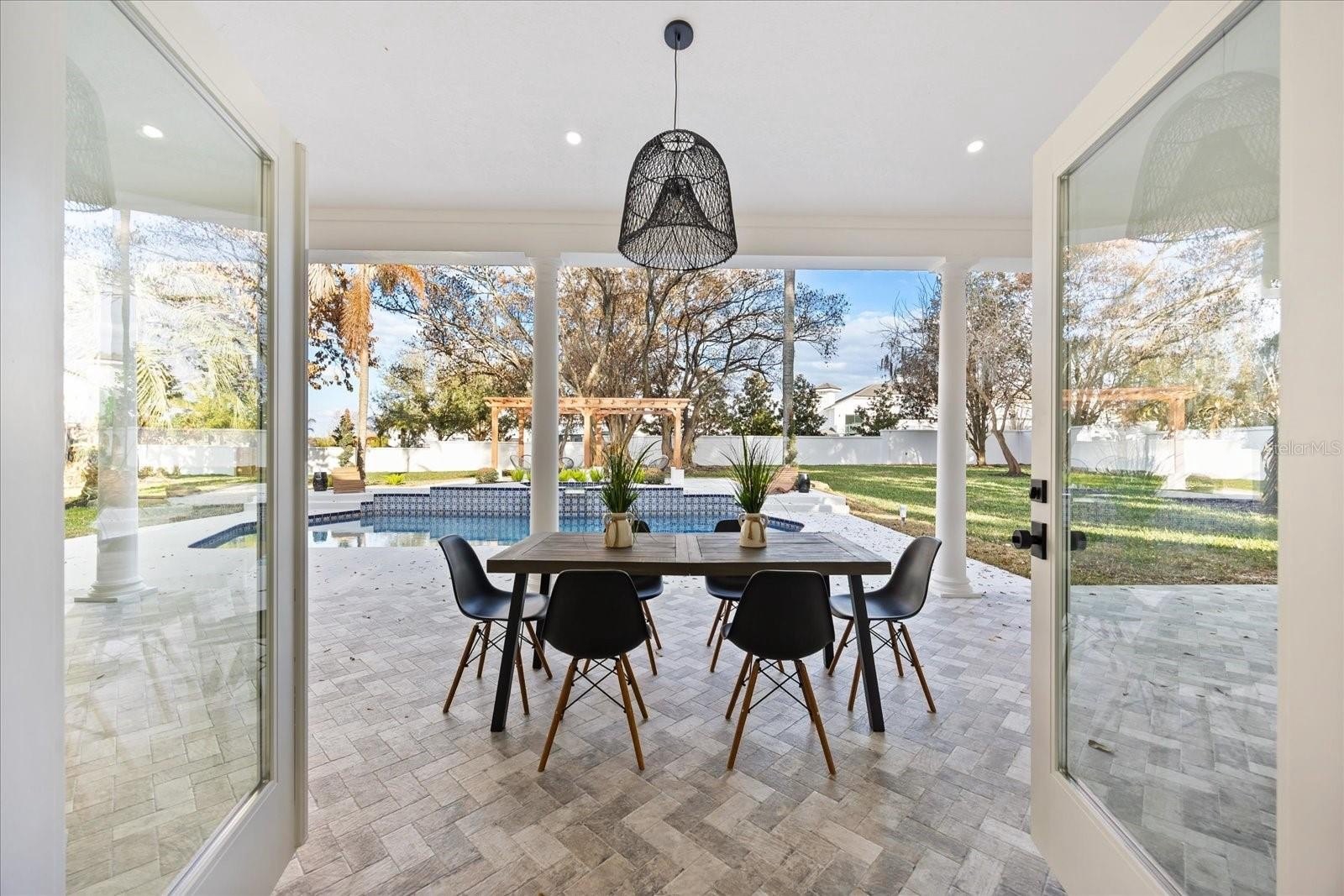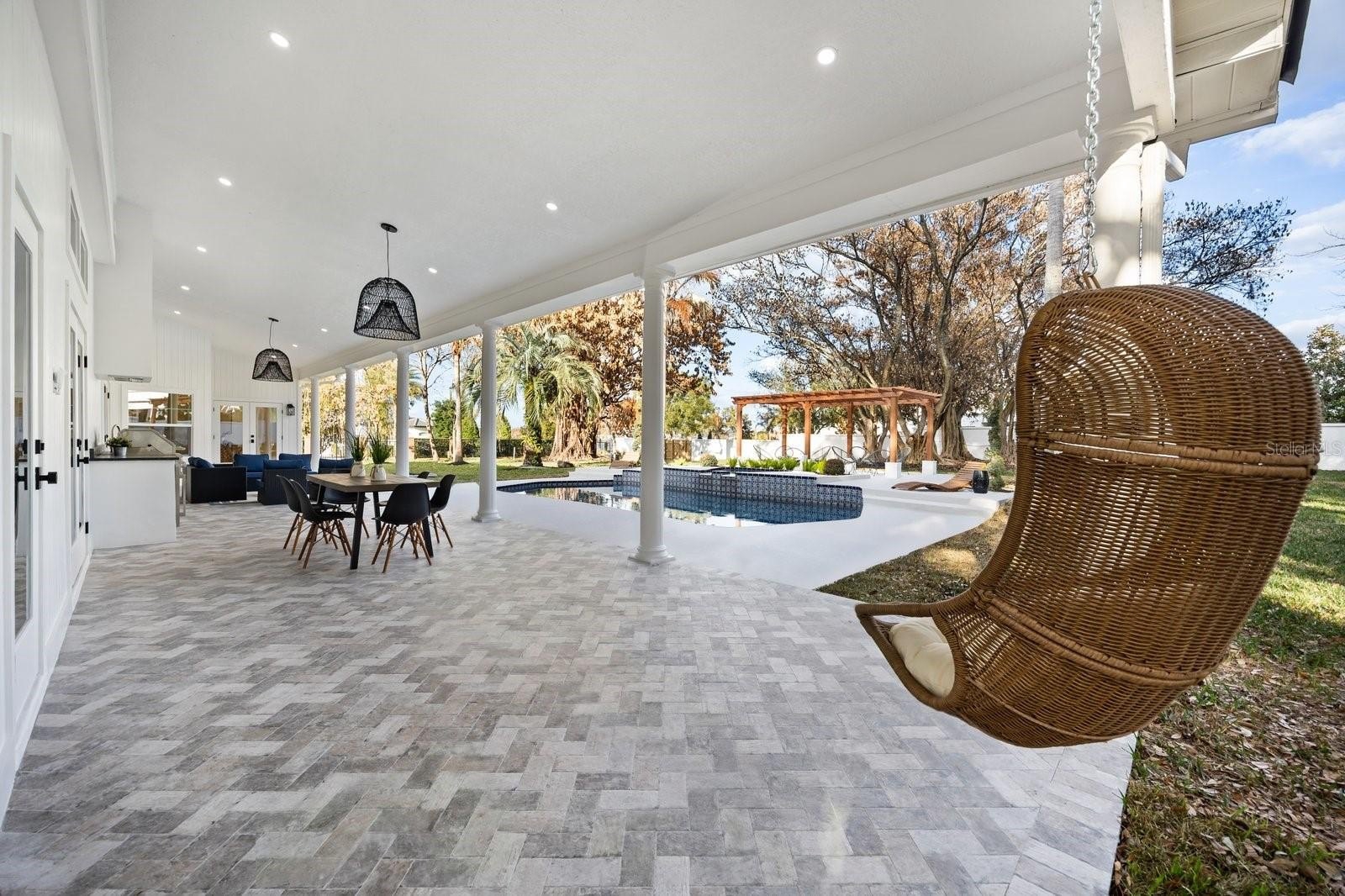 Outdoors, the property transforms into a private compound. A covered veranda spans the rear with classical columns and herringbone flooring. The fully equipped summer kitchen, custom wood pergola lounge, expansive lawn, fresh sod, rear gate access, and lush landscaping offer scale impossible to replicate in today’s market.