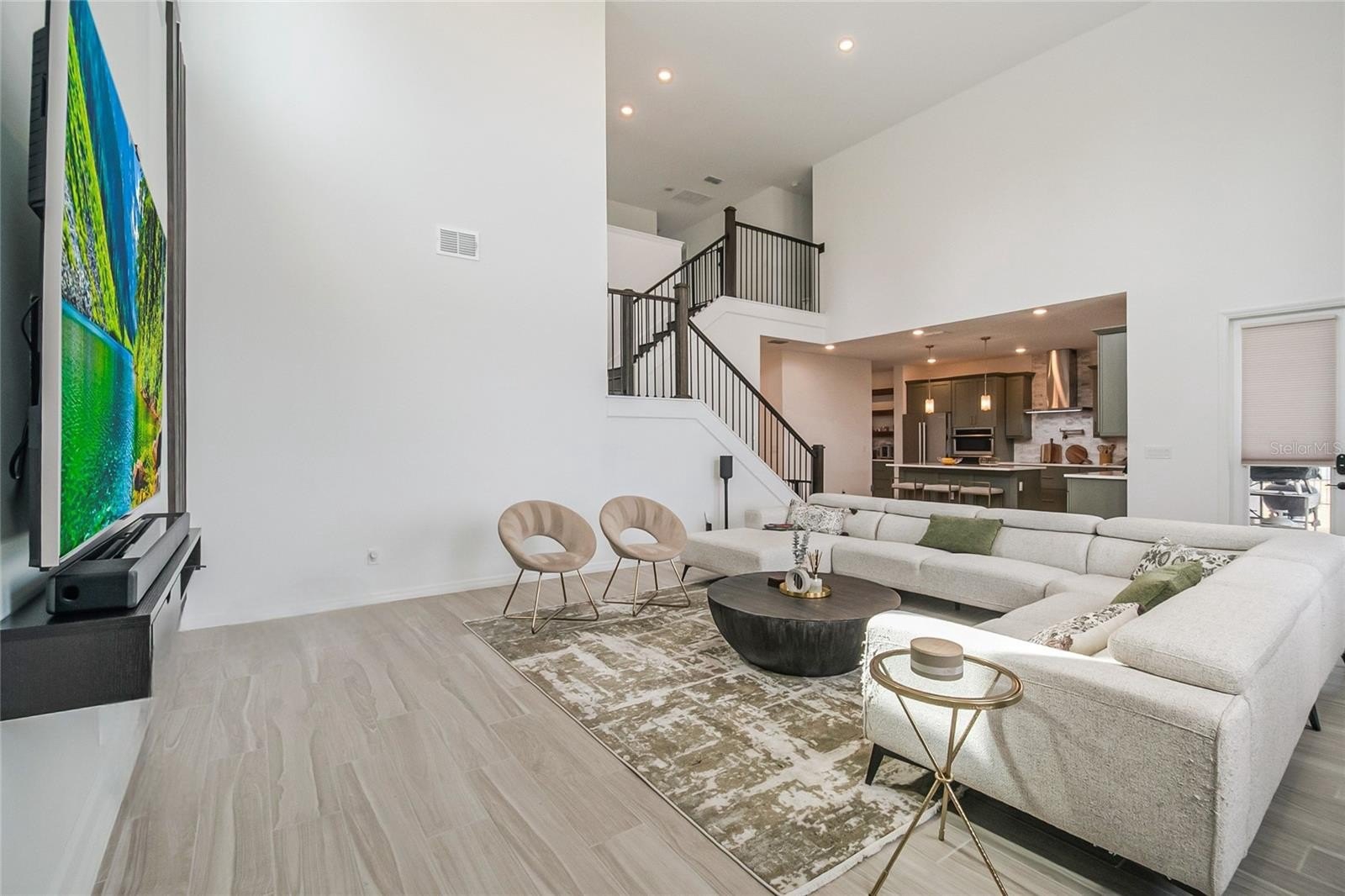The oversized 3-car garage includes epoxy flooring and two EV chargers. Exterior highlights include a 5-foot metal fenced yard and screened lanai. Interior upgrades feature remodeled kitchen with upgraded cabinetry and stone backsplash, smart French-door refrigerator, wine cooler, smart dishwasher, smart vent hood, LG washer and dryer with pedestals, designer accent walls, upgraded chandeliers, 20-foot custom curtains, and automated smart blinds.