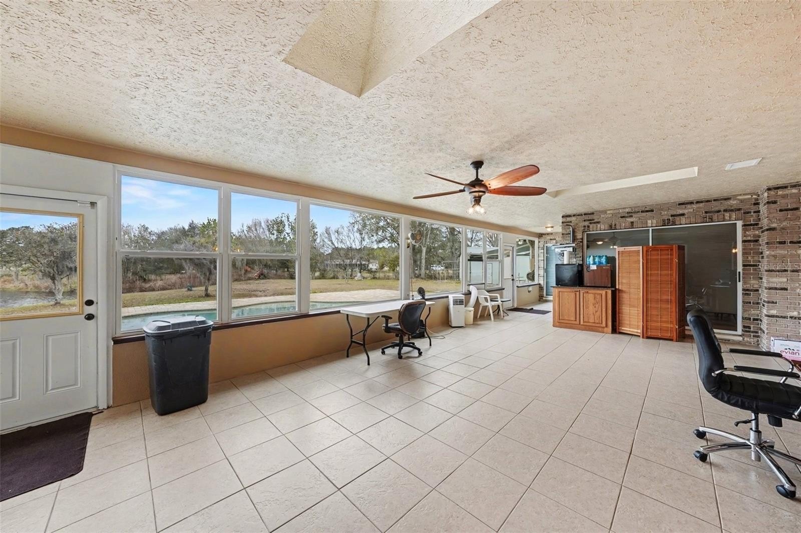 Welcome to 31835 Cromwell in Wesley Chapel — a unique 1.72-acre waterfront property offering privacy, functionality, and exceptional versatility with no HOA or CDD. This 3-bedroom, 3-bath home features hardwood floors in the dining room and sunken formal living room, tile throughout the main living areas, and multiple skylights that fill the home with natural light. A windowed sunroom under heat and air provides additional flexible living space overlooking the pond and pool. The living area is anchored by a fireplace, and the kitchen includes granite counters and a hidden gem pantry with extensive cascading shelving. Kitchen also has a floating/moveable island, black appliances, and a breakfast bar. The primary suite includes an updated bath with a garden tub, separate shower, and thoughtful finishes. Major updates include a roof replaced in 2018 and A/C installed in 2019. The home is also equipped with a water conditioner system and reverse osmosis at the kitchen faucet. Outdoors, enjoy an in-ground pool and tranquil pond frontage within a fully fenced property secured by an electric gate. The pool area features a 10’ retractable awning. The property is serviced by a well and septic and includes a 26kW whole-house generator that can power the home and both workshops. For those needing workspace or storage, the two detached workshops are a standout feature. The larger 60' x 25' workshop offers A/C, heat, electric, private office space, and a half bath, while the second 24' x 18' building also includes electric — ideal for hobbies, business use, equipment storage, or additional storage needs. A rare opportunity to own acreage with water frontage, extensive improvements, and room to live and work — all in a convenient Wesley Chapel location.