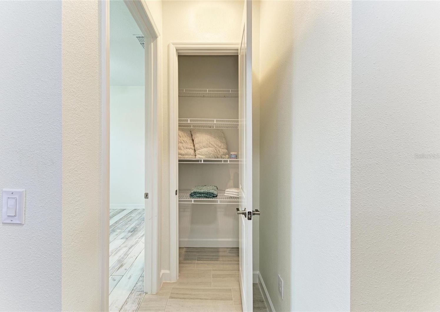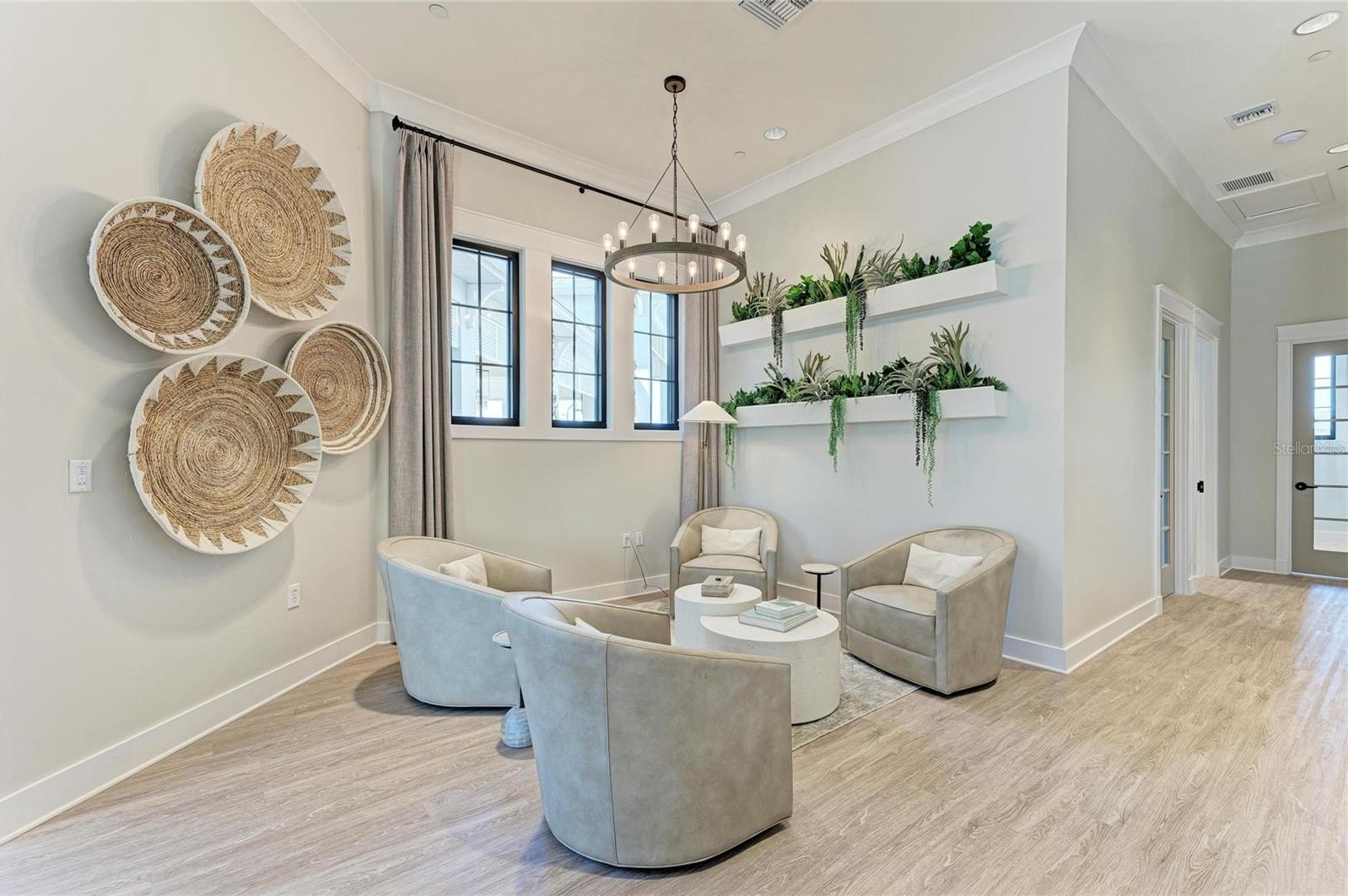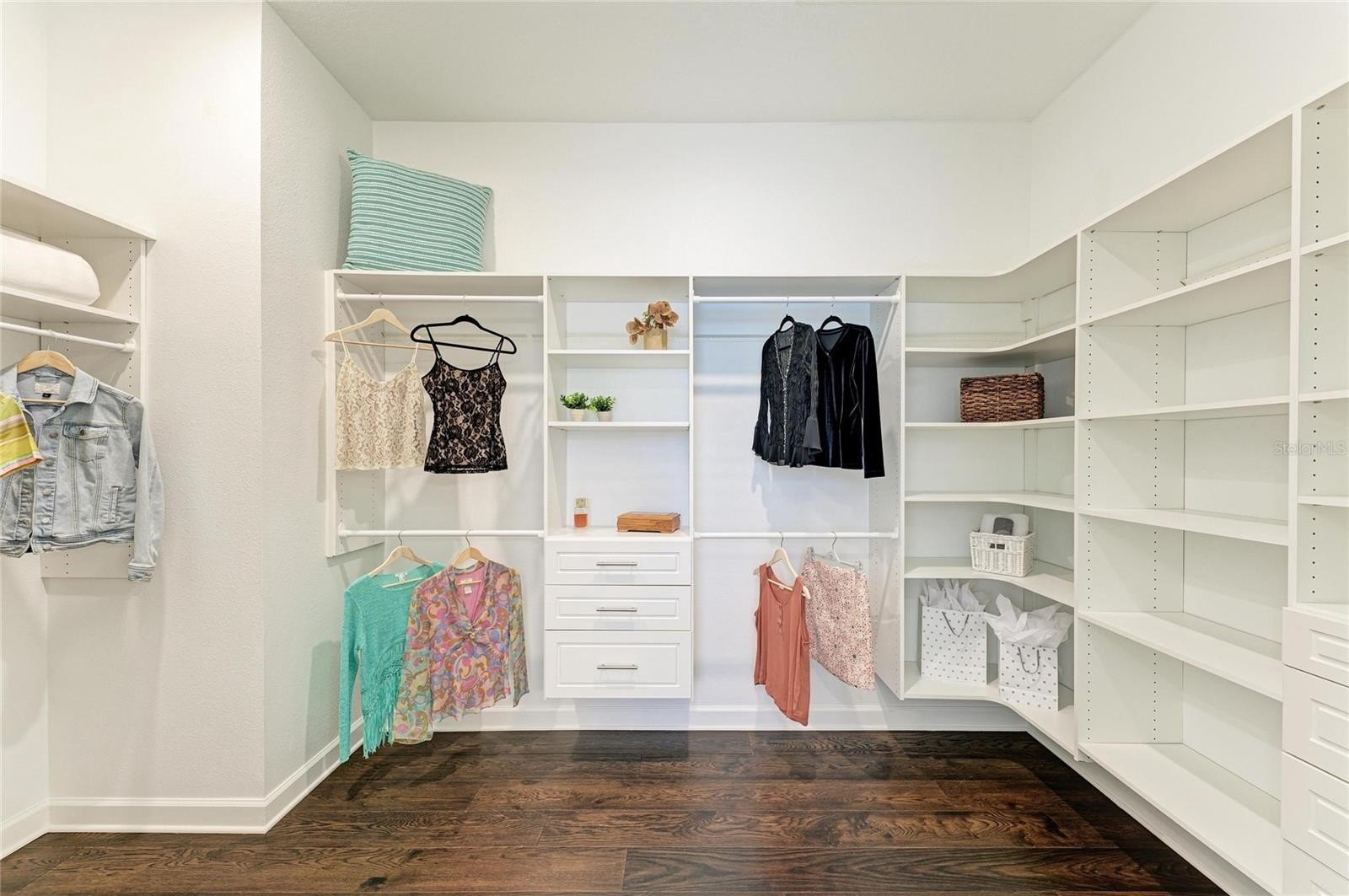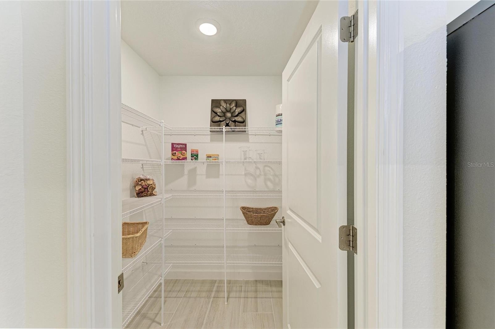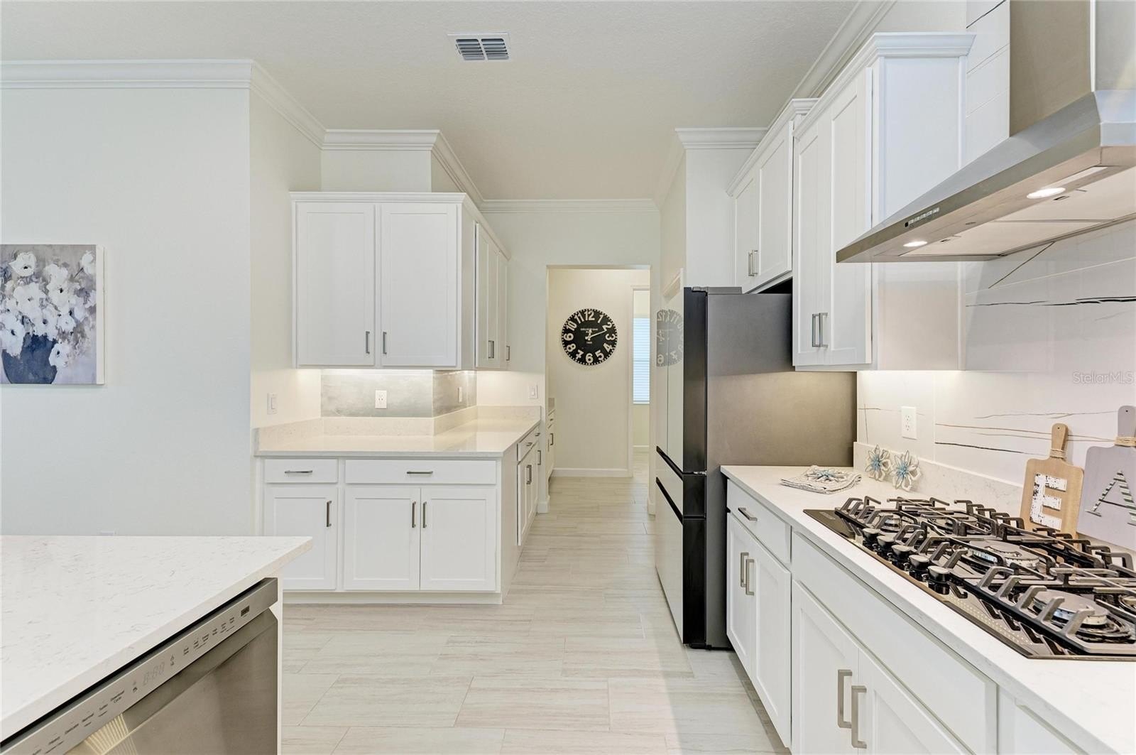 This home truly shines with its extensive upgrades, including high-end appliances—a Samsung Bespoke refrigerator, LG dishwasher, and Empava gas range—along with crown molding, a porcelain kitchen backsplash, luxury vinyl plank flooring in bedrooms two and three, and luxury wood plank flooring in the primary suite. The laundry room is fully outfitted with cabinetry above the Samsung top-load washer and dryer, additional base cabinetry, and a granite countertop. Extended shelving in every closet adds smart storage, and the custom primary closet elevates everyday living.