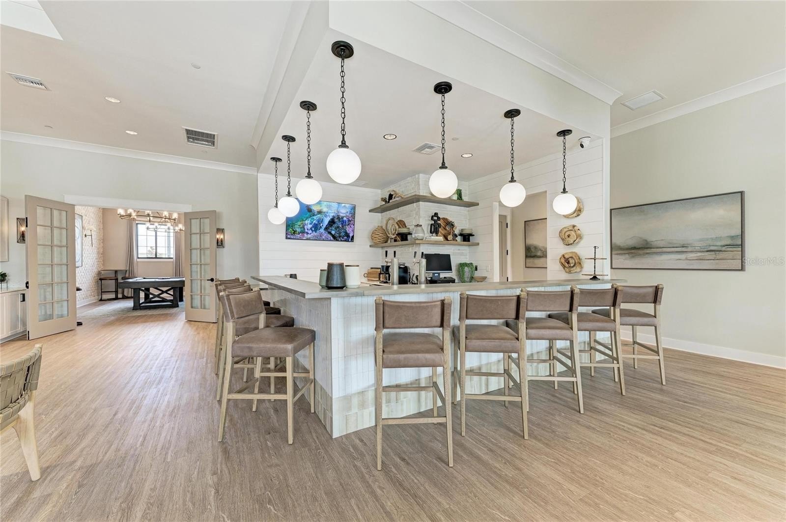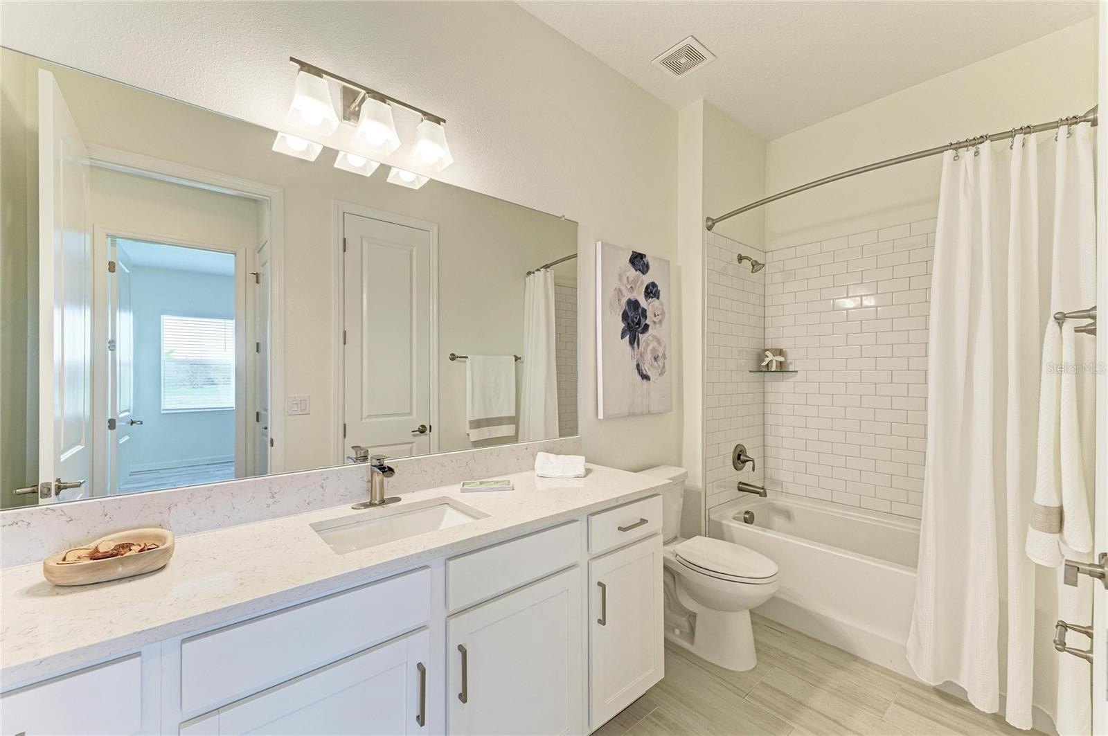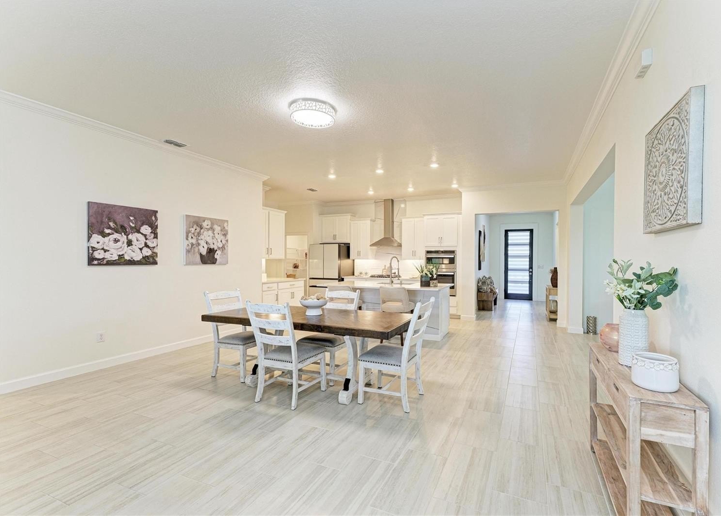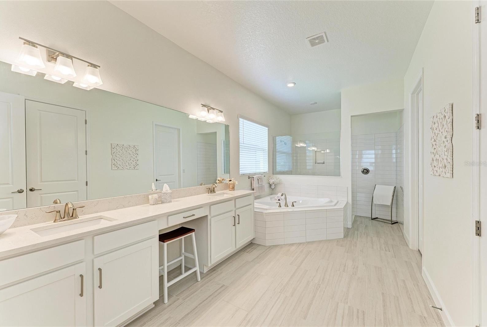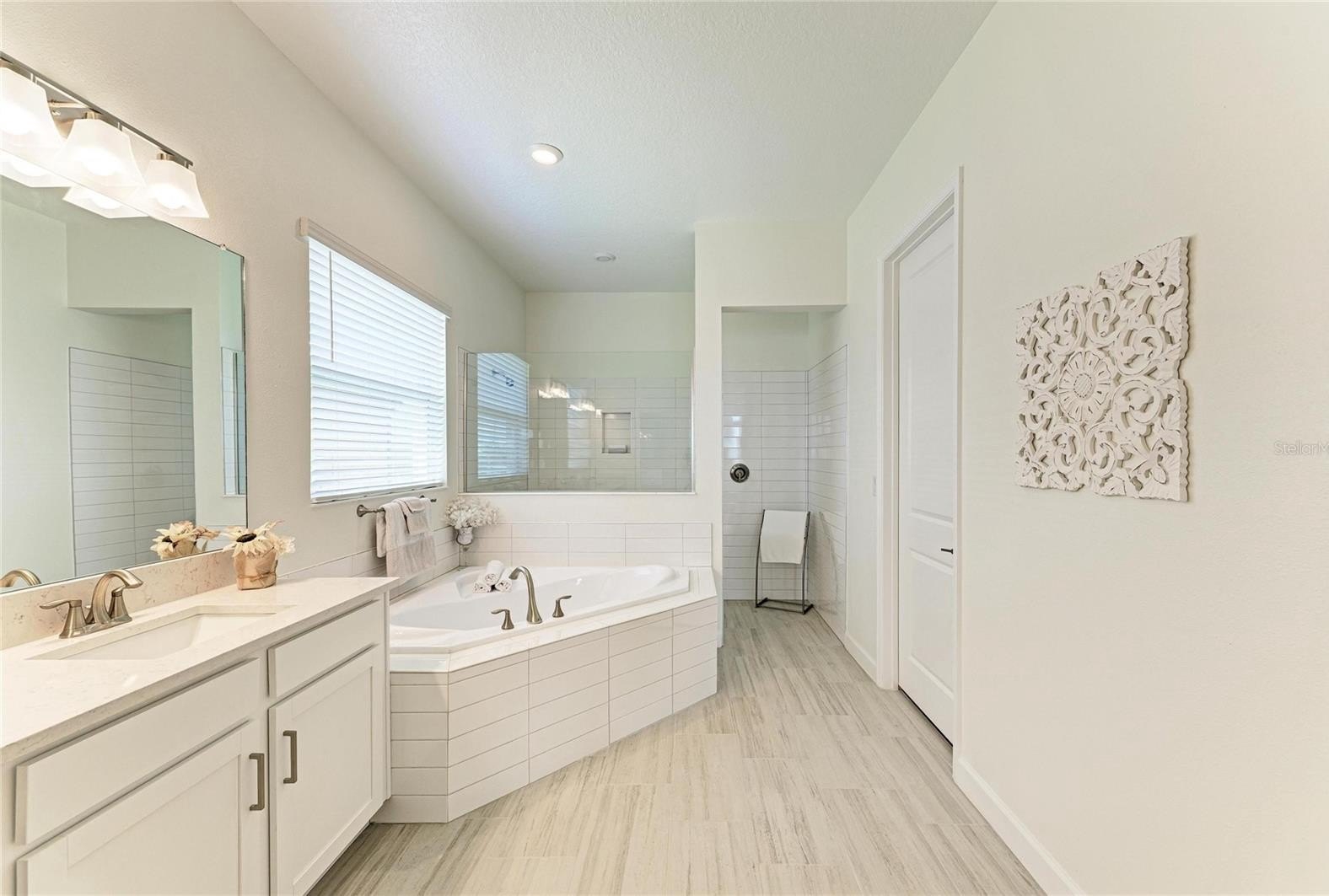 This home truly shines with its extensive upgrades, including high-end appliances—a Samsung Bespoke refrigerator, LG dishwasher, and Empava gas range—along with crown molding, a porcelain kitchen backsplash, luxury vinyl plank flooring in bedrooms two and three, and luxury wood plank flooring in the primary suite. The laundry room is fully outfitted with cabinetry above the Samsung top-load washer and dryer, additional base cabinetry, and a granite countertop. Extended shelving in every closet adds smart storage, and the custom primary closet elevates everyday living.