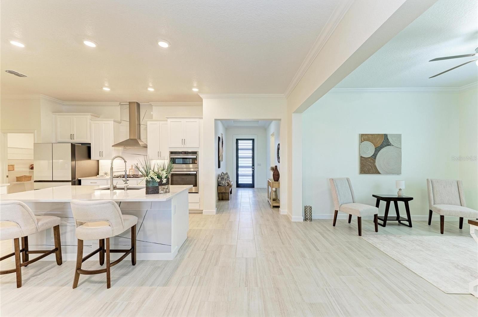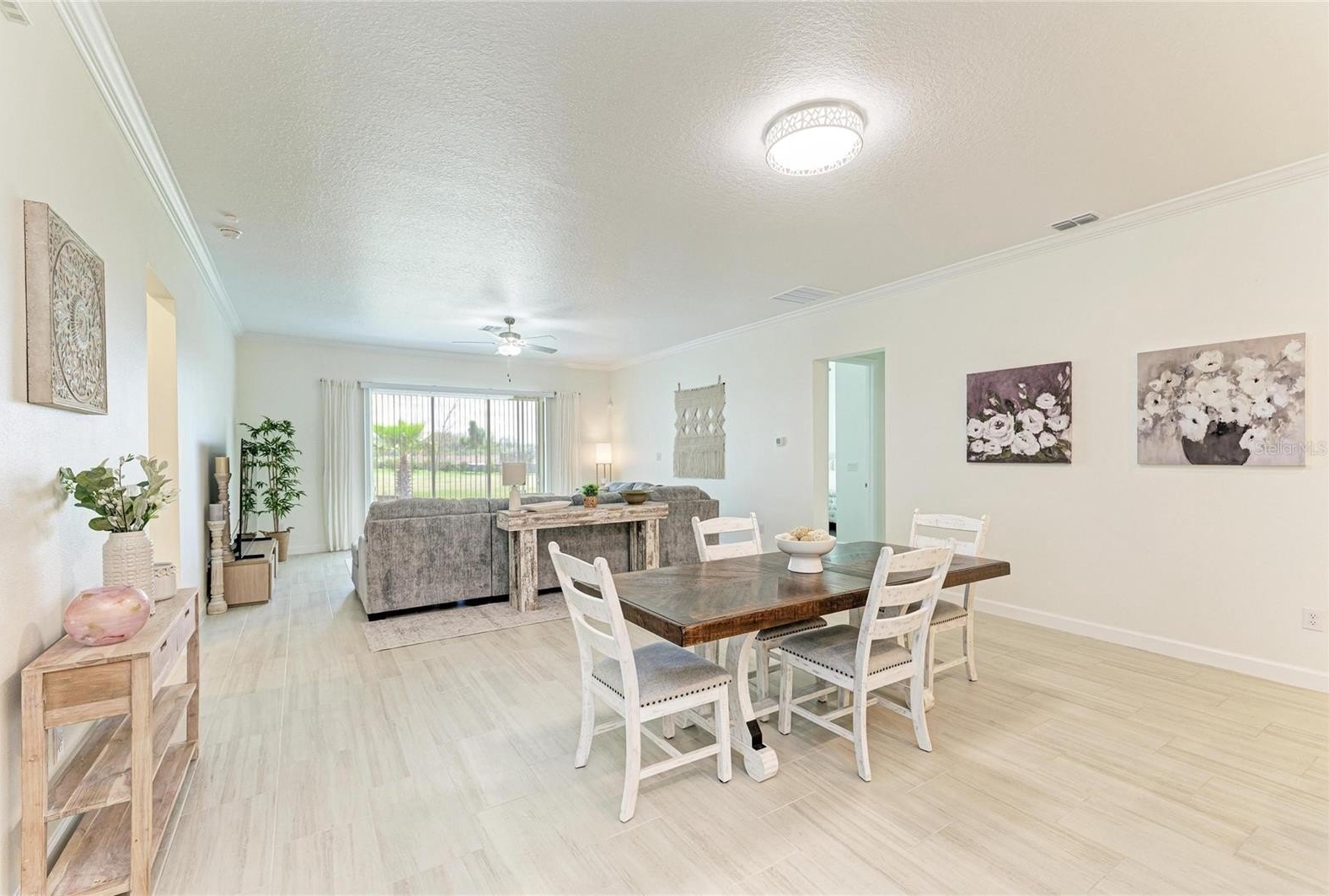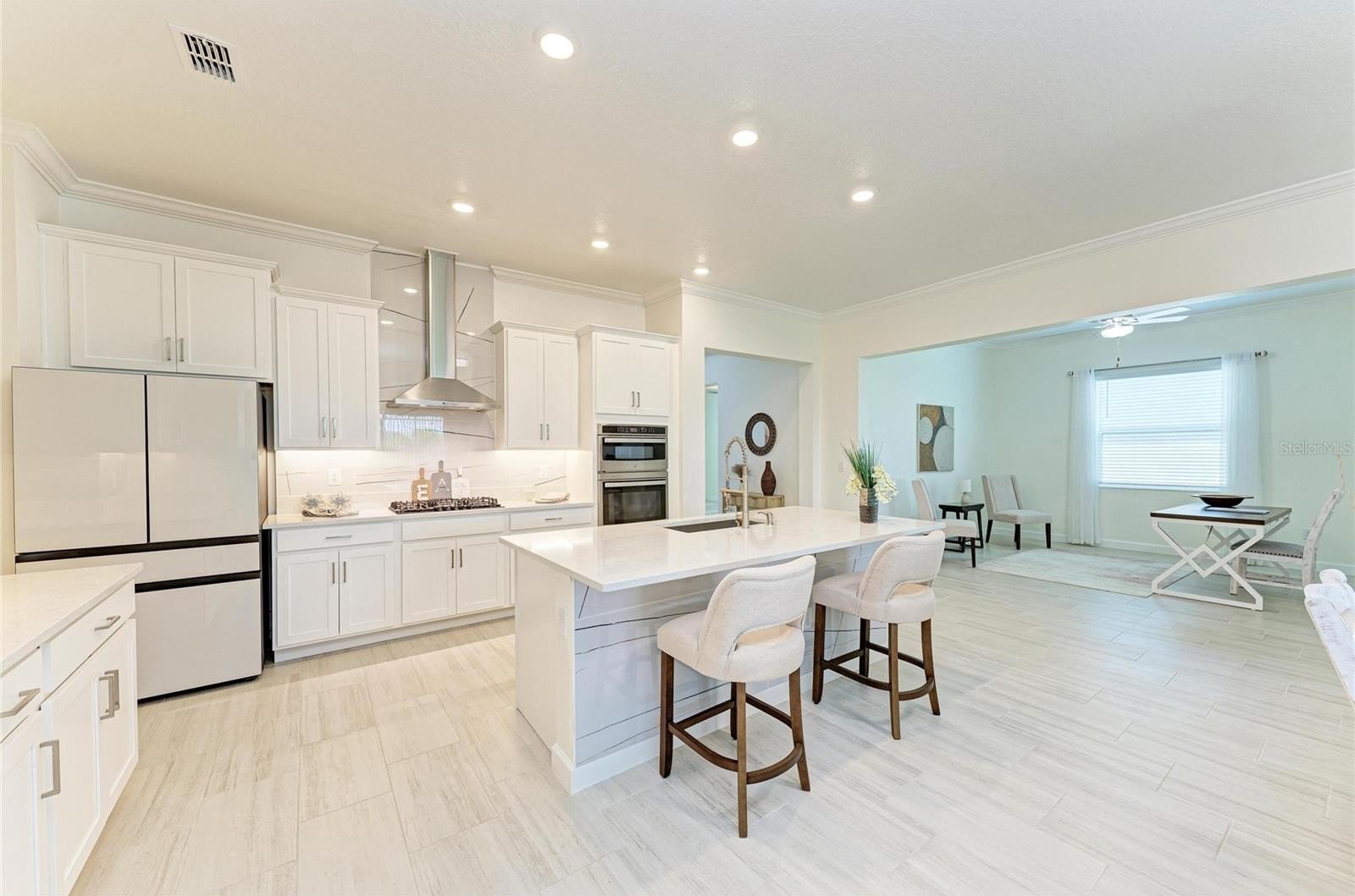 The open-concept layout seamlessly connects the kitchen, dining, and family room, creating a bright, inviting space that opens to a private screened-in lanai—perfect for relaxing or entertaining. A versatile flex room adds functionality, while all bedrooms are privately situated, including a lavish owner’s suite with a beautifully customized walk-in closet and spa-like bath.
