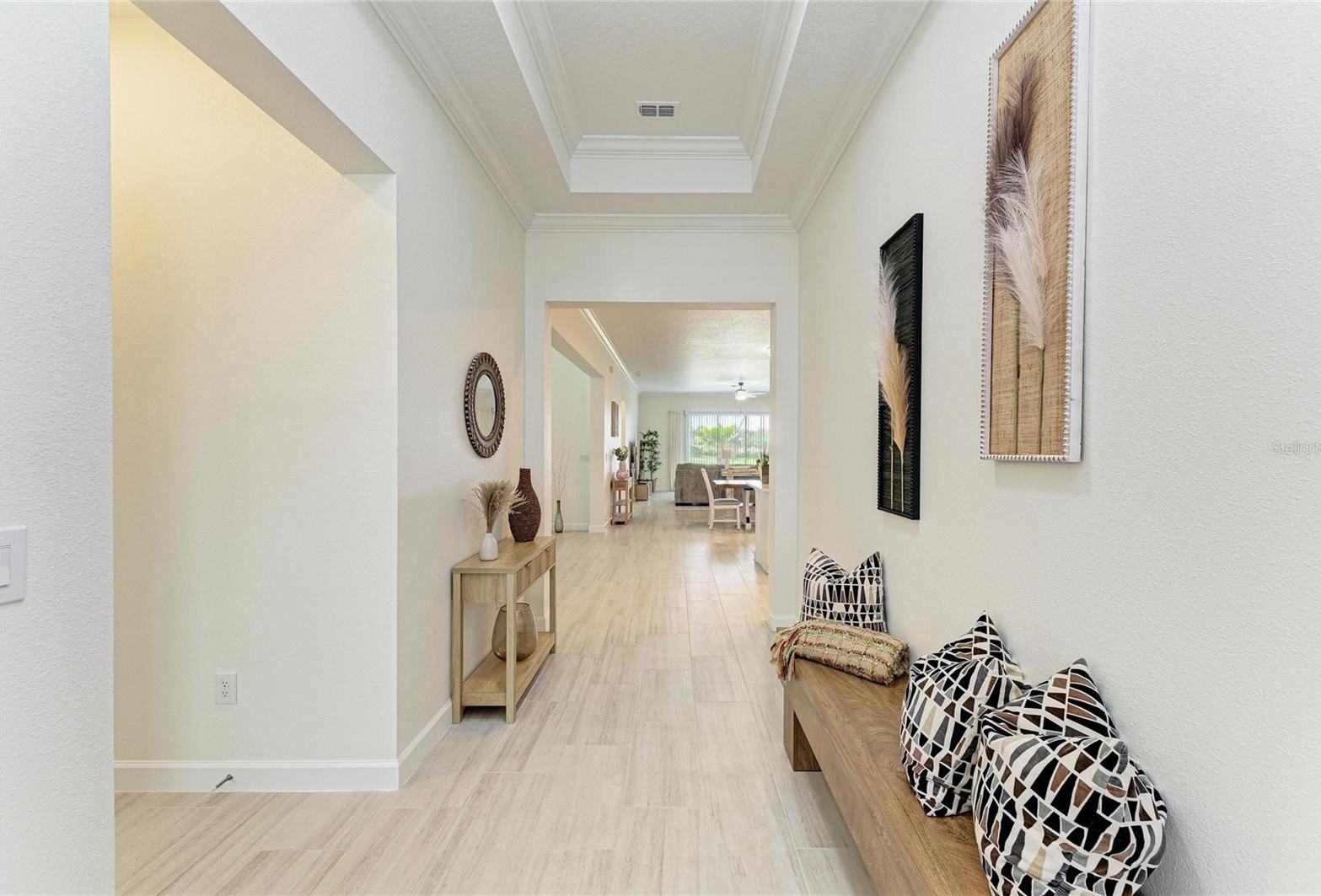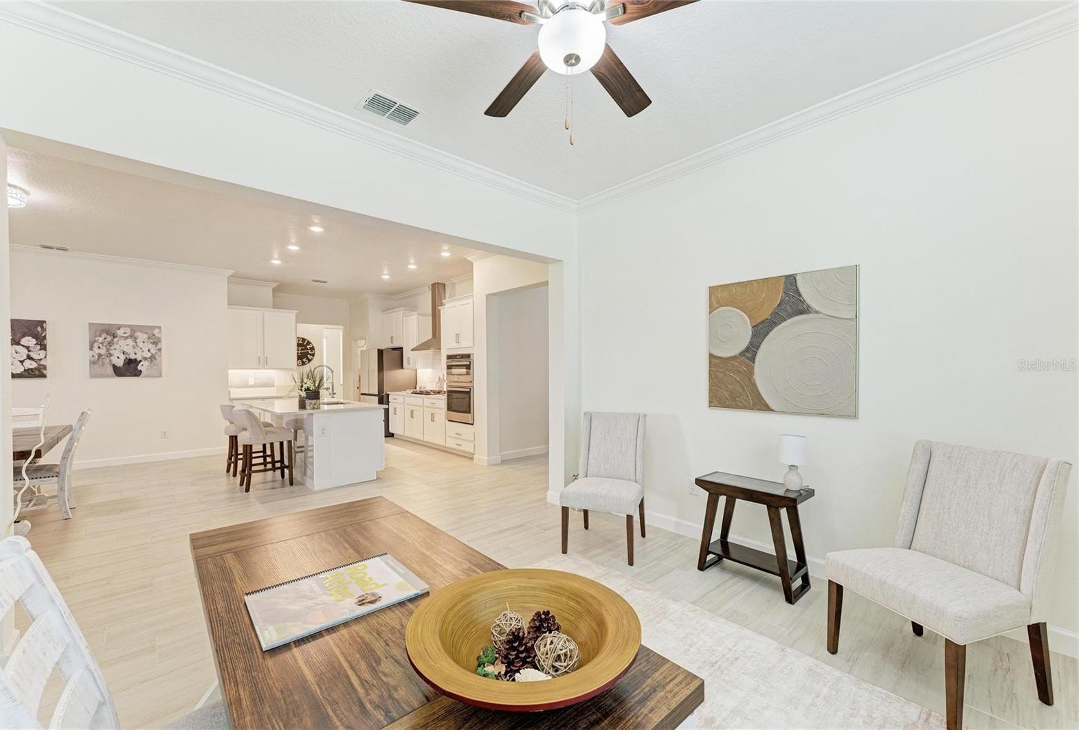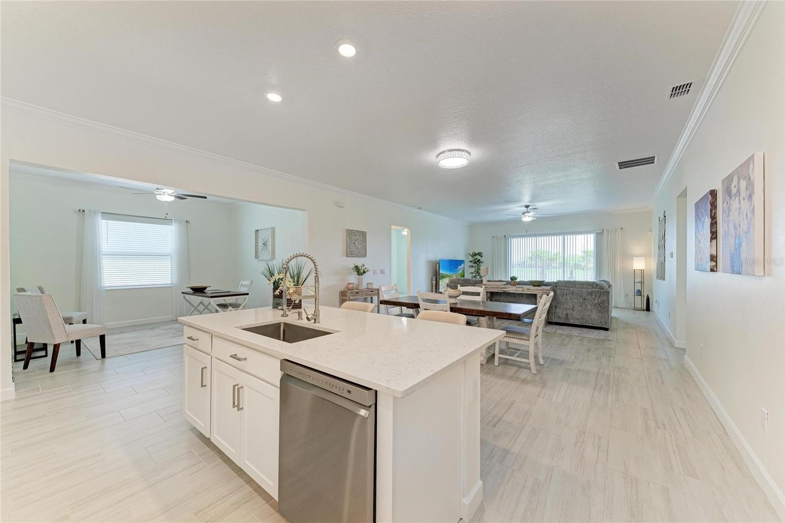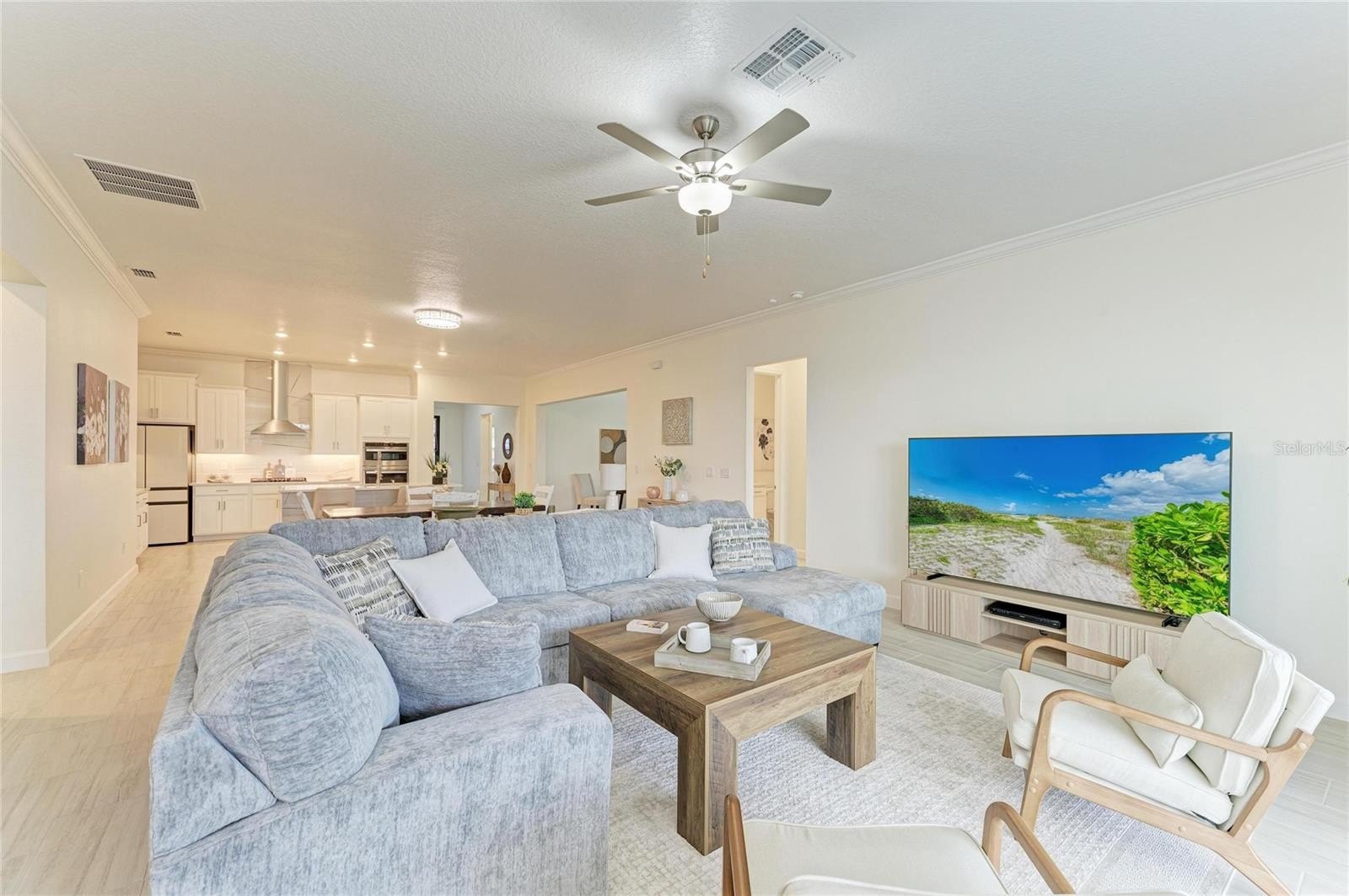 The open-concept layout seamlessly connects the kitchen, dining, and family room, creating a bright, inviting space that opens to a private screened-in lanai—perfect for relaxing or entertaining. A versatile flex room adds functionality, while all bedrooms are privately situated, including a lavish owner’s suite with a beautifully customized walk-in closet and spa-like bath.