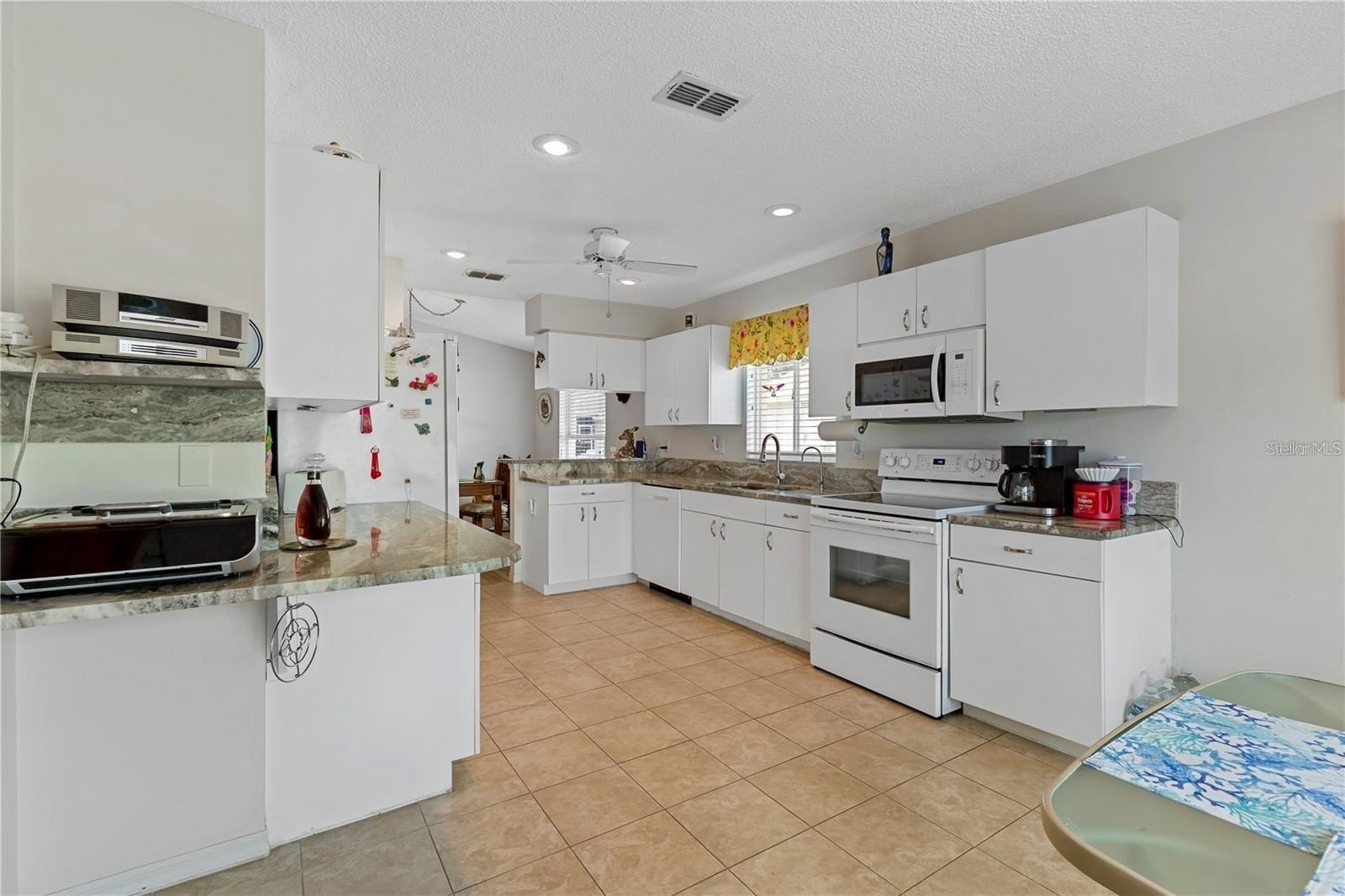 As you enter through the enclosed front entry and step into the foyer, you are immediately greeted by a tranquil view of the pond and scenic nature trails beyond. These picturesque paths are perfect for walking, biking, or golf cart cruising, and it’s not uncommon to see neighbors fishing along the water’s edge. This serene setting can be enjoyed from multiple rooms in the home, including the Great Room, Kitchen, Florida Room, and the spacious Primary Bedroom.