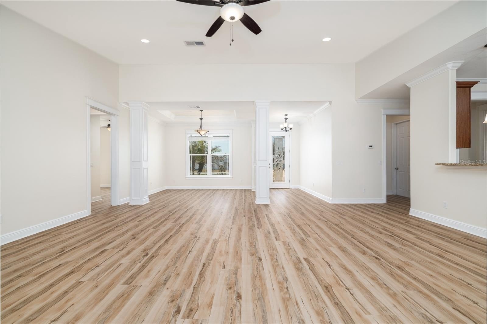 Experience the pinnacle of coastal living in the highly coveted Silversands community of New Smyrna Beach. Situated just steps from the Atlantic Ocean, this spacious "high-and-dry" residence offers the perfect blend of seaside serenity and classic design, beginning with an elegant paver driveway leading to a spacious two-car garage. Inside, this 3 bedroom 2 bathroom home breathes with airy 9’ 2” ceilings, an open floor plan and beautiful windows providing plenty of natural light. Architectural details abound, from the vaulted Great Room to the elegant tray ceilings and crown molding found in both the Formal Dining Room and the Primary Suite. Every inch has been refreshed with newly installed luxury vinyl plank flooring and a crisp, modern paint palette inside and out. The kitchen features granite countertops and a breakfast nook area, while the separate laundry room provides ample storage. Schedule your private tour today—a home of this caliber in Silversands will not last long. Turn your beachside dreams into a reality in this move-in-ready sanctuary.