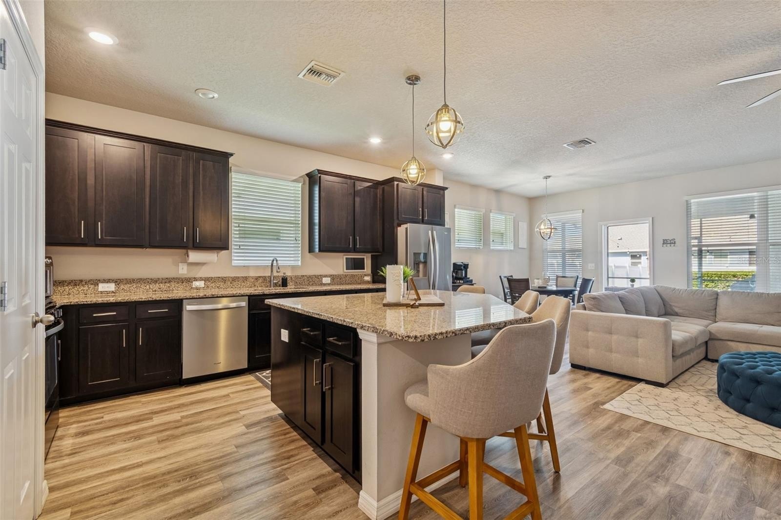 The elegant kitchen boasts 42” espresso cabinets with 2” crown molding, stainless steel appliances, granite countertops and an oversized island with seating. The open-concept floor plan seamlessly connects the kitchen, dining area, and family room, creating an ideal space for everyday living and entertaining. The family room overlooks a large screened lanai, with an additional paver patio perfect for grilling and outdoor seating.