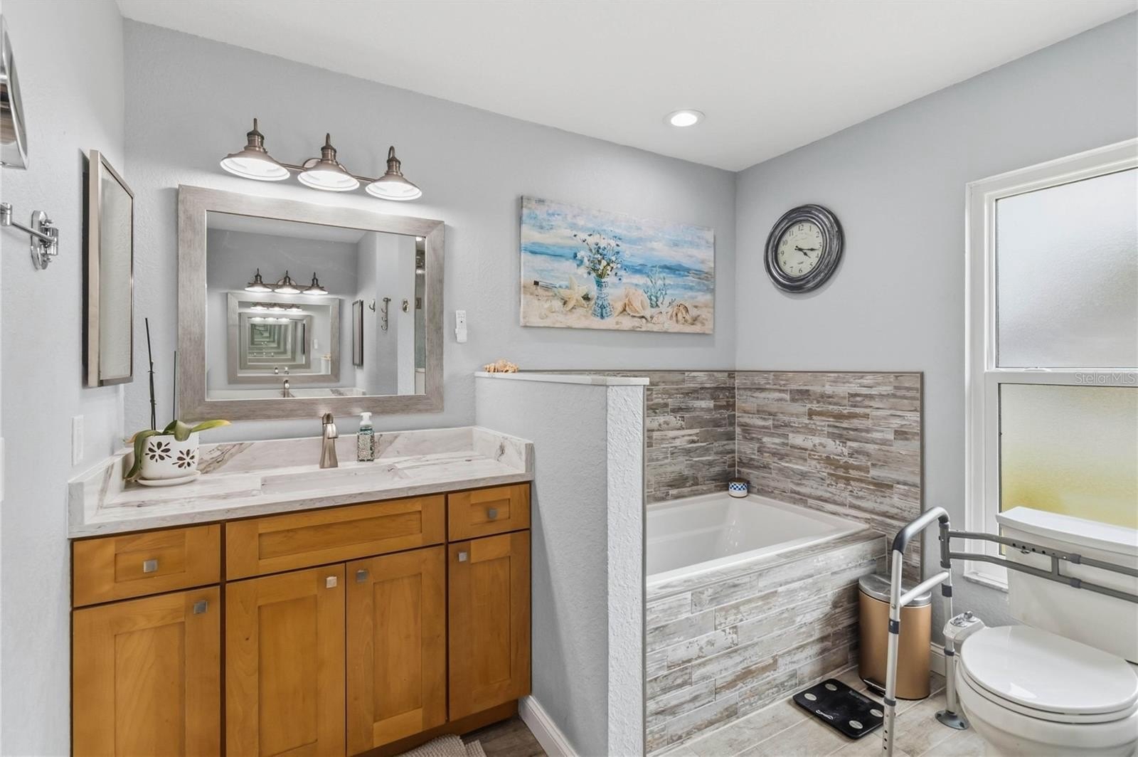Welcome, this renovated great Decor' 3-bedroom, 2-bathroom home located in the highly desirable Canoe Creek Woods community. New roof 2024. New Generic generator. New double pane windows Feb. 2026.Front porch screened in for added shade. Step inside through the custom glass front door greeted by soaring cathedral ceilings and an open-concept family room with natural light from the Palladian window. Laminate with a natural hardwood look. Custom paint throughout. Sliding glass doors lead you to a serene, covered lanai overlooking the private, perfect for entertaining or unwinding in your own backyard oasis. The fully fenced backyard features landscaping for added privacy with lights and a Patio deck. Kitchen features all new stainless-steel appliances with a convection oven, Granite countertops, under counter lighting and extra cam lights. Large pantry with custom shelving. The expansive master suite offers direct access to the lanai from the sliding glass door and boasts two oversized walk-in closets with custom closet shelving and a spacious en-suite bath complete with a garden tub, 2 separate vanities with quartz countertops and separate shower. Ceiling fans with lights in all the rooms, even the primary bathroom. 2nd Bedroom features a chair rail, nice custom closet and shelving. Inside laundry room features a new washer and dryer, Cabinets for great storage and a new Electric tankless hot water heater. Garage features a painted floor, Pull down attic access with light in the attic and remote pully storage shelves for all your season items. Carbon dioxide detectors installed when the new generic generator was installed. Canoe Creek Woods offers a peaceful neighborhood setting with unbeatable convenience—just minutes from Florida’s Turnpike, Royal Saint Cloud Golf Course, public transportation, Central Florida attractions, and even the beaches of Brevard County. Don’t miss the opportunity to make this inviting home your own!