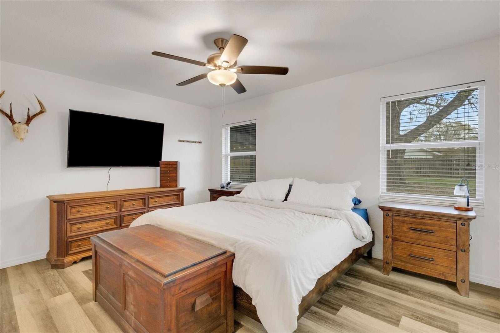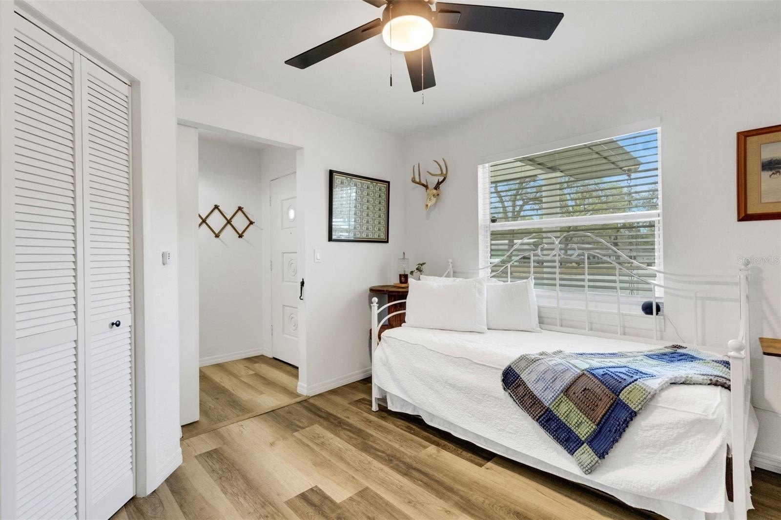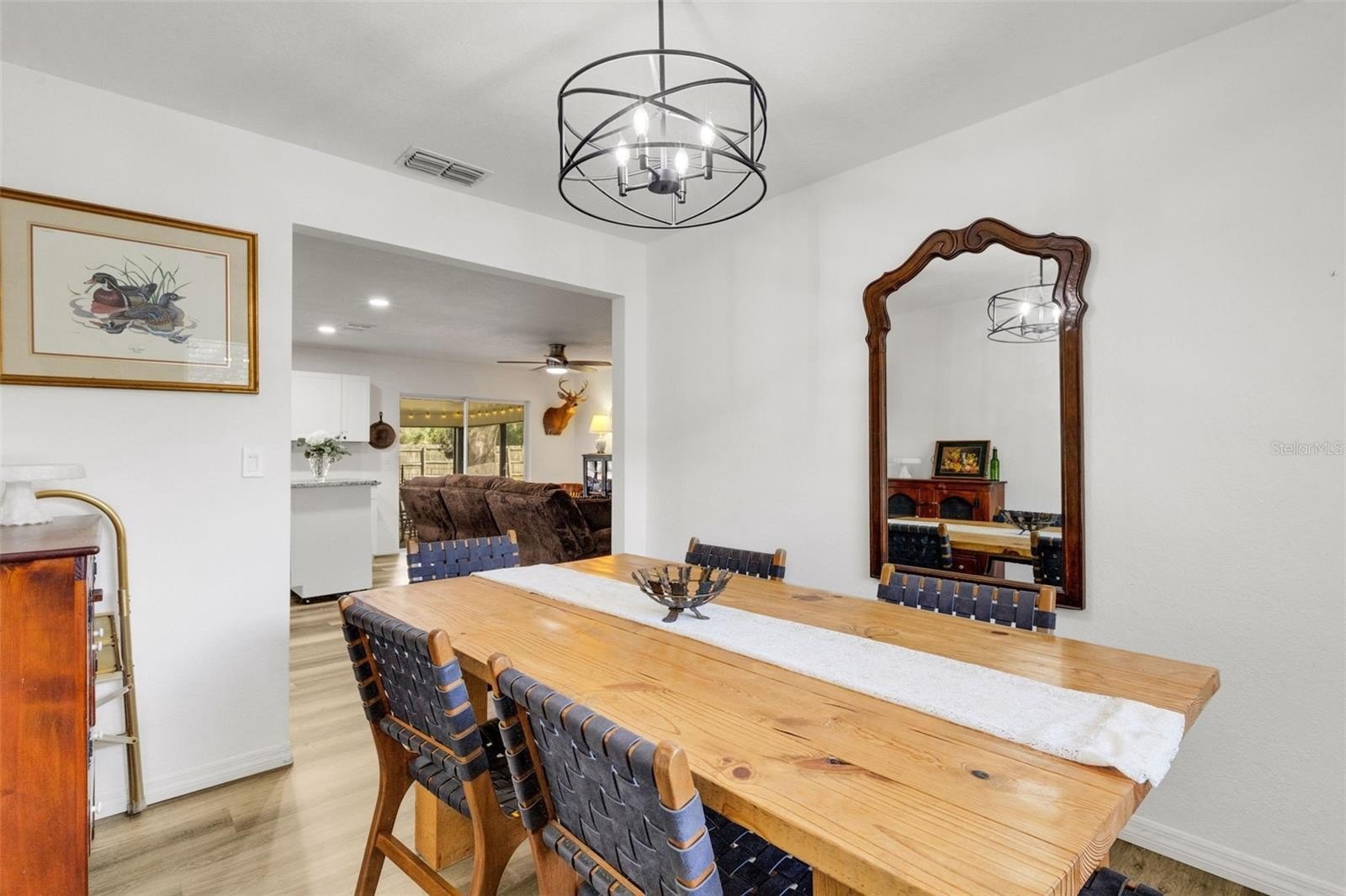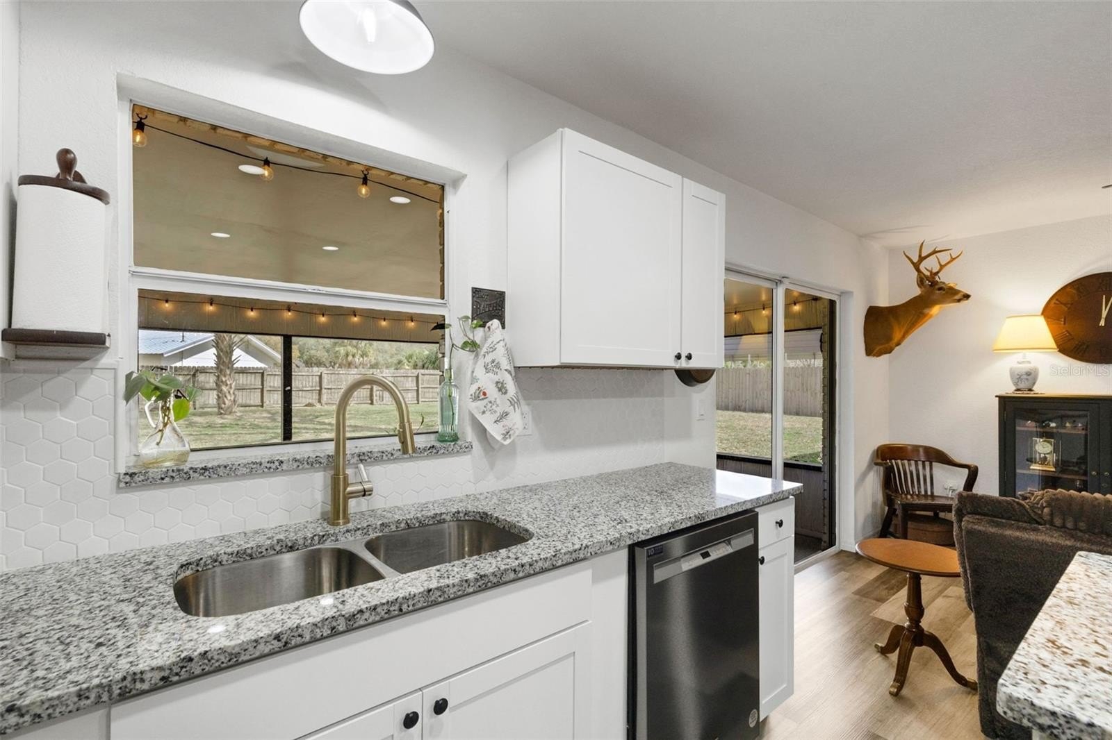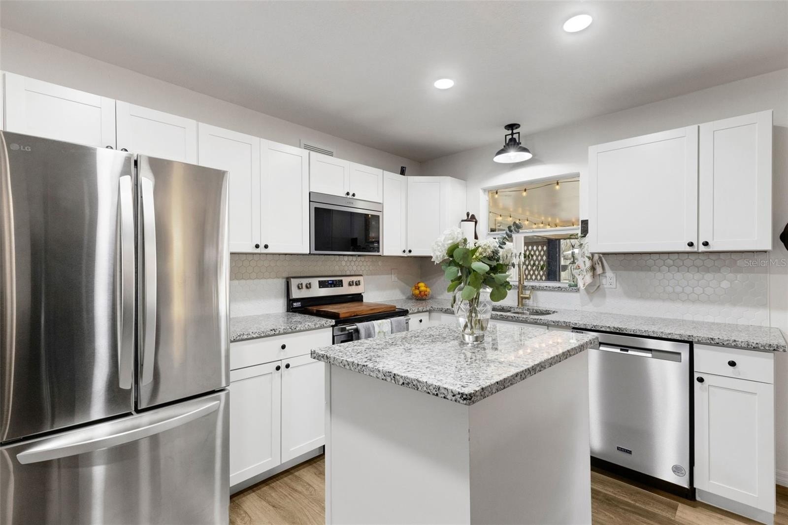 Step inside to an open-concept layout featuring luxury vinyl plank flooring throughout and a light, bright interior. The fully renovated kitchen is the heart of the home, showcasing white raised-panel cabinetry, granite countertops, stainless steel appliances, a pantry, and a center island overlooking the spacious Great Room and dining area—perfect for everyday living and entertaining.