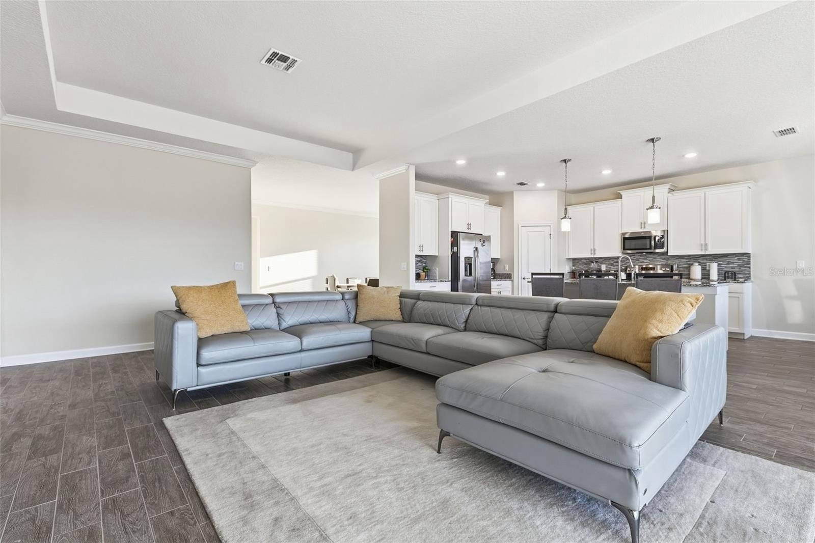The open floorplan creates a seamless flow between the expansive living room and dining room, making the home ideal for entertaining or enjoying quality family time. Natural light fills the space, enhancing the welcoming and airy atmosphere throughout.