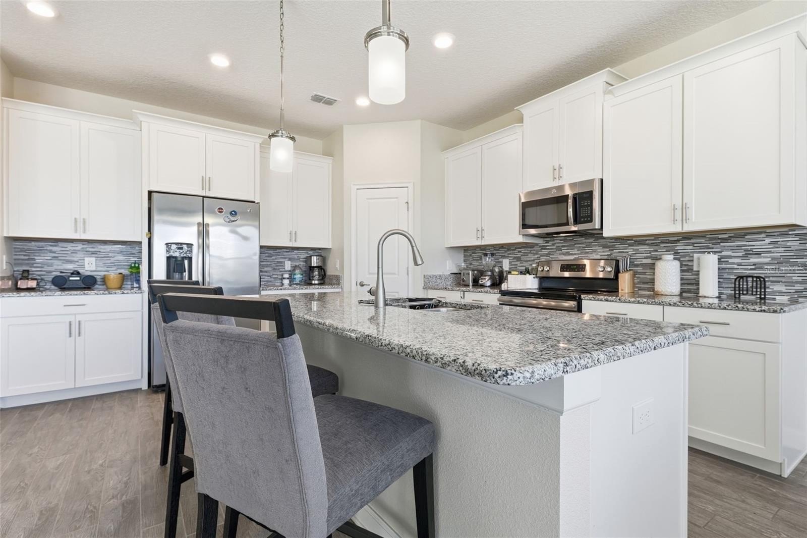 The kitchen is both stylish and functional, showcasing solid wood cabinets, elegant stone countertops, and included appliances. Whether preparing everyday meals or hosting gatherings, this kitchen is designed to impress.