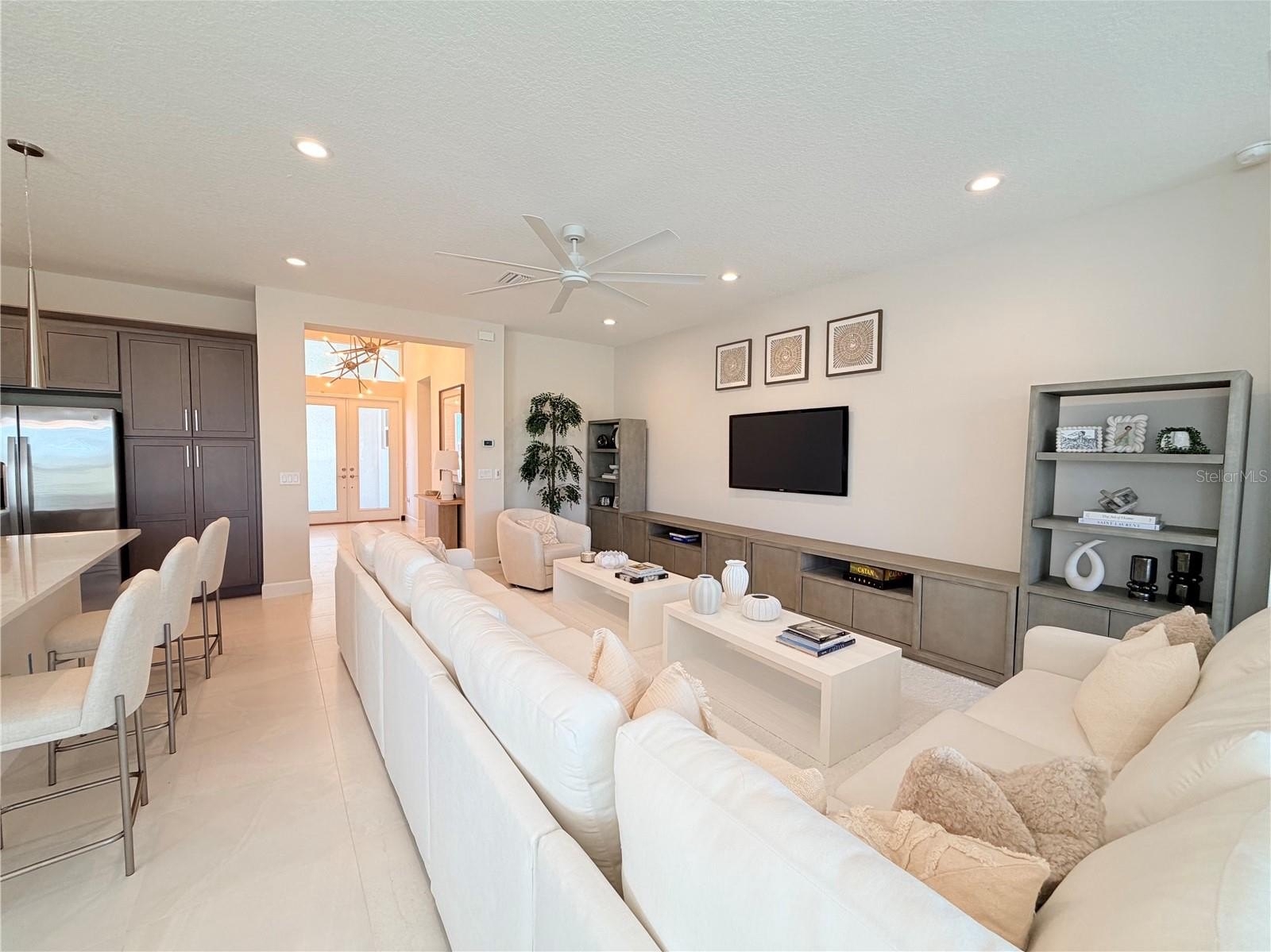 The great room, dining area, and den benefit from an upgraded electrical and lighting package with recessed lighting, designer fixtures, media wiring for concealed TV installation, and additional connectivity throughout the home. Under-cabinet lighting, extra outlets, and multimedia connections enhance everyday convenience.