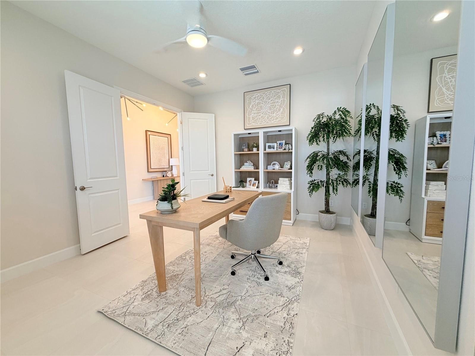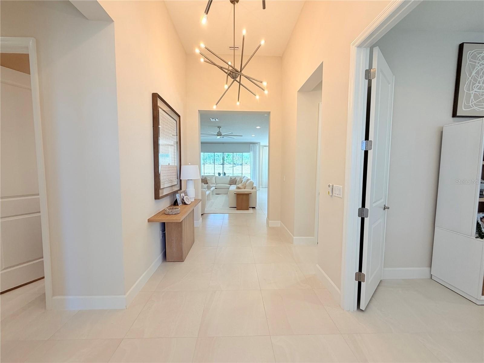 Large-format tile flooring flows throughout the main living areas, den, baths, and laundry, while the bedrooms feature plush carpeting. A variable-speed air handling system with humidity control and Wi-Fi thermostat enhances comfort and efficiency year-round.