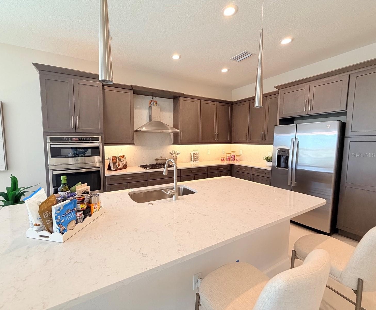 Double full-light glass entry doors welcome you into a bright, open-concept layout filled with natural light, soaring ceilings, and designer-selected finishes. The gourmet kitchen serves as the centerpiece of the home, blending elegance and functionality with quartz countertops and matching backsplash, 42-inch cabinetry with crown molding, soft-close drawers and doors, satin-nickel hardware, and a cabinet pantry conversion for streamlined storage. A large quartz island creates the perfect gathering space for casual dining or hosting. The GE appliance suite includes a built-in gas cooktop, chimney hood vented to the exterior, wall oven and microwave combo, dishwasher, and refrigerator.