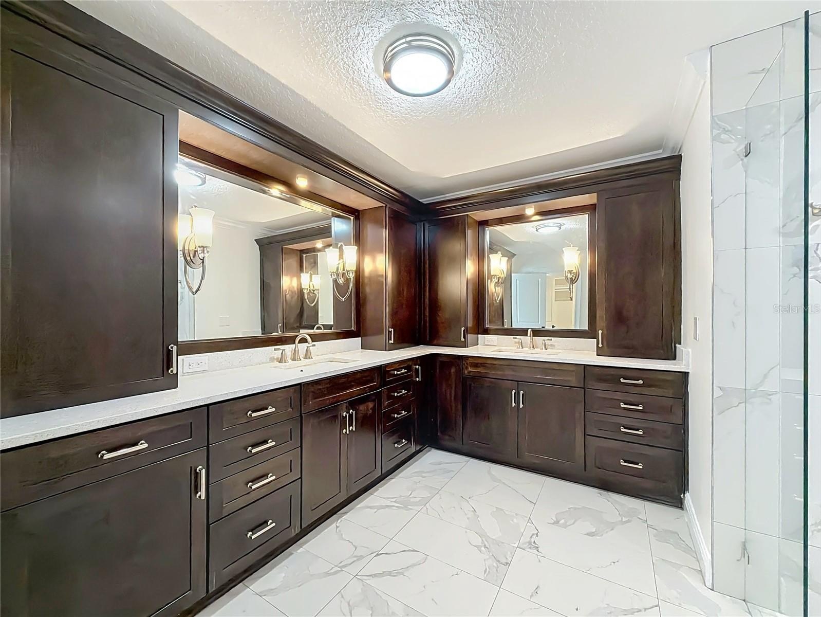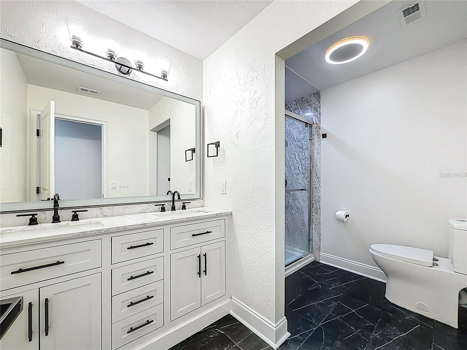 The primary suite upstairs includes a private balcony overlooking the property. The downstairs suite is a true showpiece with a massive double walk in shower that features multiple body jets on each side for a spa level experience. All bathrooms have been updated with modern tile, new vanities, and clean fixtures.