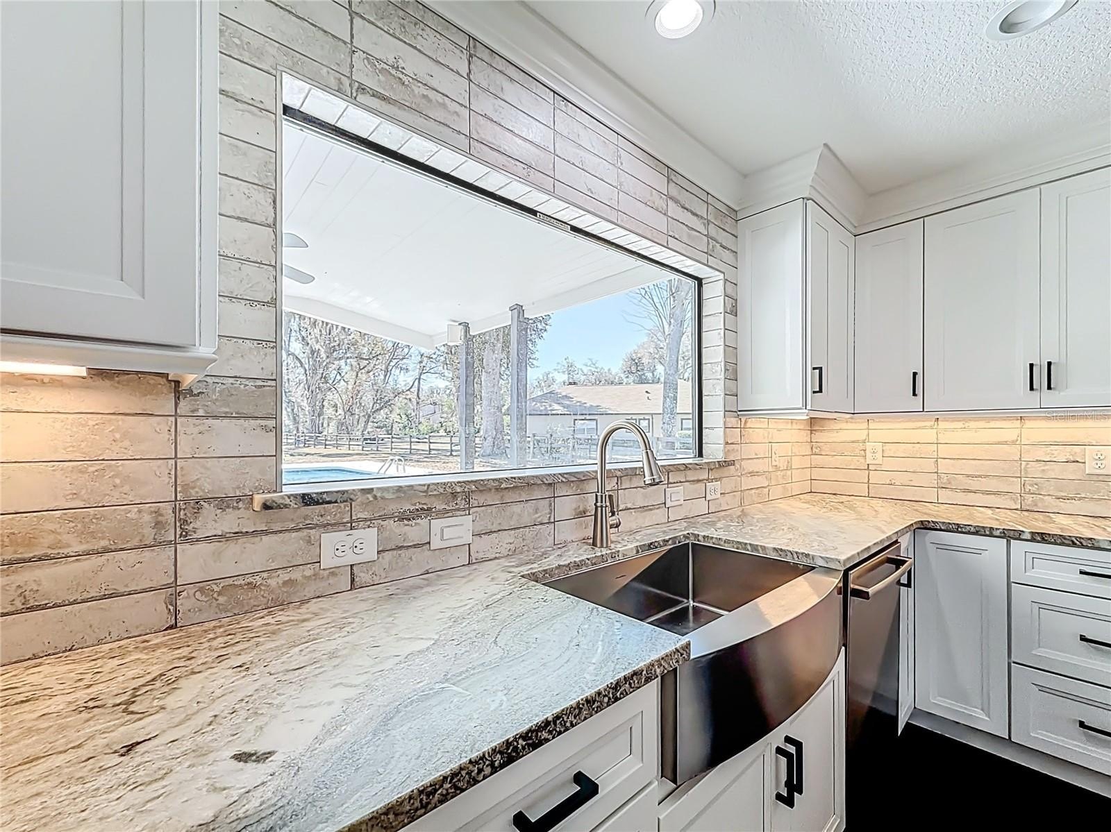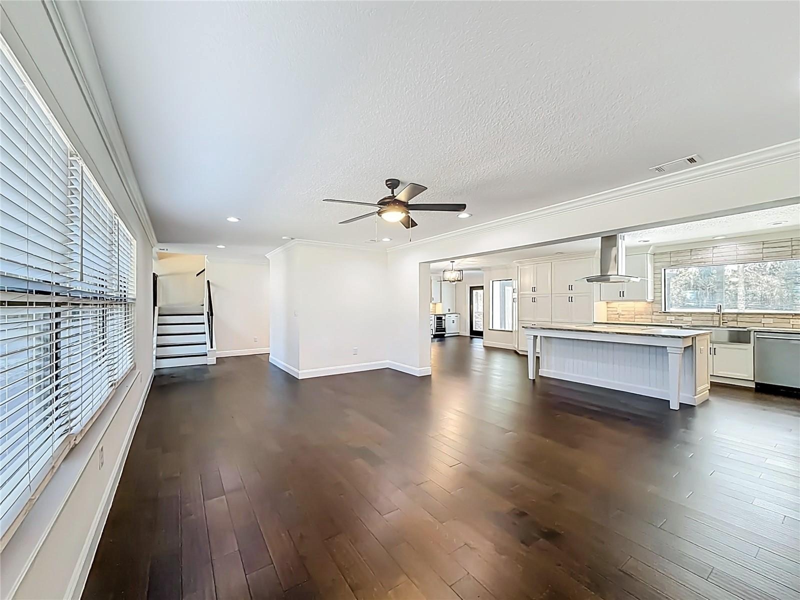 The interior features new flooring, fresh paint, updated lighting, new doors, and an open layout that connects multiple living areas. The kitchen has been redesigned with full height cabinetry, a large island, premium countertops, upgraded appliances, and clear views of the pool and backyard.