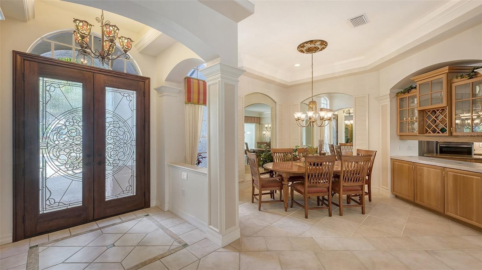 The kitchen is an entertainer’s dream, showcasing rich wood cabinetry, granite countertops, stainless steel appliances, a center island, large walk-in pantry, breakfast bar, and a separate casual dining area. The kitchen opens seamlessly to the inviting family room, highlighted by coffered ceilings, a custom built-in entertainment center and walls of sliding glass doors that flood the space with natural light and offer beautiful views of the outdoor oasis.
