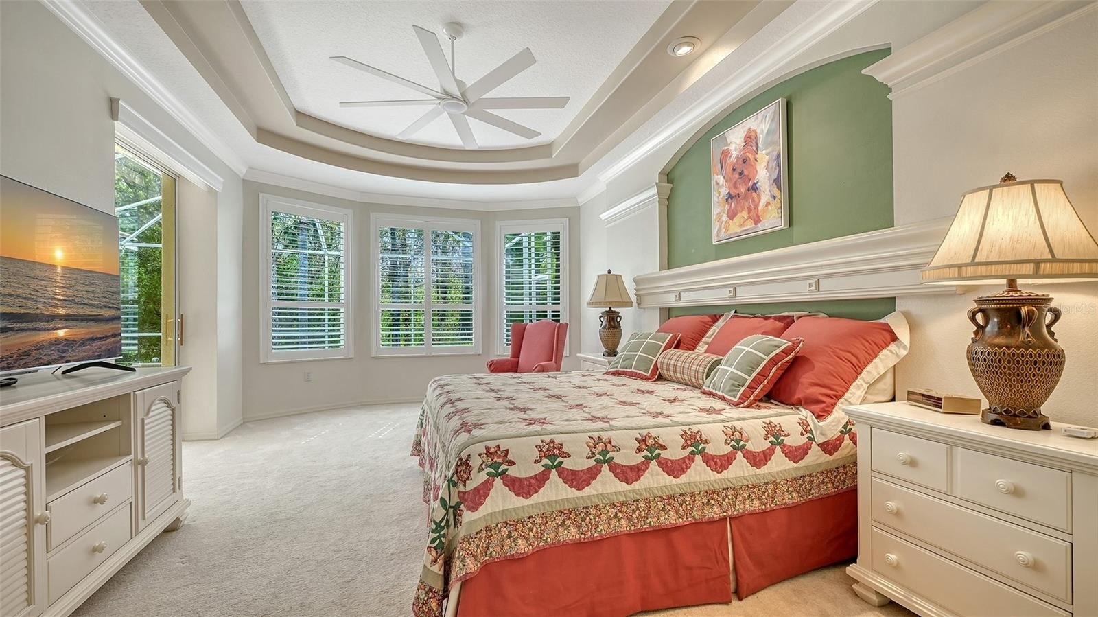 Additional highlights include Crown molding and upgraded trim detail throughout, plantation shutters, 2019 tile roof, high-volume and tray ceilings, red mahogany double leaded glass front door, whole house generator, dual Trane AC systems,