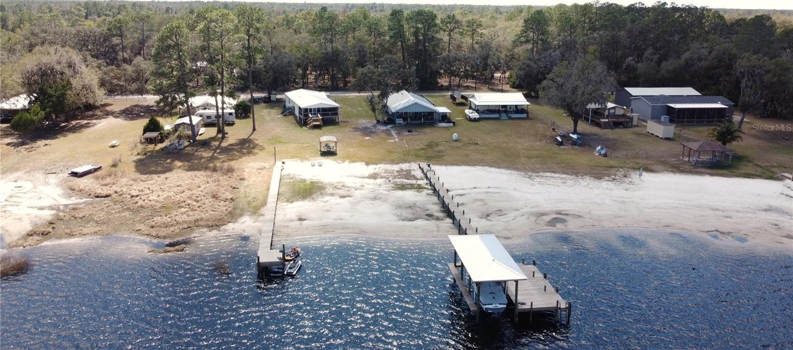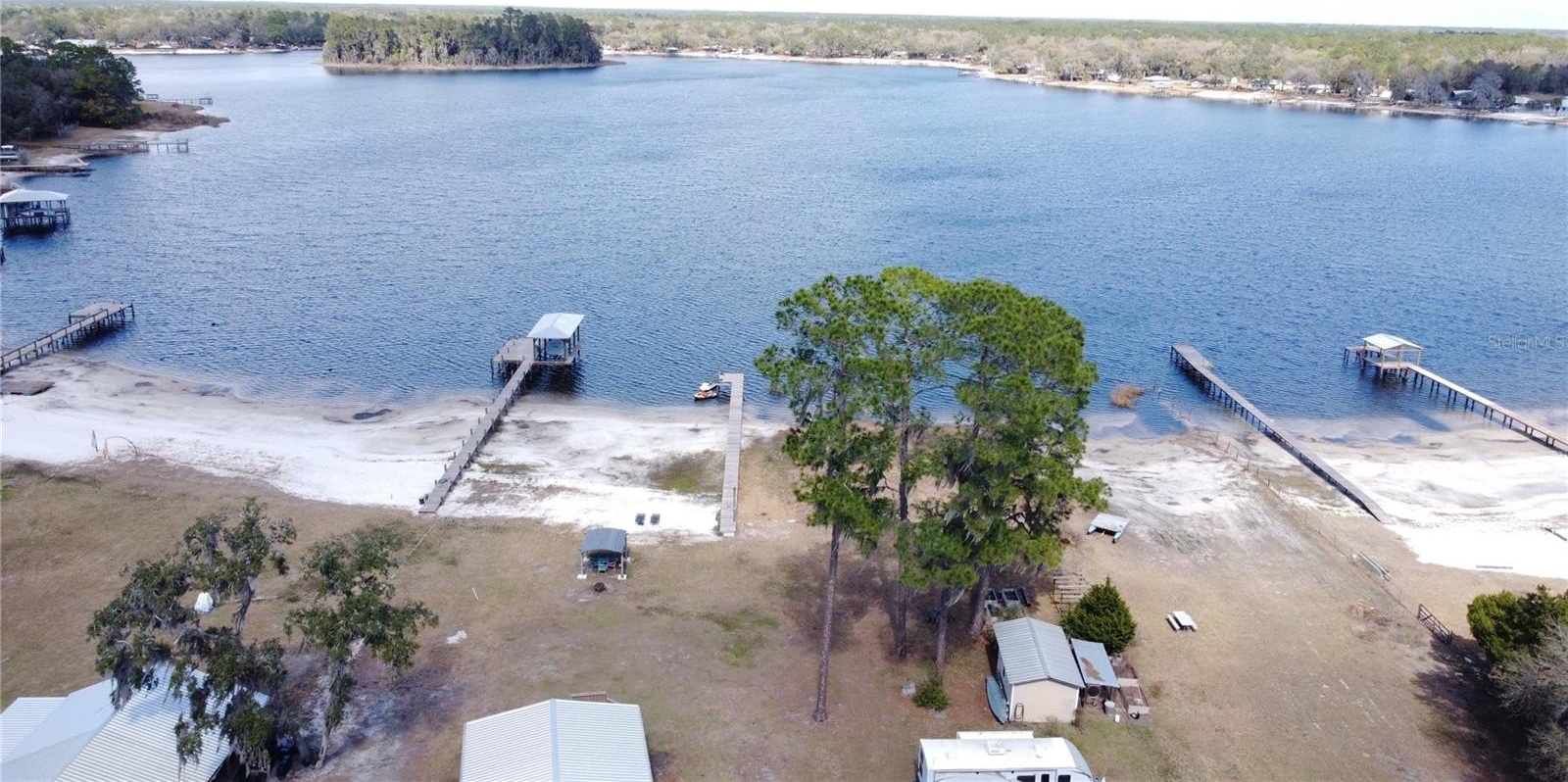 Island Lake Retreat! Come enjoy all that lake life has to offer from your own sandy beach area and private dock on beautiful spring fed Island Lake. This updated 3/2 split plan home features a light and bright kitchen with stainless steel appliances overlooking a very spacious living room. In addition to the 3 bedrooms, there is a versatile bonus room with a walk-in closet and French doors leading to a 16x27 screened porch that overlooks the lake. The primary suite offers a walk-in closet, a double sink vanity and an oversized step-in tiled shower. Additional features include attractive vinyl plank flooring throughout, an inside laundry room, a tiled guest shower, a metal roof and a storage shed. Conveniently located between Ocala, Gainesville and Palatka.