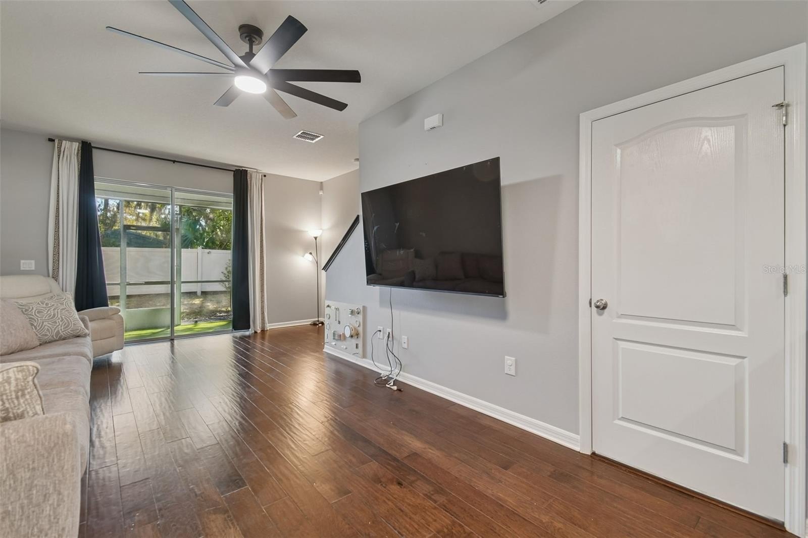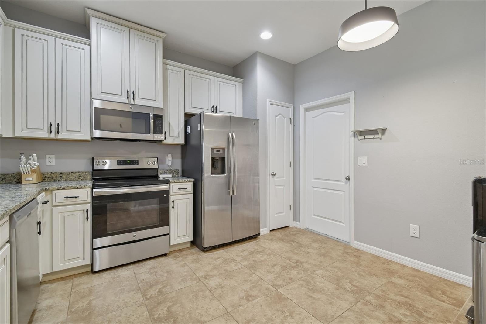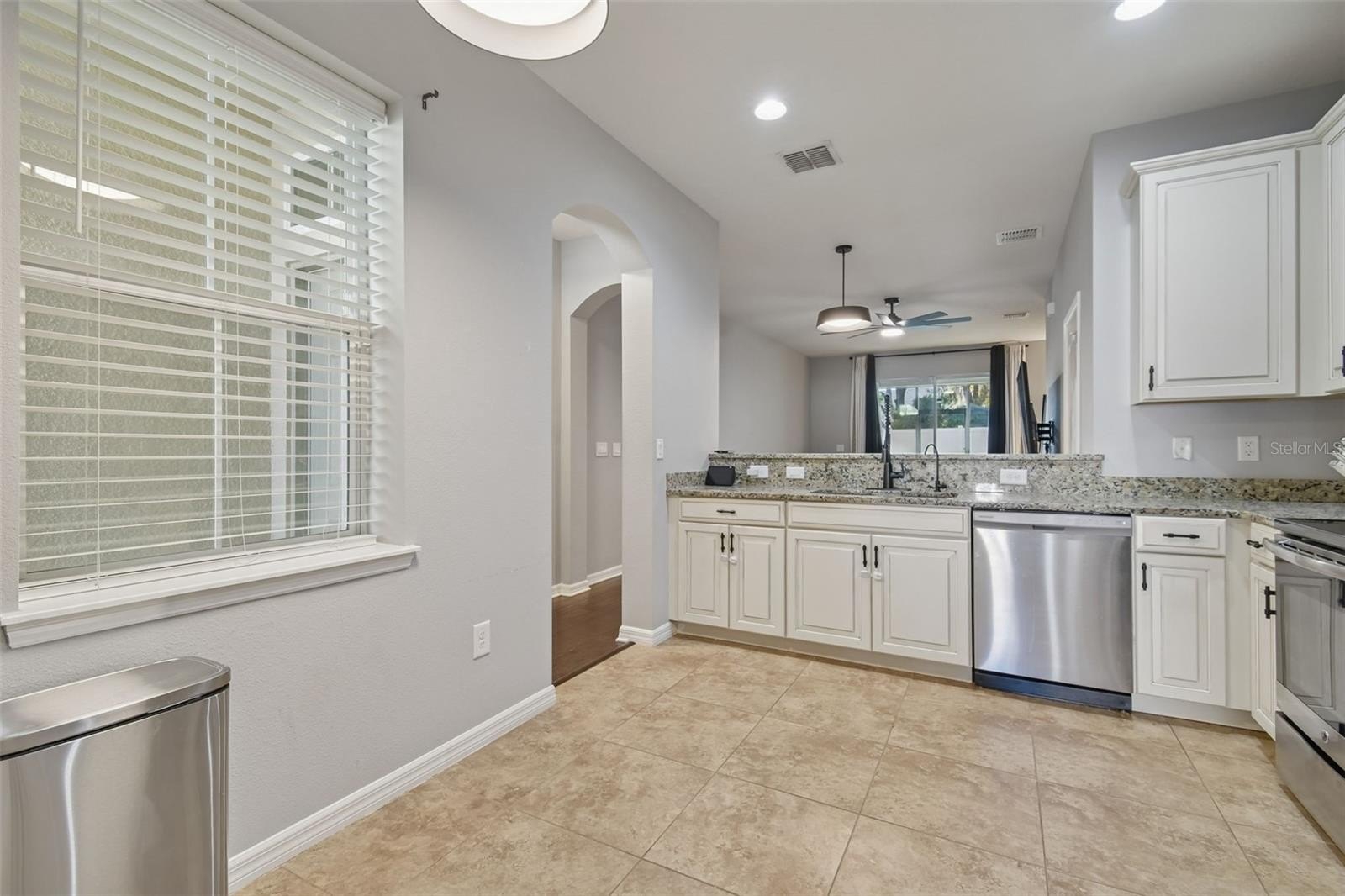 Step inside to a bright and inviting layout designed for everyday living and easy entertaining. The main level features a spacious living and dining room combo that flows seamlessly into the kitchen. The kitchen is well appointed with granite countertops, stainless steel appliances, raised cabinetry, a closet pantry, and a breakfast bar, offering ample workspace and storage. Sliding glass doors lead to a covered, screened rear porch, creating a relaxing space to enjoy morning coffee or unwind in the evenings.