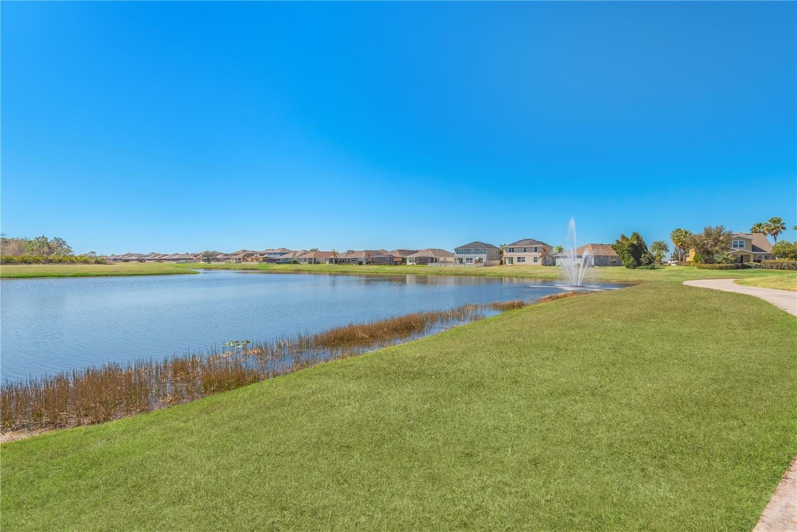 Inside, the open-concept design features premium tile flooring in the main living areas and bathrooms, and a spacious kitchen with granite countertops, a large center island, ample cabinetry, and an oversized walk-in pantry. The living room's standout 3-panel sliding glass doors open wide to create true indoor/outdoor living — perfect for entertaining or relaxing while enjoying the water view. The split-bedroom layout offers three secondary bedrooms with a centrally located full bath, while the oversized primary suite includes a large walk-in closet, dual vanities, a garden tub, and a separate shower. New interior and exterior paint and new carpet in the bedrooms make this home truly turnkey. Located in a community known for resort-style amenities including a pool, splash pad, playground, walking trails, dog park, basketball courts, and open green space. Zoned for desirable schools, with convenient access to US-301 and I-75 for an easy Tampa commute. This home won't last long! Schedule your showing today!!
