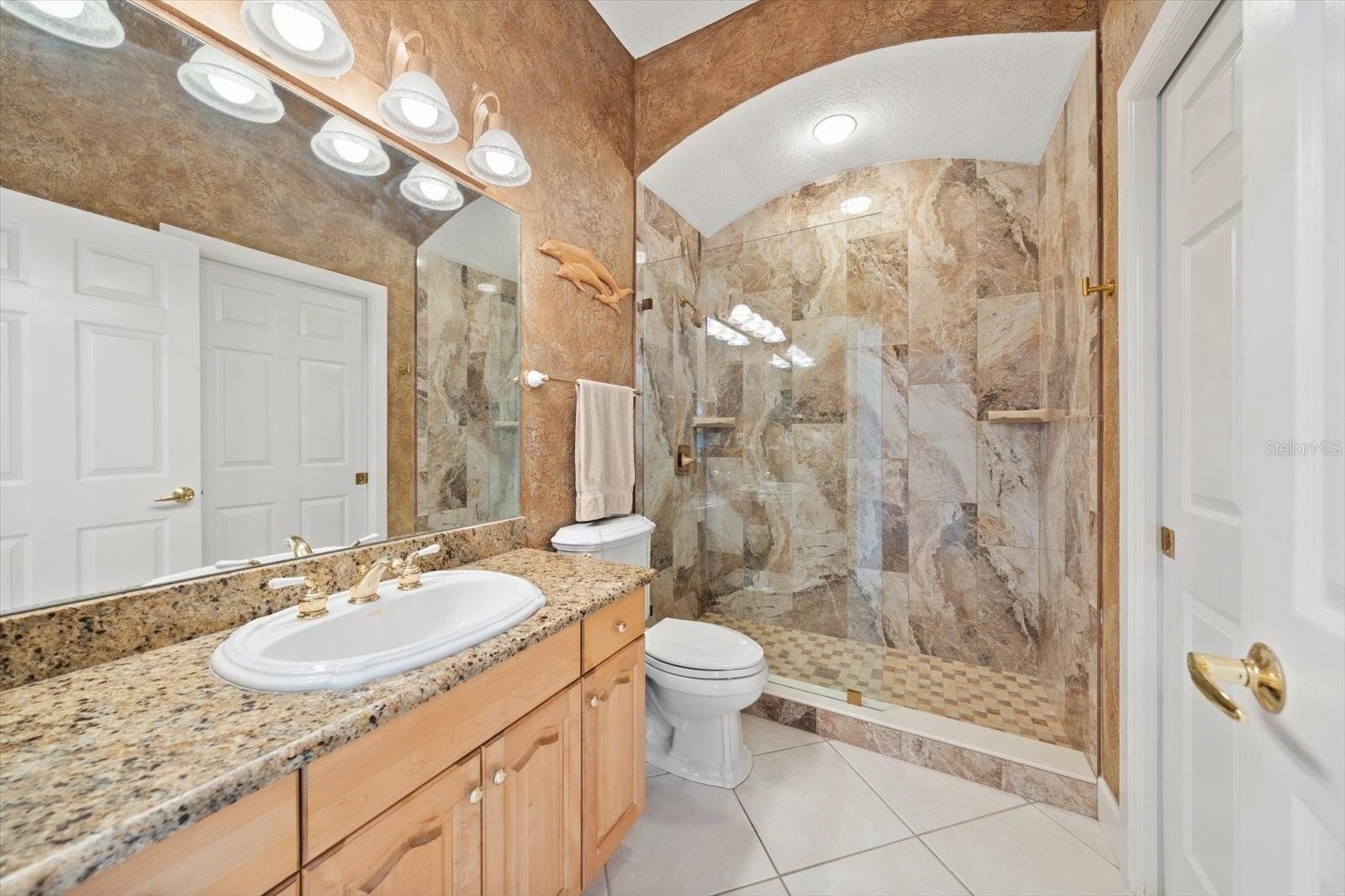 The primary suite serves as a relaxing retreat with double-door entry, coffered ceiling, lanai access, and a spa-style ensuite offering dual sinks with granite countertops, built-in vanity, walk-in shower, separate water closet, and jetted tub beneath a bay window.